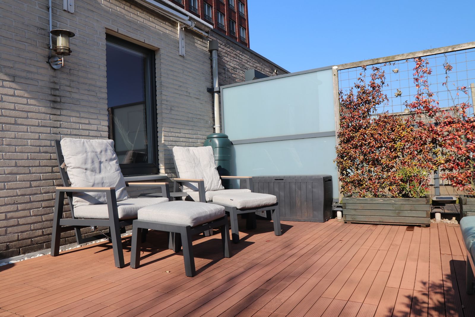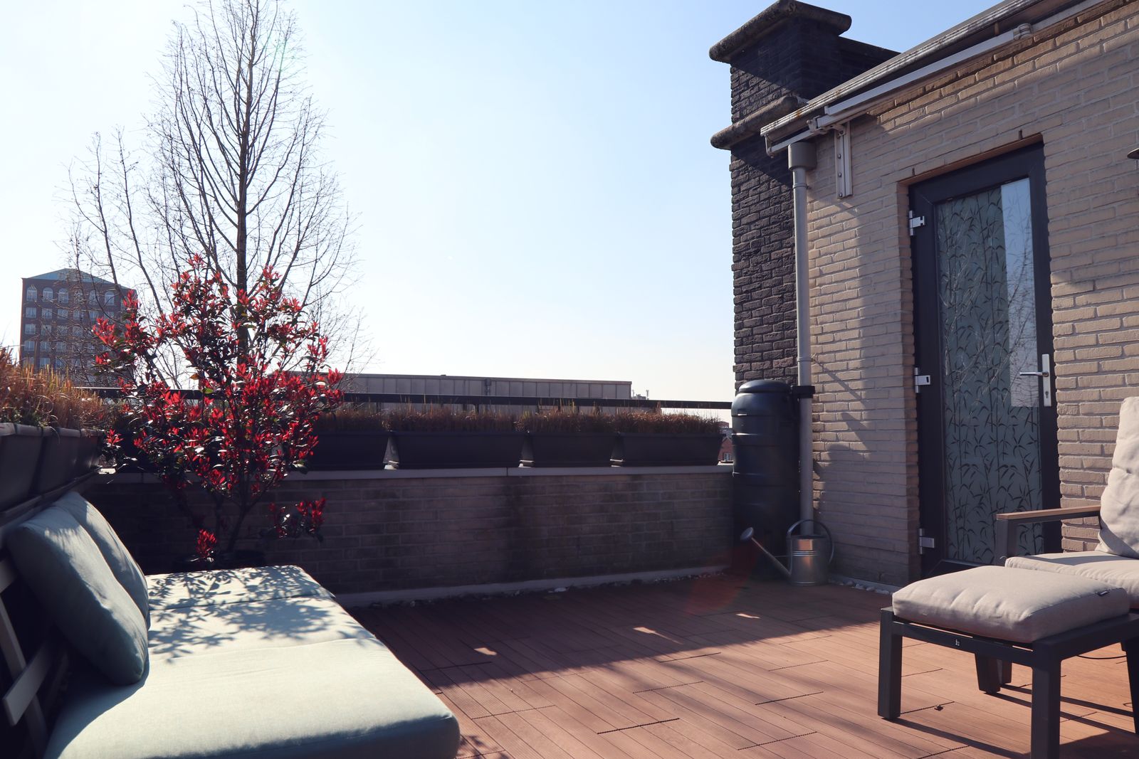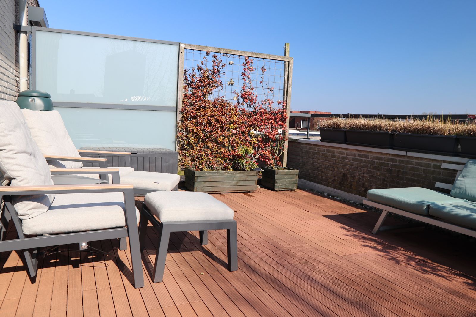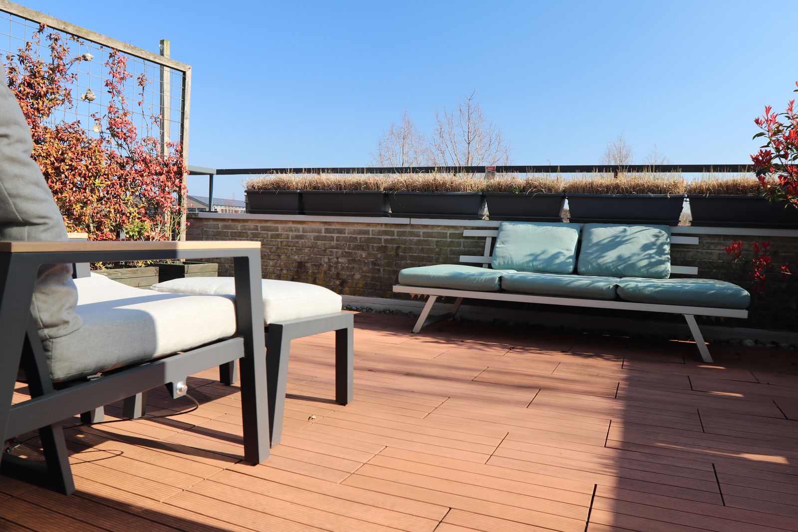En dan het dakterras gelegen op het zuid-oosten, belegd met vlonder (composiet) en voorzien van groene border en Jasmijn-afscheiding! Een heerlijke plek om te ontspannen en de hele dag te kunnen genieten van de zon, met een mooi uitzicht over de tuin en wijk. Of je nu van een rustig ontbijtje in de ochtend houdt of ’s avonds met een drankje de dag afsluit, dit is zo'n plek waar je ook echt lekker zit.