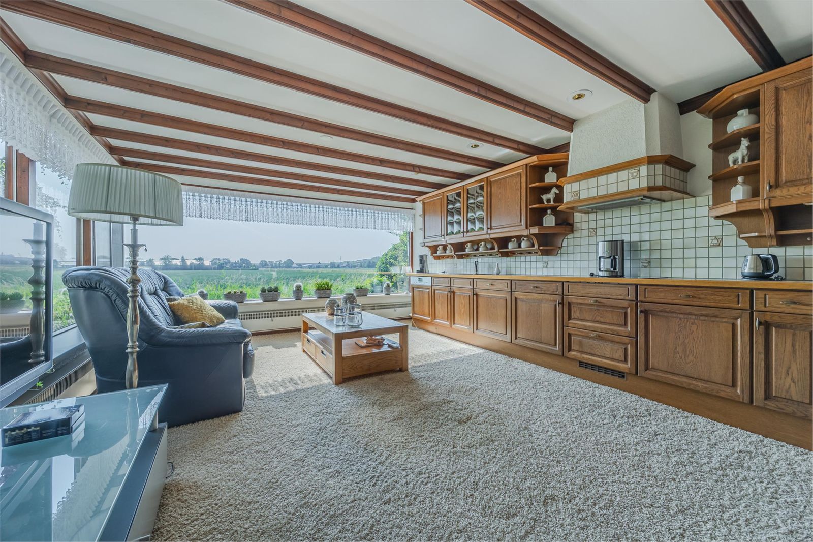 De woonkamer is voorzien van een sfeervolle gas-openhaard en grote raampartijen rondom, waardoor u optimaal geniet van het prachtige uitzicht.