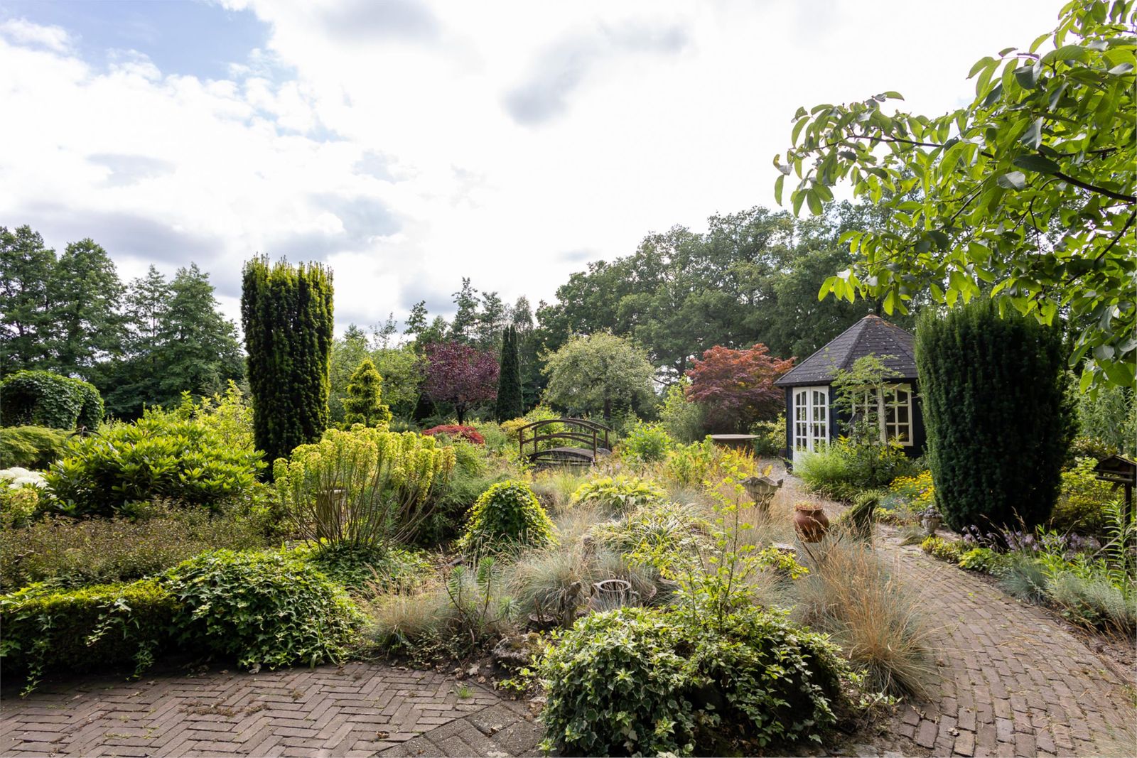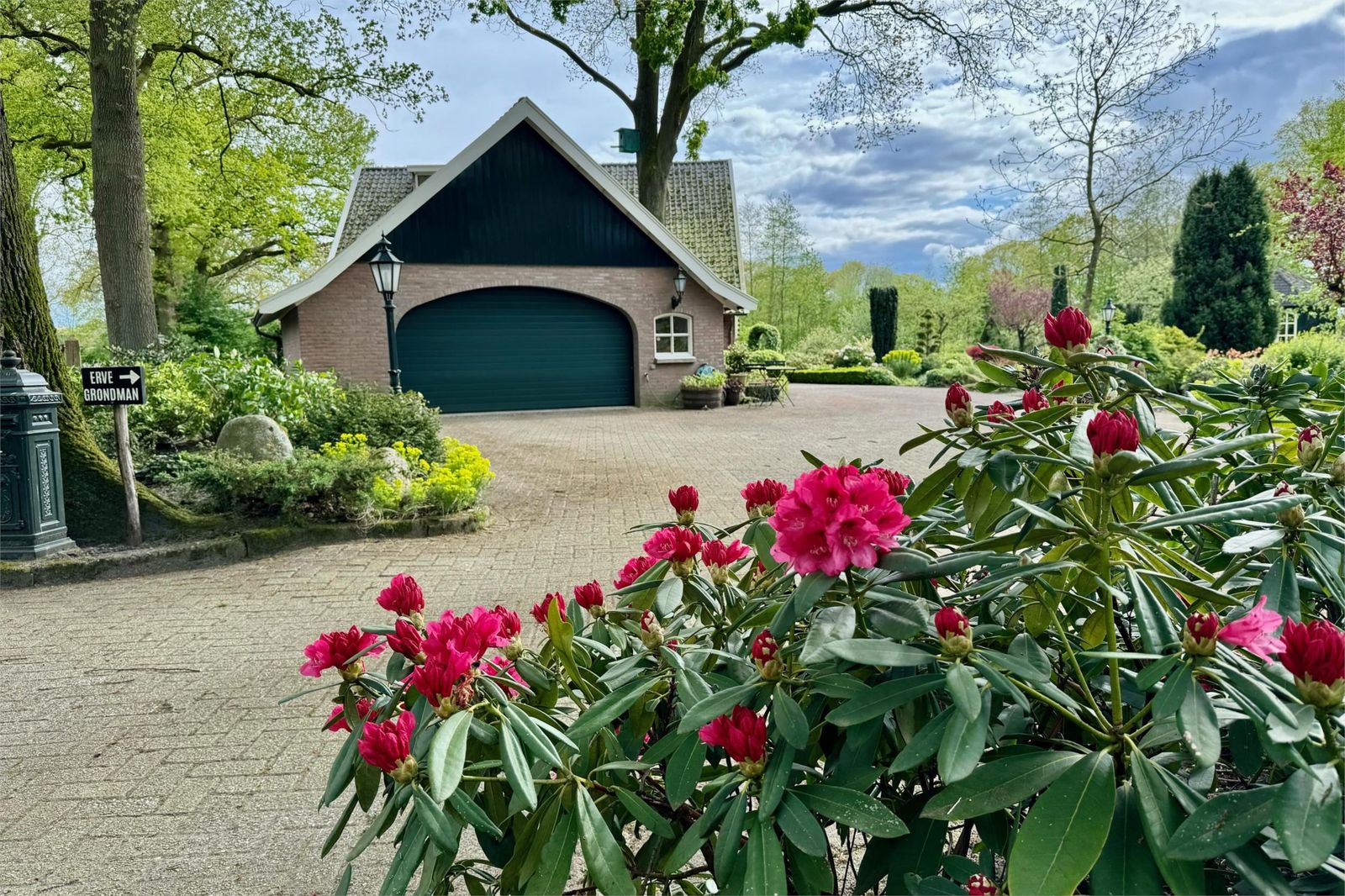 met een zeer grote aangelegde parkachtige tuin, met vijver en tuinhuis, weiland en een grote garage geschikt voor 2 auto’s.