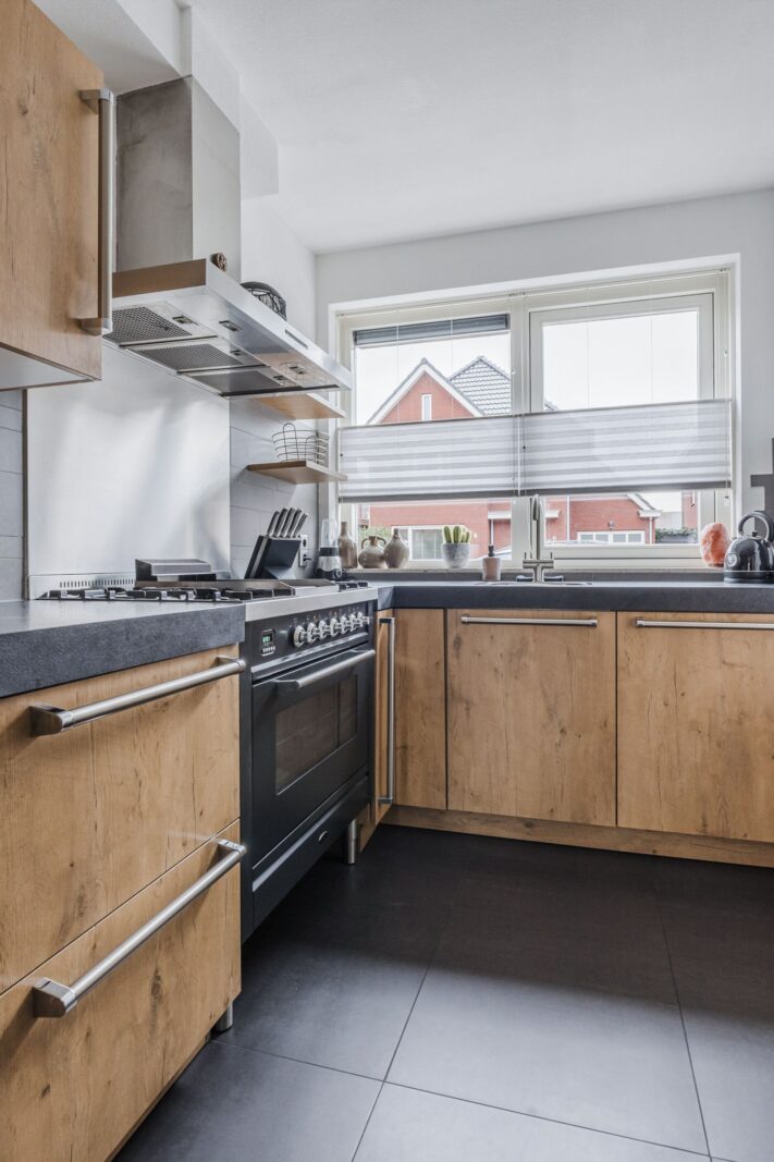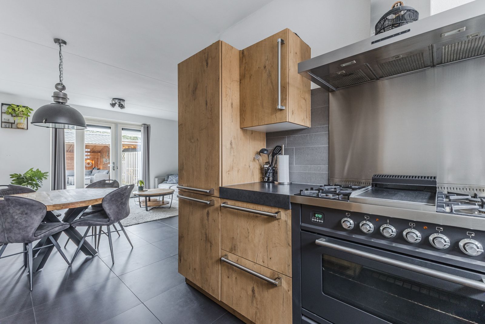 De tuingerichte woonkamer is voorzien van een moderne plavuizenvloer met comfortabele vloerverwarming. Aan de voorzijde van de woning bevindt zich de open L-vormige keuken met diverse inbouwapparatuur, waaronder een koel-/vriescombinatie, magnetron, vaatwasser en een robuuste Boretti oven met 5-pits gasfornuis.