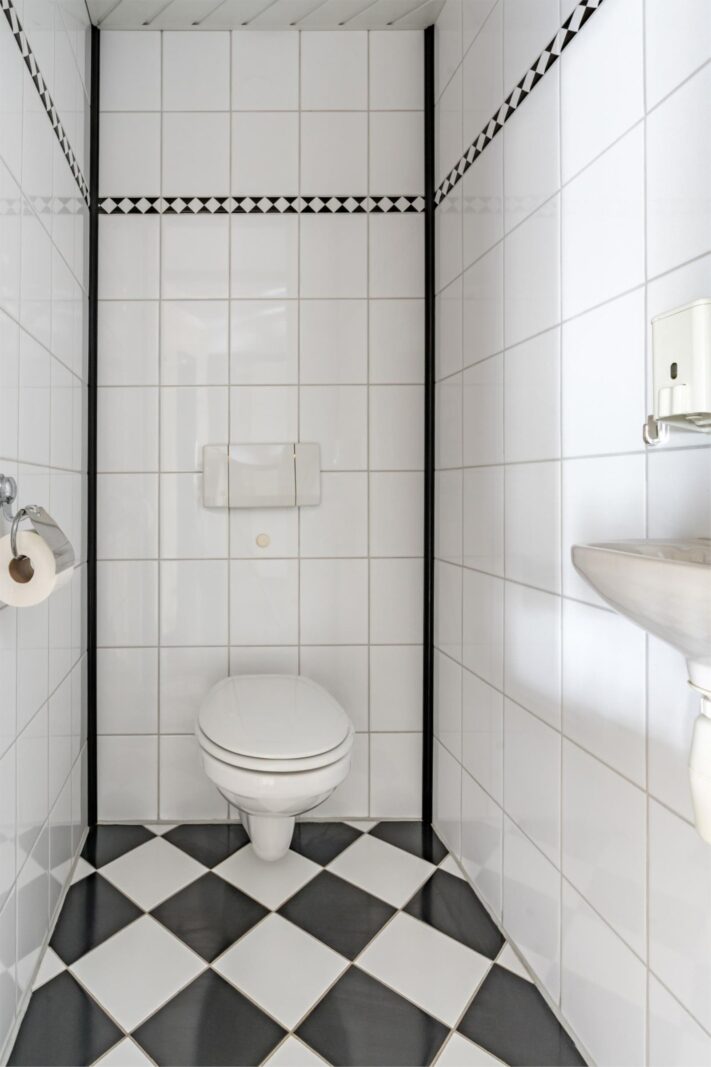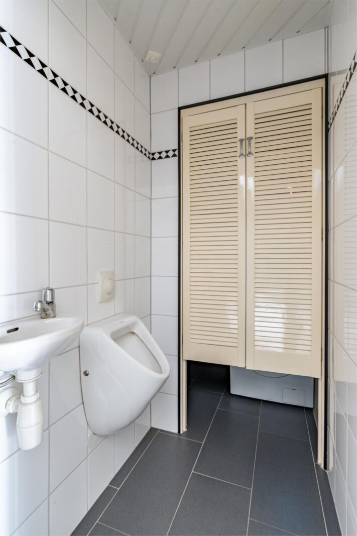 •In de hal bevindt zich de trap naar de eerste verdieping en een betegeld dames en heren toilet met apart heren hangurinoir.