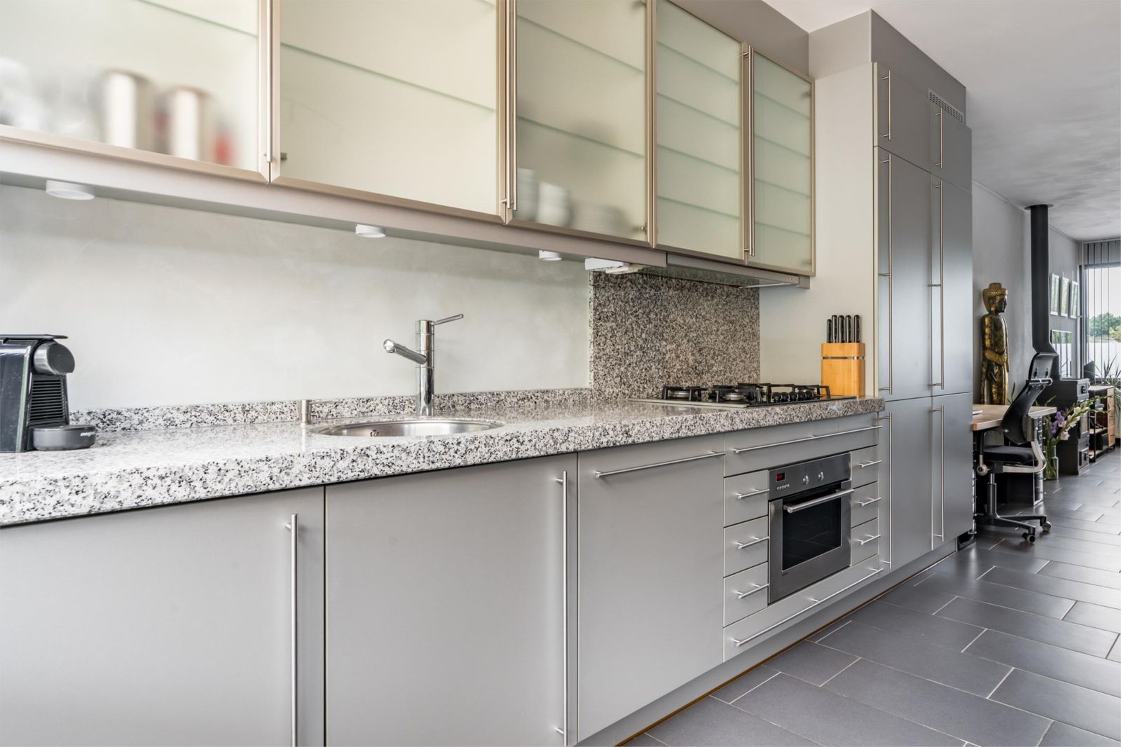 •De keuken heeft een granieten werkblad en boven- en onderkasten.