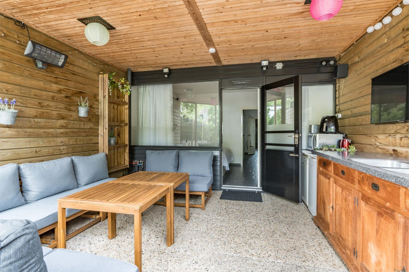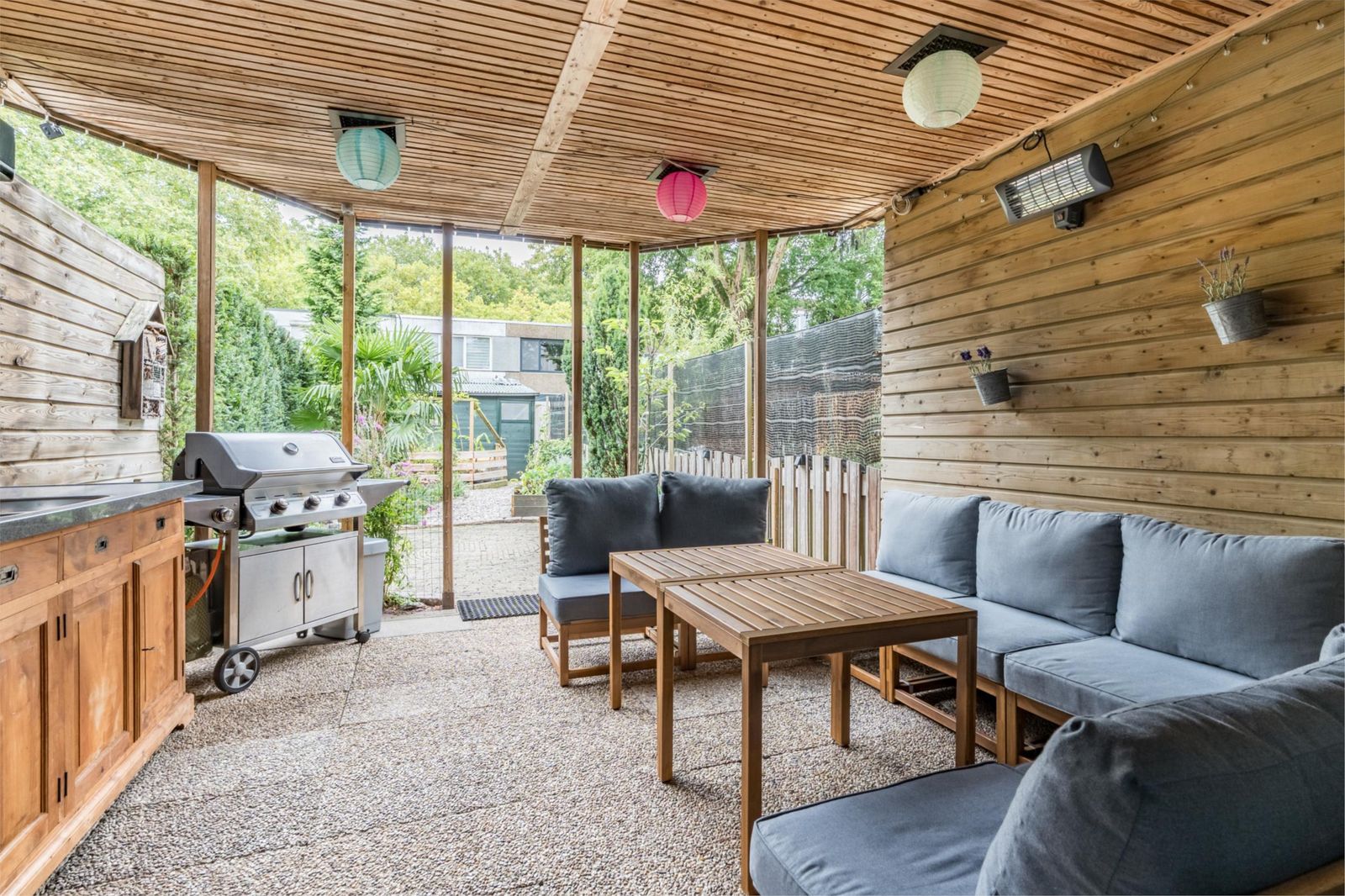 •In de achtertuin bevindt zich onder het balkon/overkapping een zitruimte met elektrapunten en ingebouwde plafondverlichting.