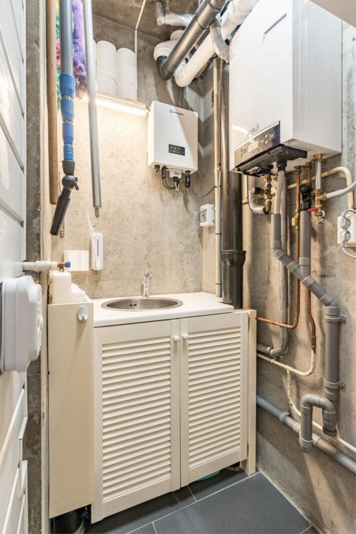 •Cv-ruimte met cv-combiketel, omvormer voor zonnepanelen, en ruimte voor wasmachine en droger, een wasbak met mengkraan en kastruimte.