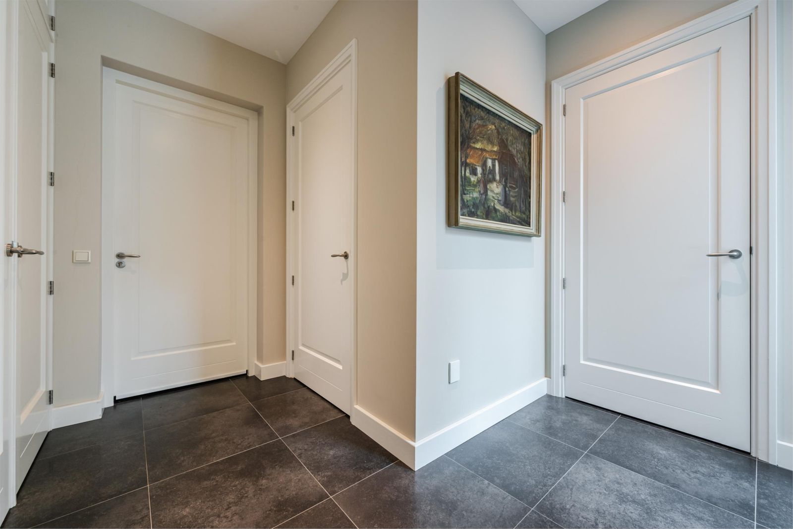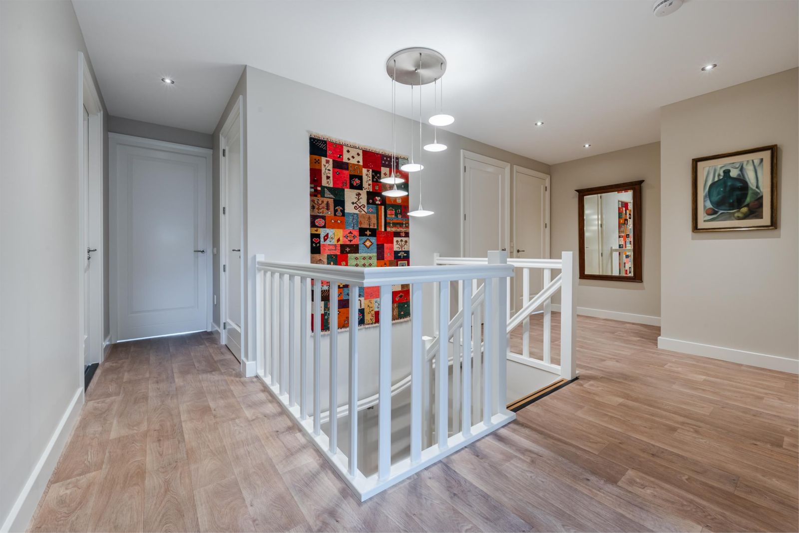 De overloop biedt toegang tot vier slaapkamers, waarvan drie royaal en één wat kleiner. Daarnaast zijn er twee grote inbouwkasten, een met aansluiting voor wasmachine. Een apart toilet en een badkamer. Eén slaapkamer is voorbereid met verborgen aansluitingen voor een keukenblok, wat deze verdieping flexibel maakt voor bijvoorbeeld een studio of tweede woonunit.