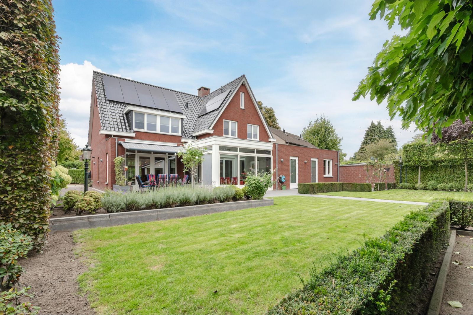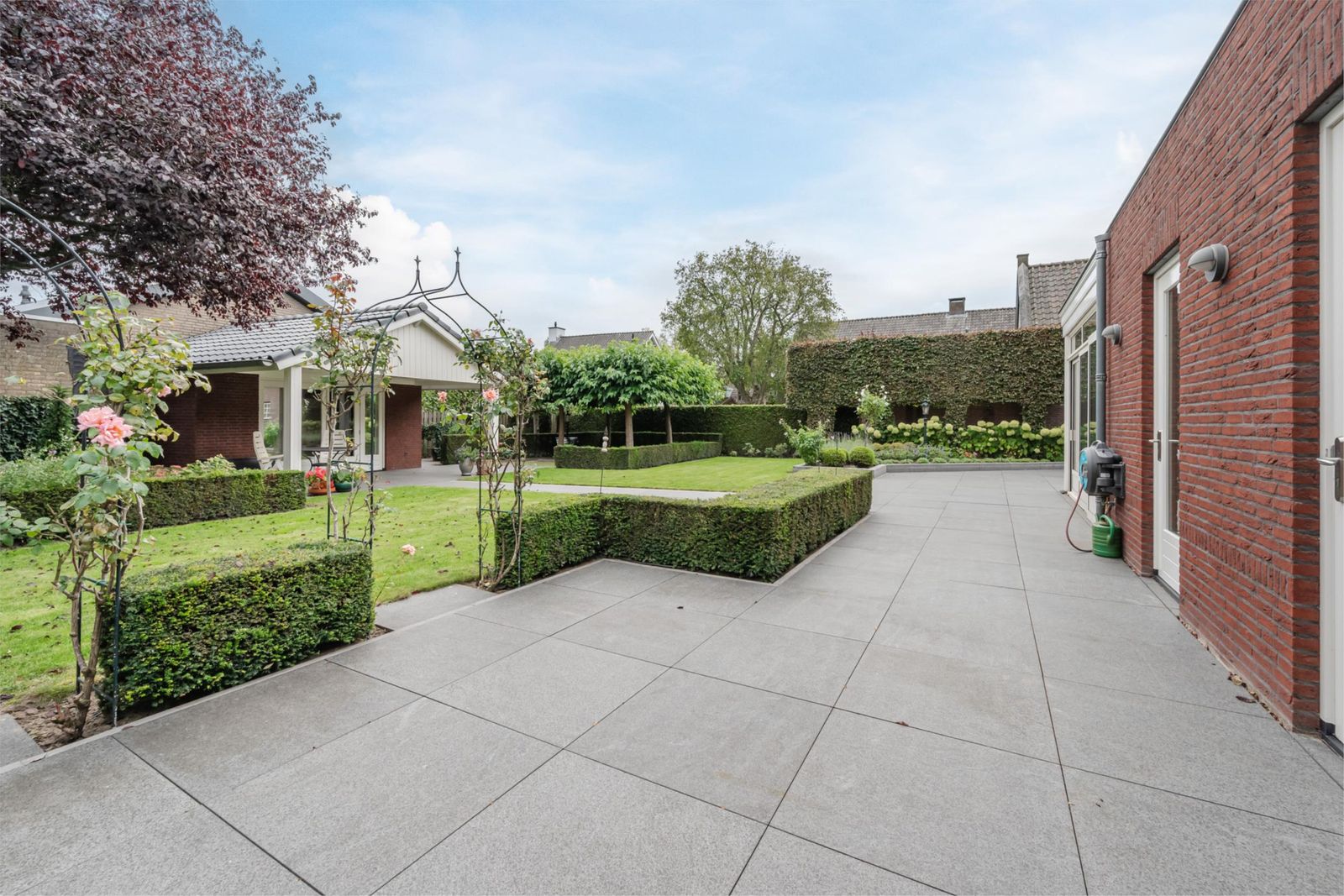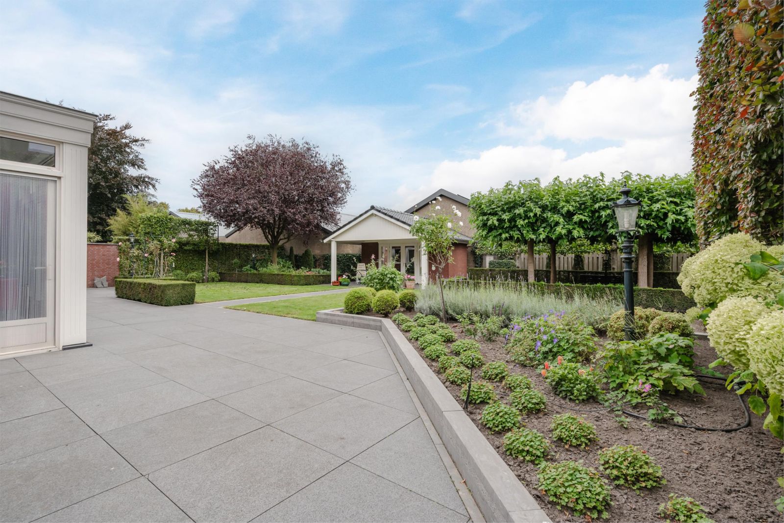 De woning wordt omringd door een perfect aangelegde tuin met computergestuurde beregening. Aan beide zijden van de woning is een inrit, beide voorzien van een elektrische poort. Links bevindt zich een oprit met carport naar de garage/berging. Rechts is een royale oprit, breed genoeg om met de auto of aanhanger achter de woning te komen. De achtertuin is sfeervol ingericht en volledig aangelegd met meerdere zithoeken: Vanuit de woonkamer is het terras ook via tuindeuren te bereiken. Een elektrisch luifel zorgt voor een aangename zithoek. Onder de vier moerbeibomen is een beschutte koele plek gecreëerd waar tevens jeu de boules gespeeld kan worden, perfect voor zon én schaduw. Op het grasveld is ruimte genoeg voor een goaltje en een partijtje voetbal. Het terras aan de voorzijde van het tuinhuis heeft een overkapping. Een geschikte ruimte voor een tuinkeuken.