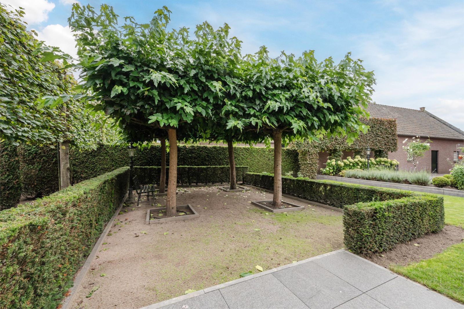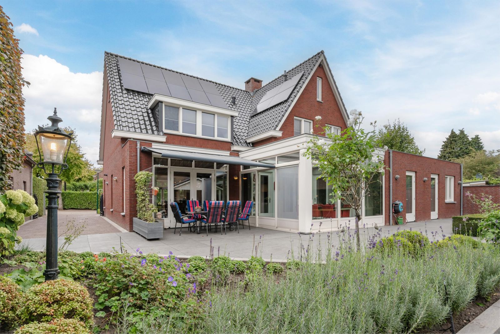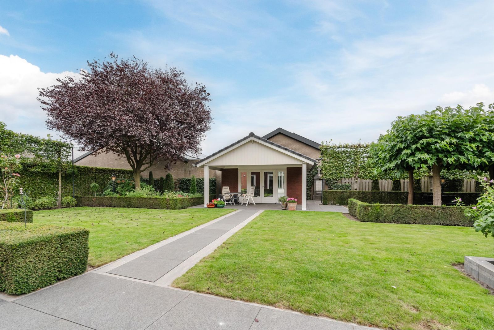 De woning wordt omringd door een perfect aangelegde tuin met computergestuurde beregening. Aan beide zijden van de woning is een inrit, beide voorzien van een elektrische poort. Links bevindt zich een oprit met carport naar de garage/berging. Rechts is een royale oprit, breed genoeg om met de auto of aanhanger achter de woning te komen. De achtertuin is sfeervol ingericht en volledig aangelegd met meerdere zithoeken: Vanuit de woonkamer is het terras ook via tuindeuren te bereiken. Een elektrisch luifel zorgt voor een aangename zithoek. Onder de vier moerbeibomen is een beschutte koele plek gecreëerd waar tevens jeu de boules gespeeld kan worden, perfect voor zon én schaduw. Op het grasveld is ruimte genoeg voor een goaltje en een partijtje voetbal. Het terras aan de voorzijde van het tuinhuis heeft een overkapping. Een geschikte ruimte voor een tuinkeuken.
