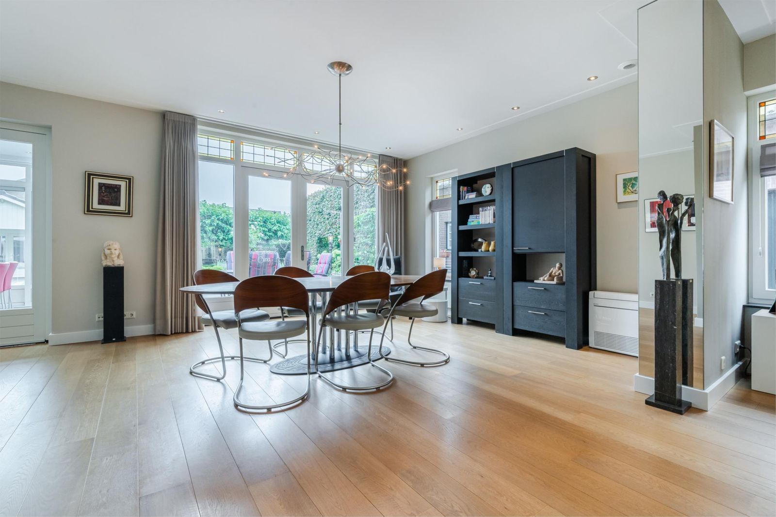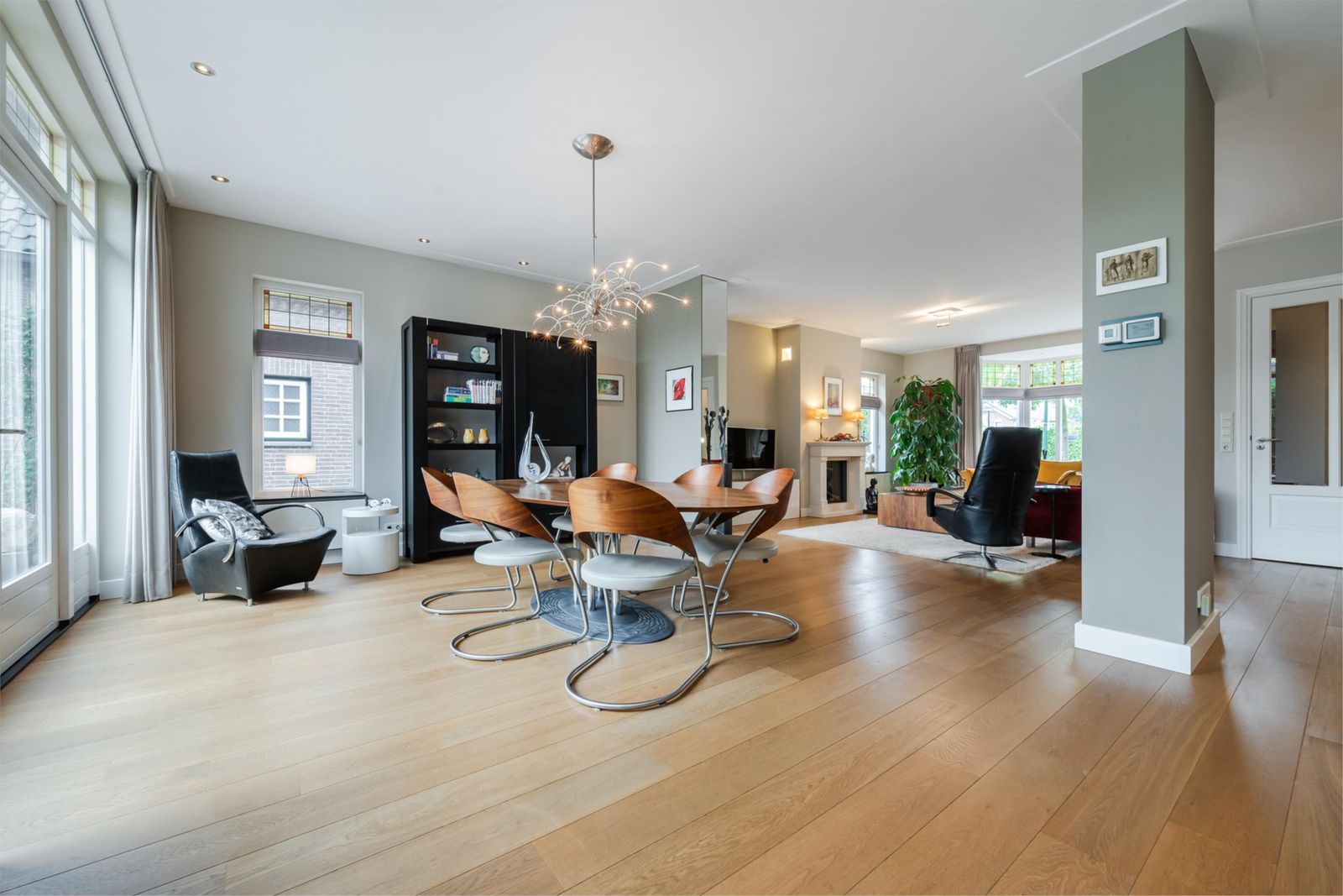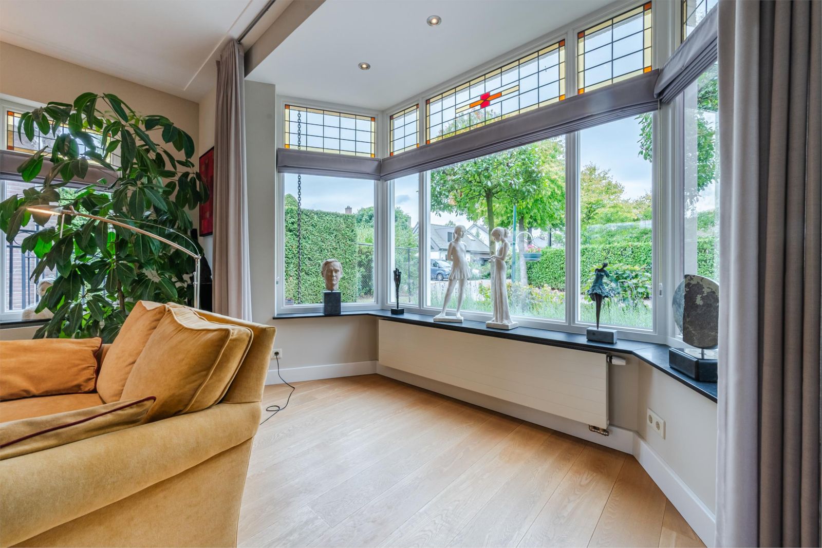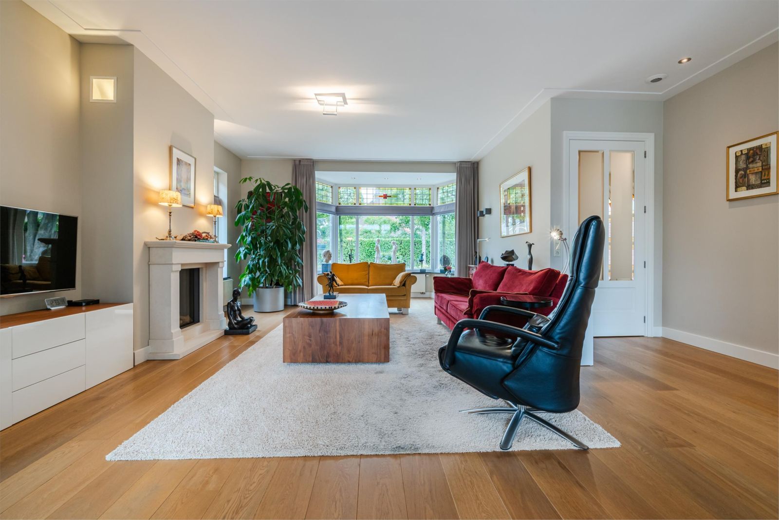 De royale woonkamer heeft een fraaie erker aan de voorzijde met uitzicht over de straat. De ruimte is sfeervol ingericht met een gashaard, inbouwspotjes, verlichting in de schouw en mooie parketvloer. Grote raampartijen en tuindeuren zorgen voor veel lichtinval, terwijl subtiel glas-in-lood boven de ramen extra charme geeft. De woonkamer is voorzien van een airco voor koeling in de zomer en verwarming in de winter. De buitenunit staat vrij van het huis met ondergrondse leidingen.