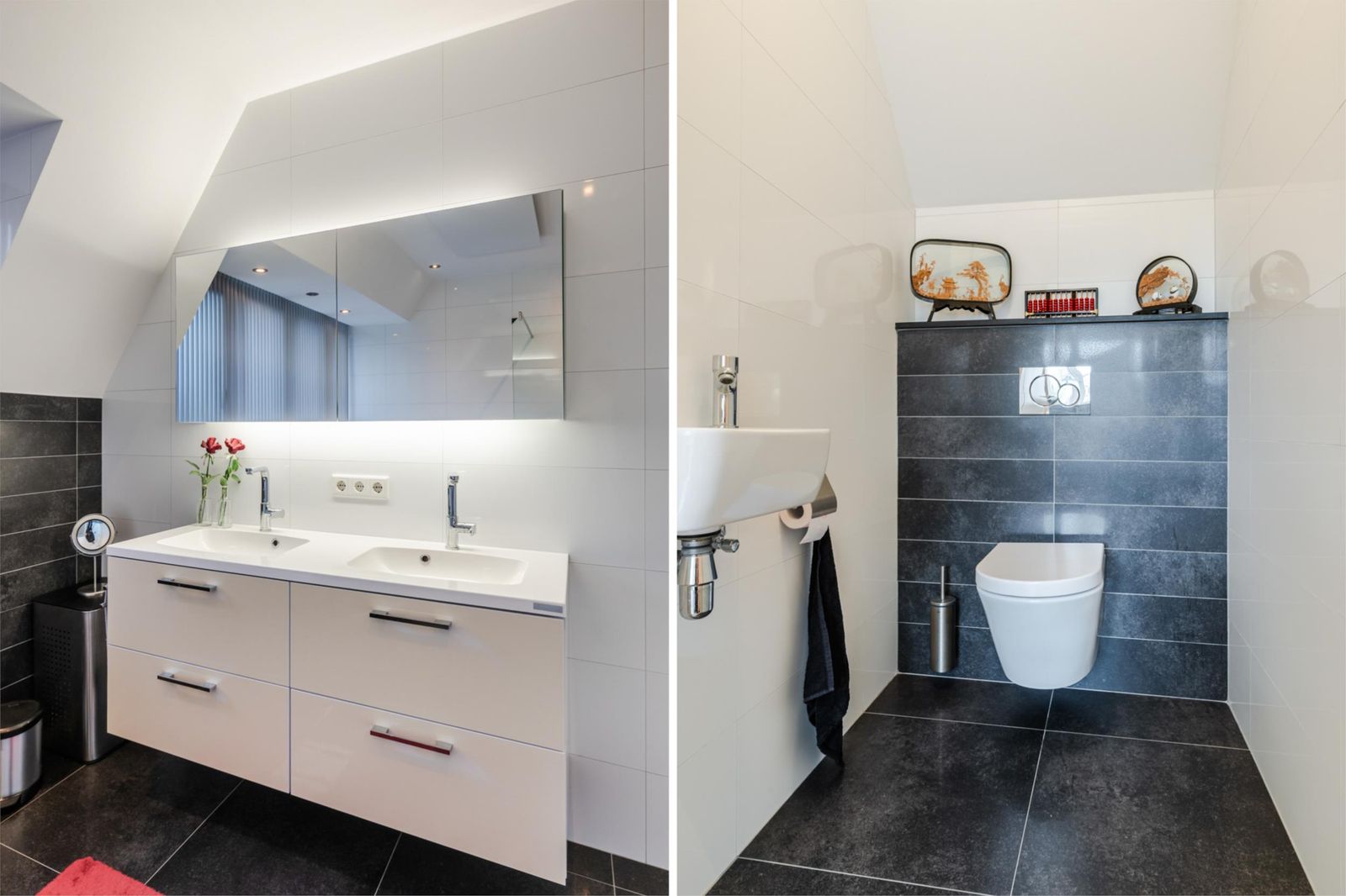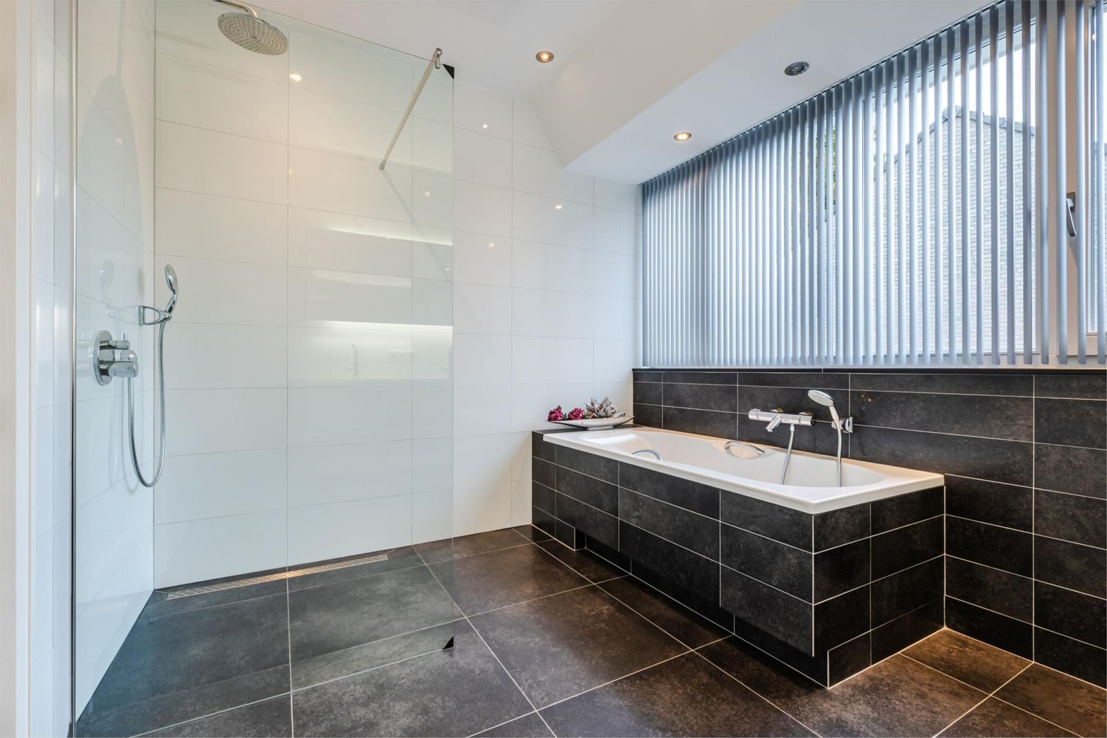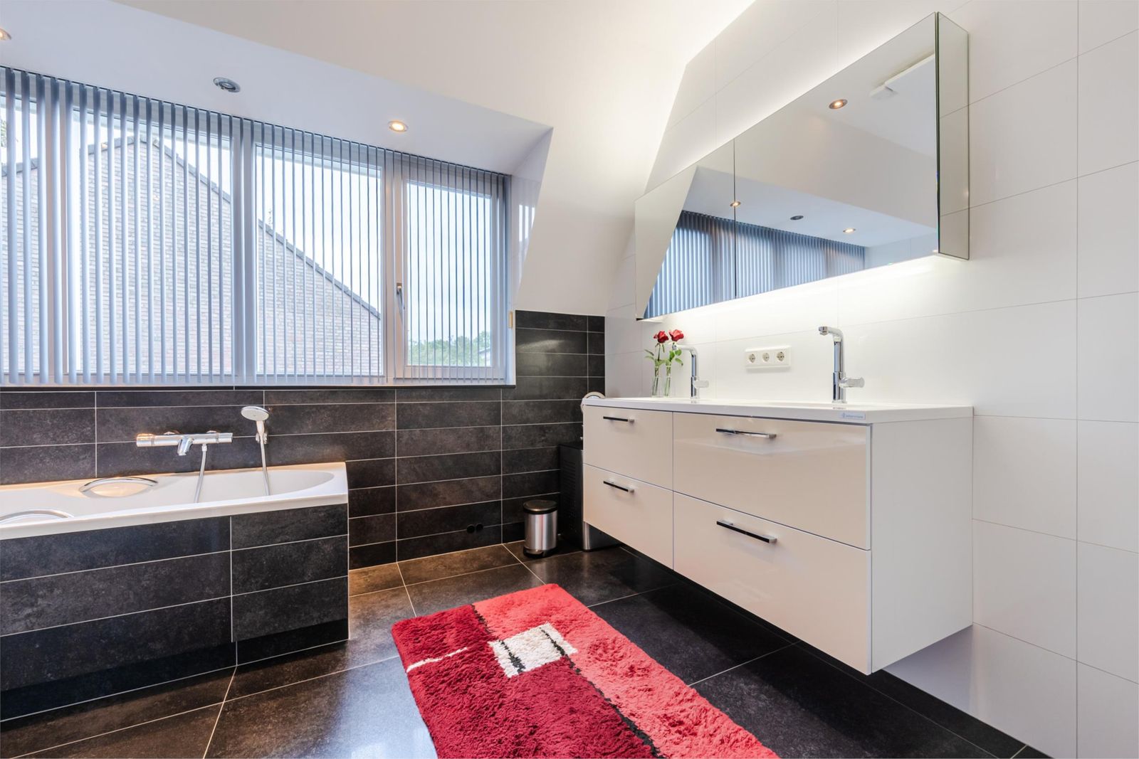 De ruime badkamer is ingericht met een ligbad, douche en dubbele wastafel met spiegelkast en maakt een verzorgde indruk.