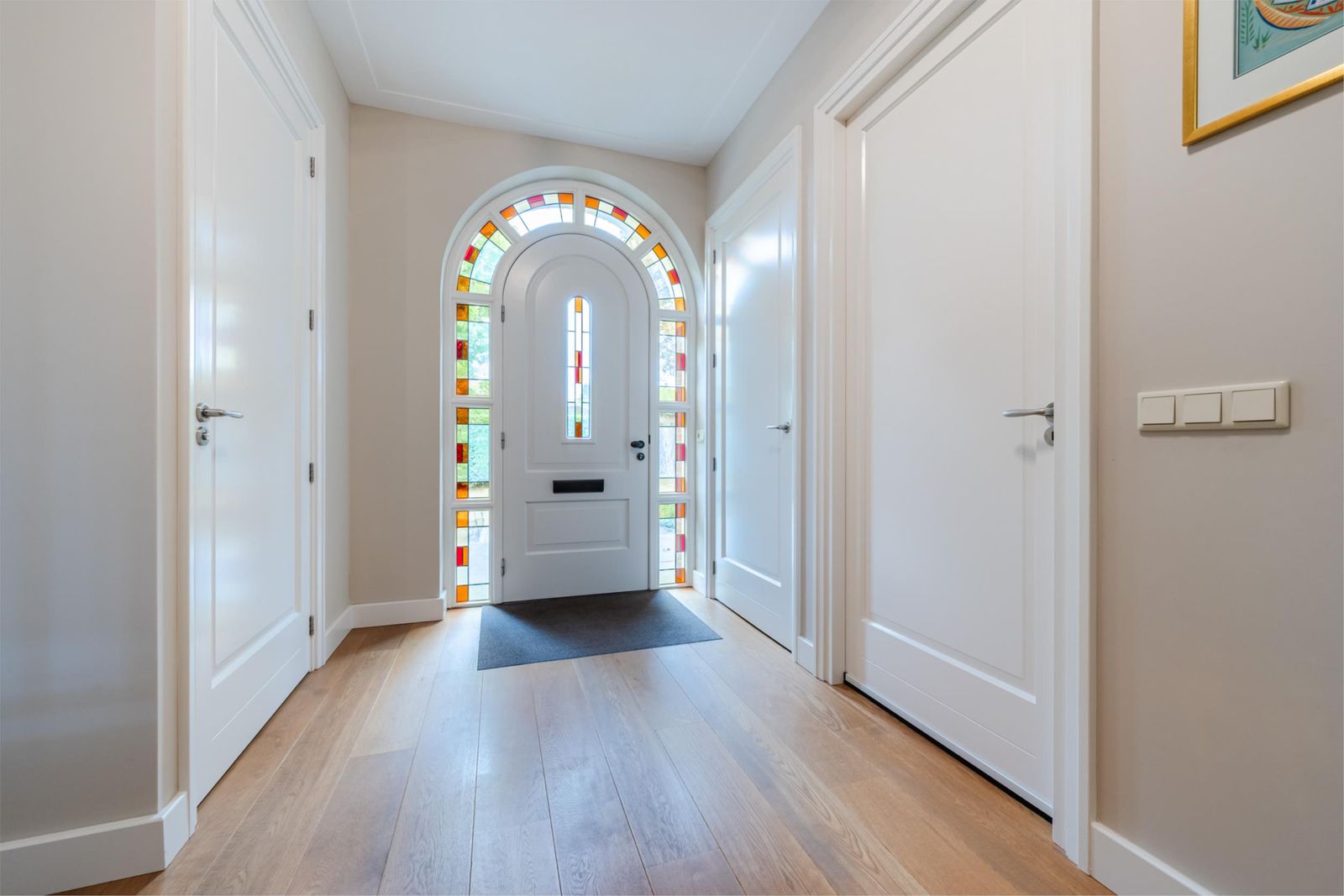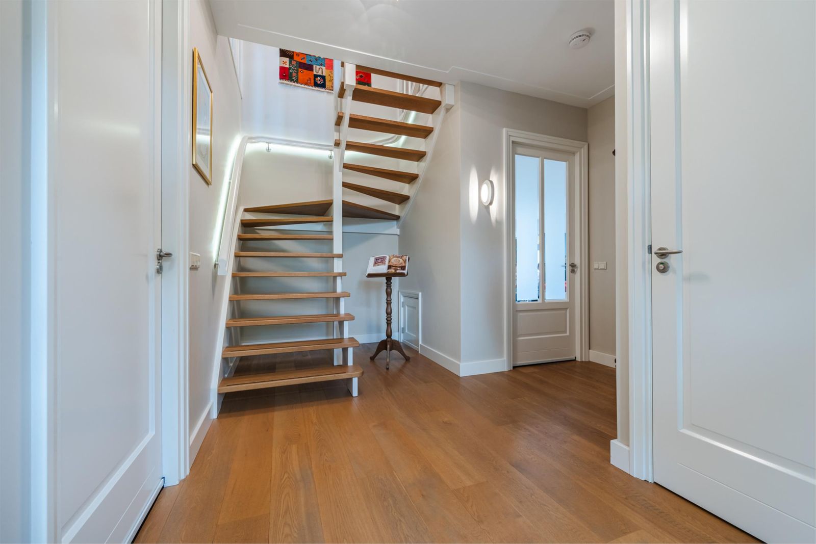 Bij binnenkomst treft u een royale hal met een stijlvolle trapopgang naar de 1e verdieping. Alles is luxe afgewerkt. In de hal bevinden zich een moderne meterkast, een volledig betegeld toilet met een speciale spiegelopstelling en deuren naar de woonkamer en kantoorruimte.