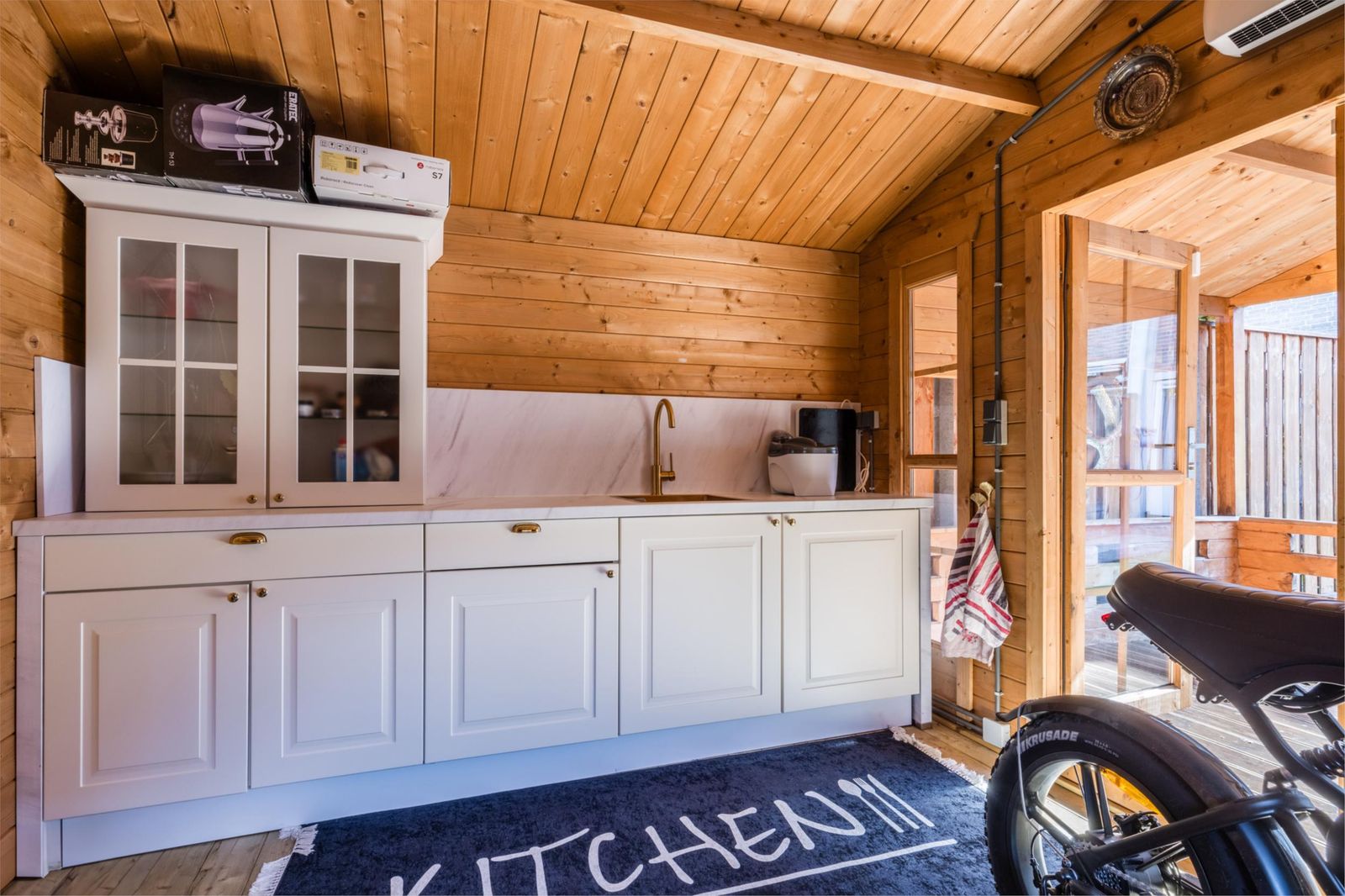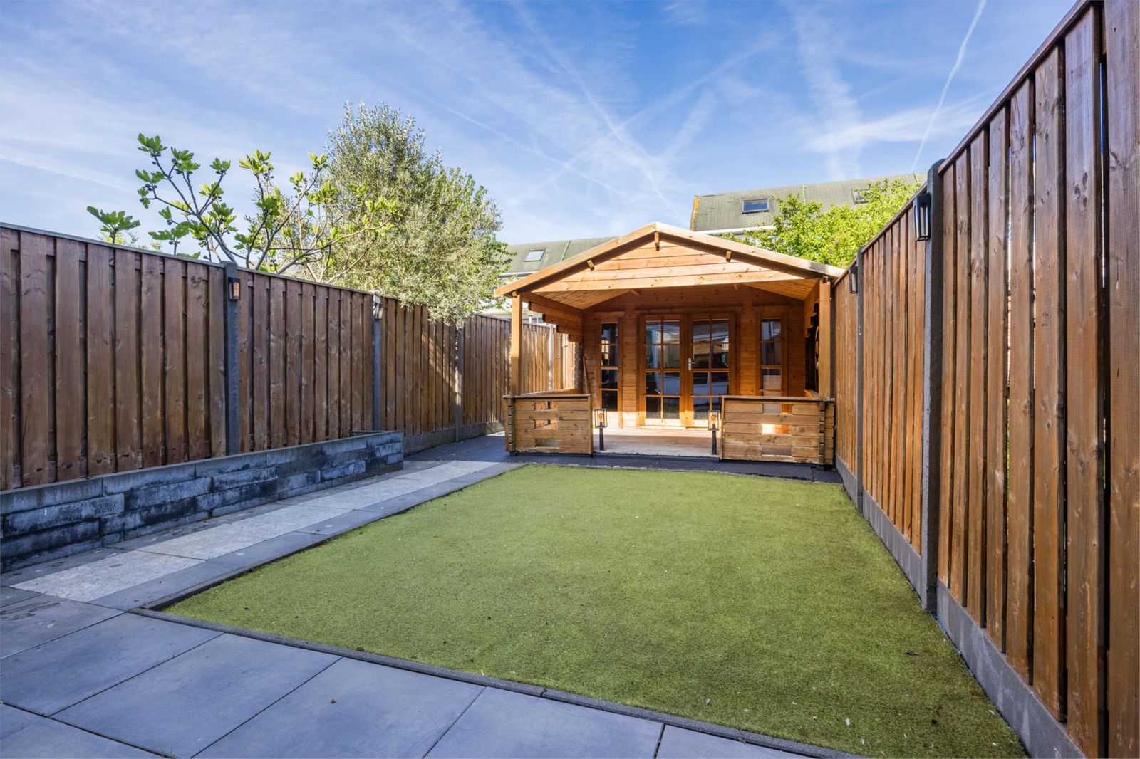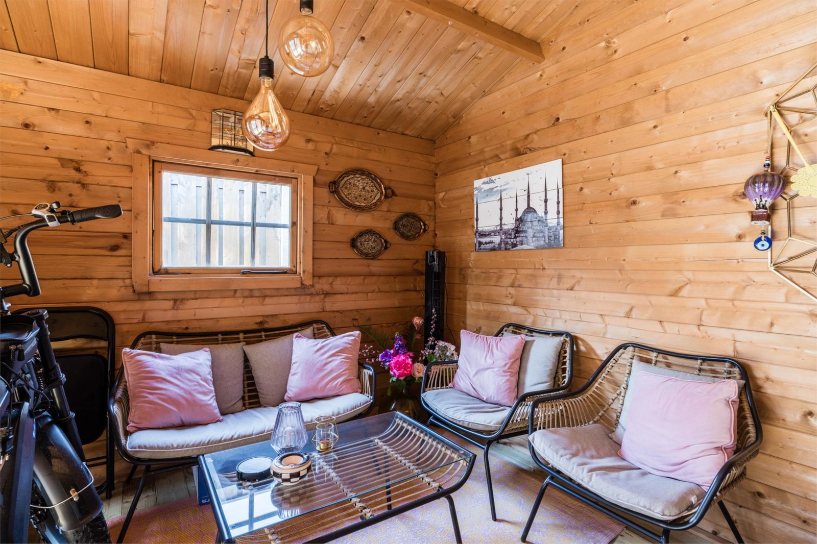 Via de woonkamer loop je zo de diepe, zonnige achtertuin in. Hier vind je een veranda én een volledig uitgerust houten chalet met water en elektra. Ideaal als thuiswerkplek, hobbyruimte of als extra plek om gasten te ontvangen in de zomer.