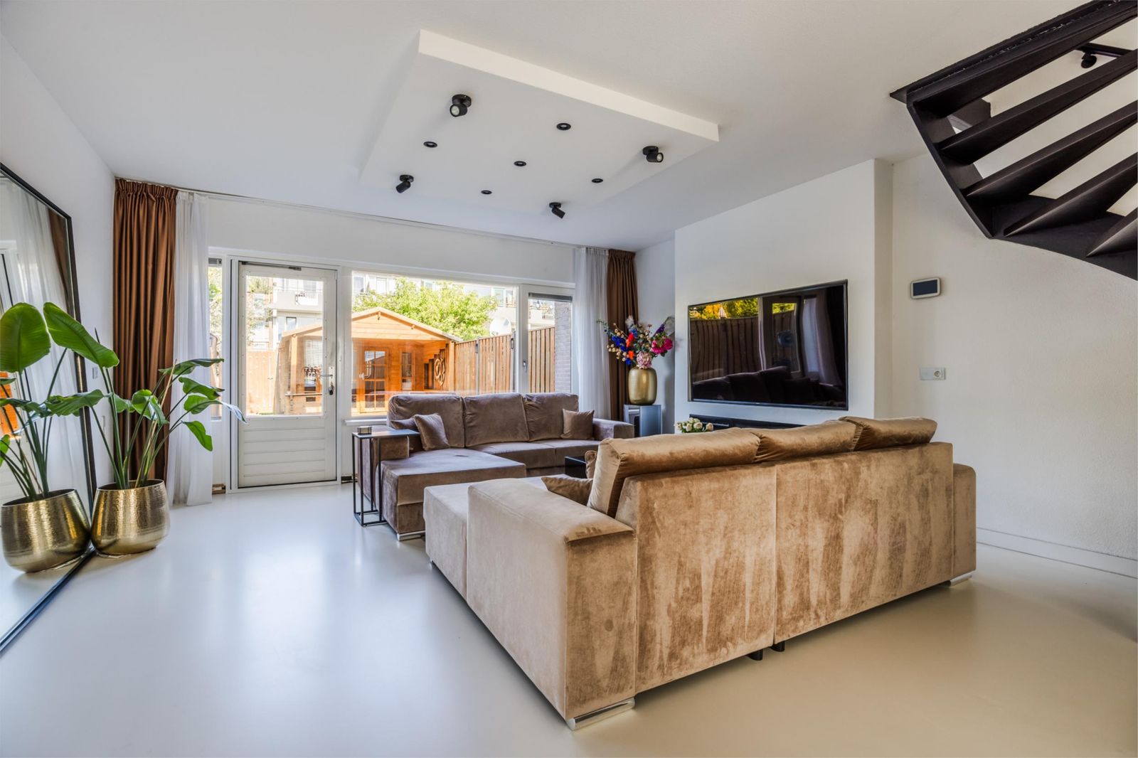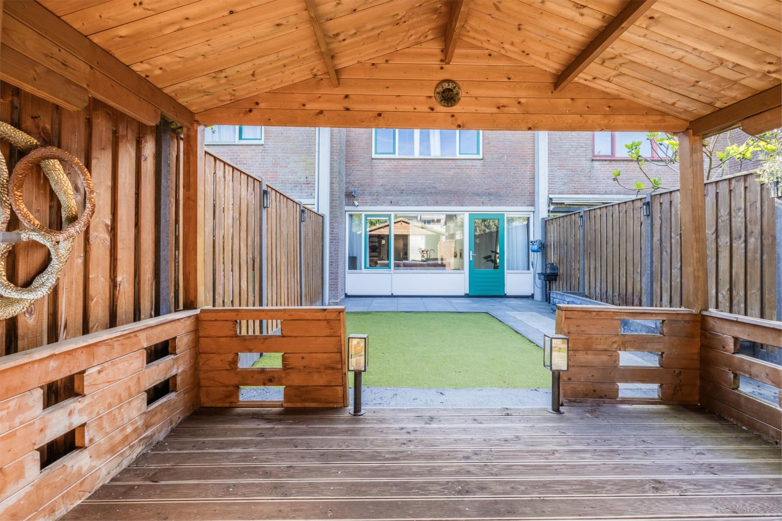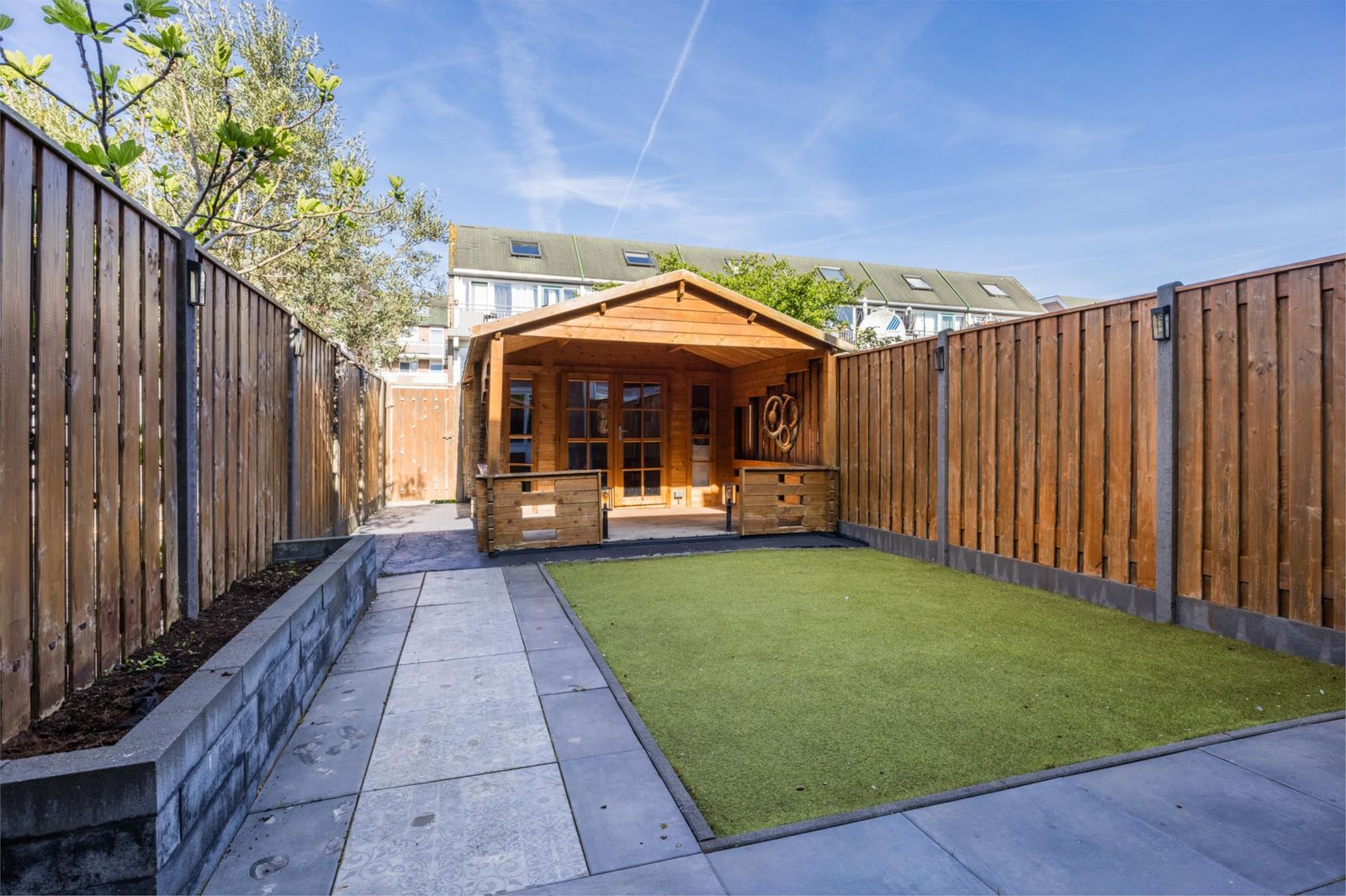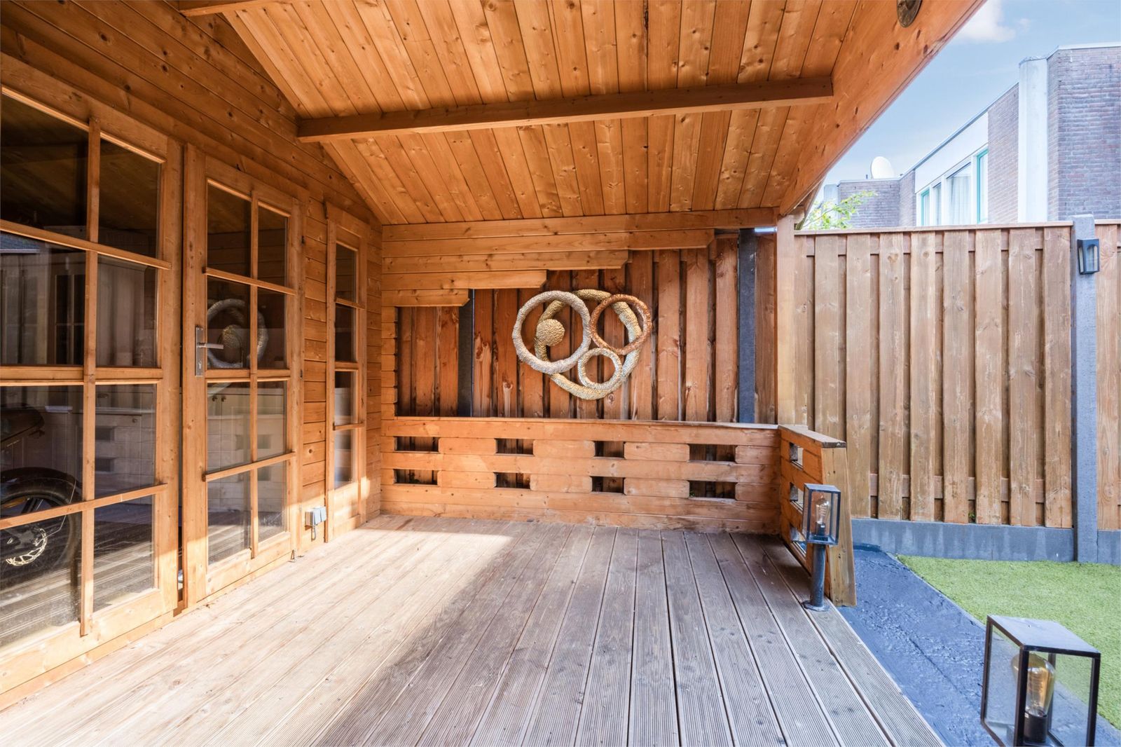 Via de woonkamer loop je zo de diepe, zonnige achtertuin in. Hier vind je een veranda én een volledig uitgerust houten chalet met water en elektra. Ideaal als thuiswerkplek, hobbyruimte of als extra plek om gasten te ontvangen in de zomer.