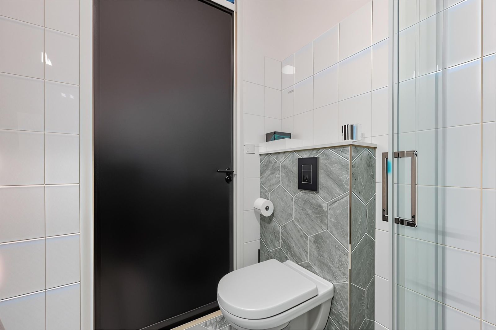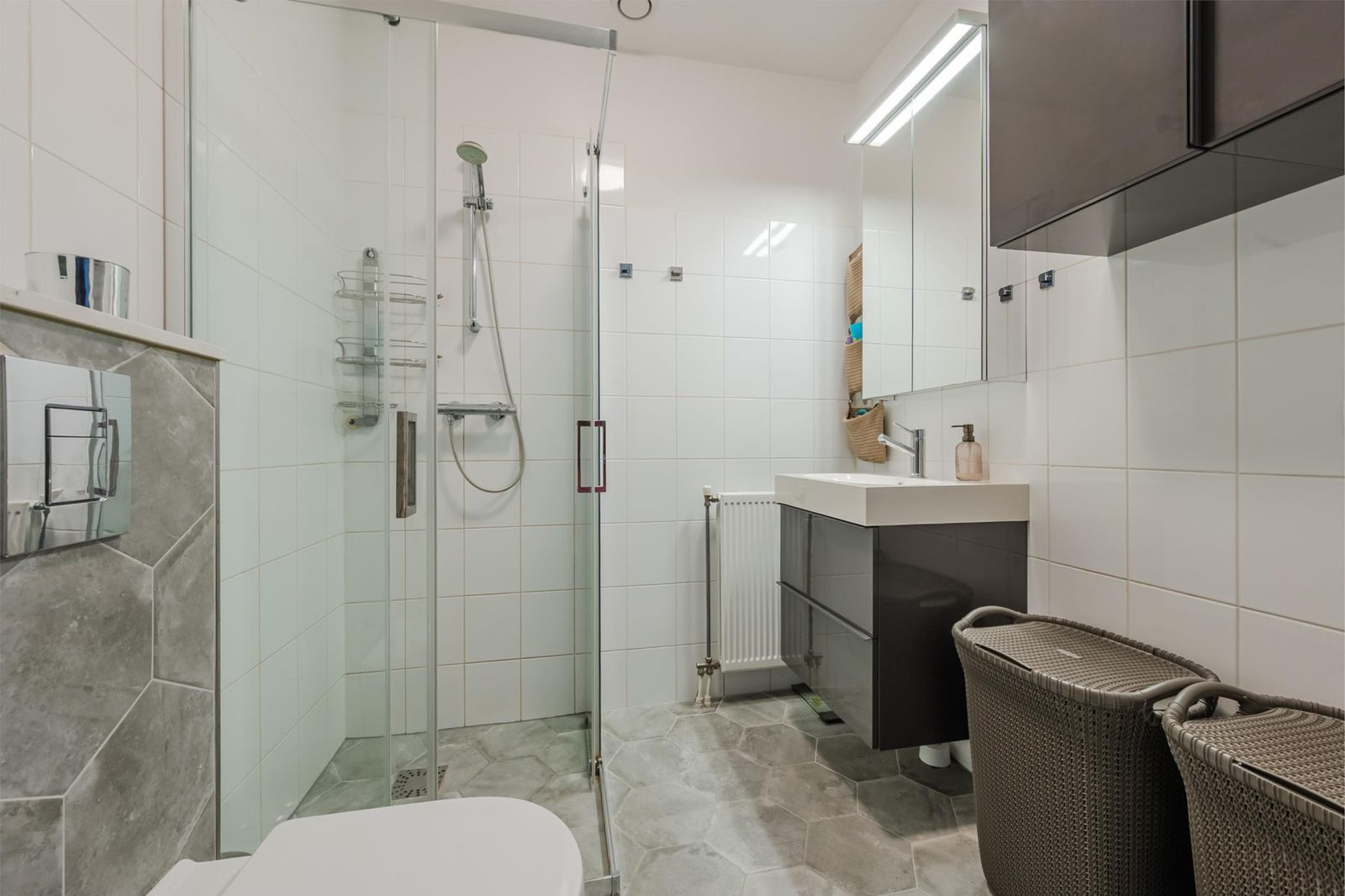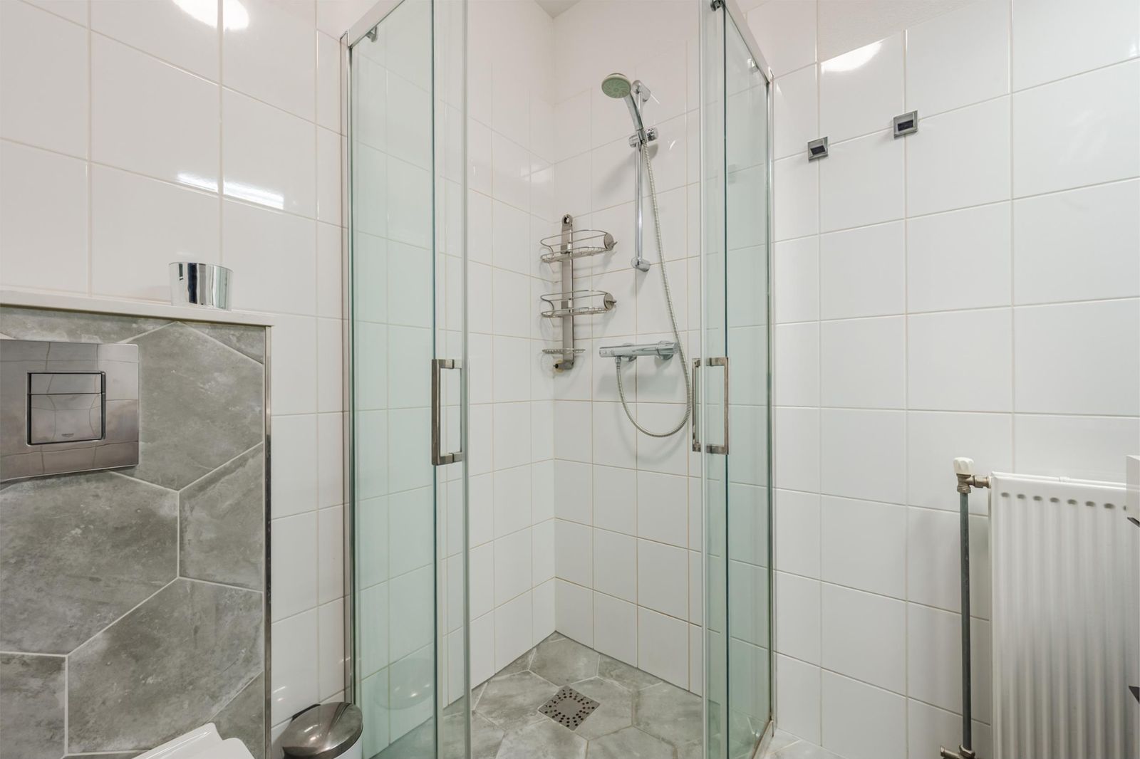 De badkamer is betegeld en voorzien van een glazen douchecabine, een wastafelmeubel en een toilet. De ruime slaapkamer aan de voorzijde is voorzien van rolluiken en biedt daarnaast voldoende ruimte voor een tweepersoonsbed en een kledingkast.