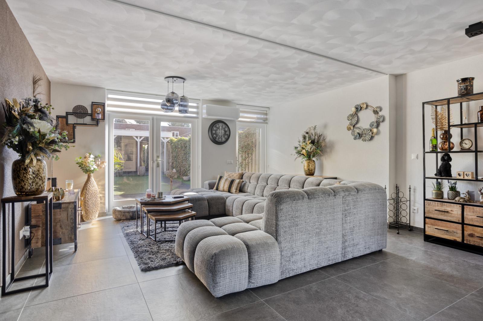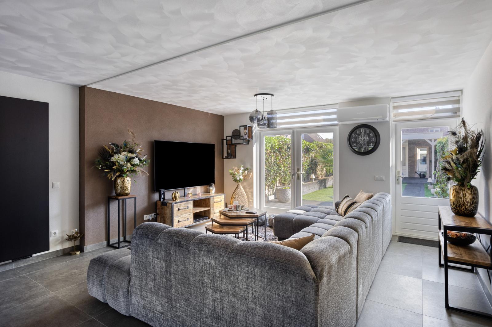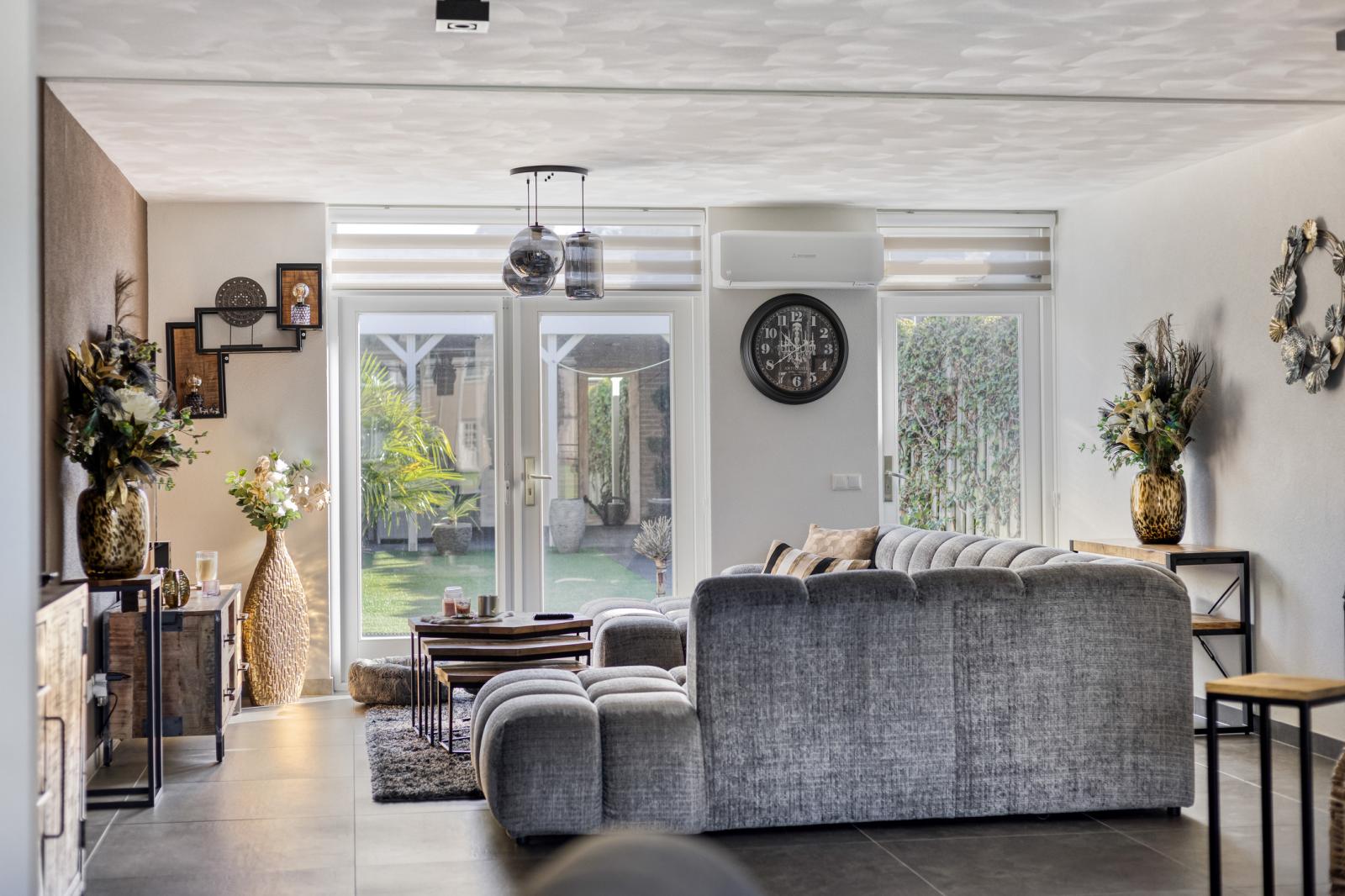 De woonkamer is ruim en licht, met uitzicht op de autoluwe straat en voorzien van airconditioning voor optimaal wooncomfort.