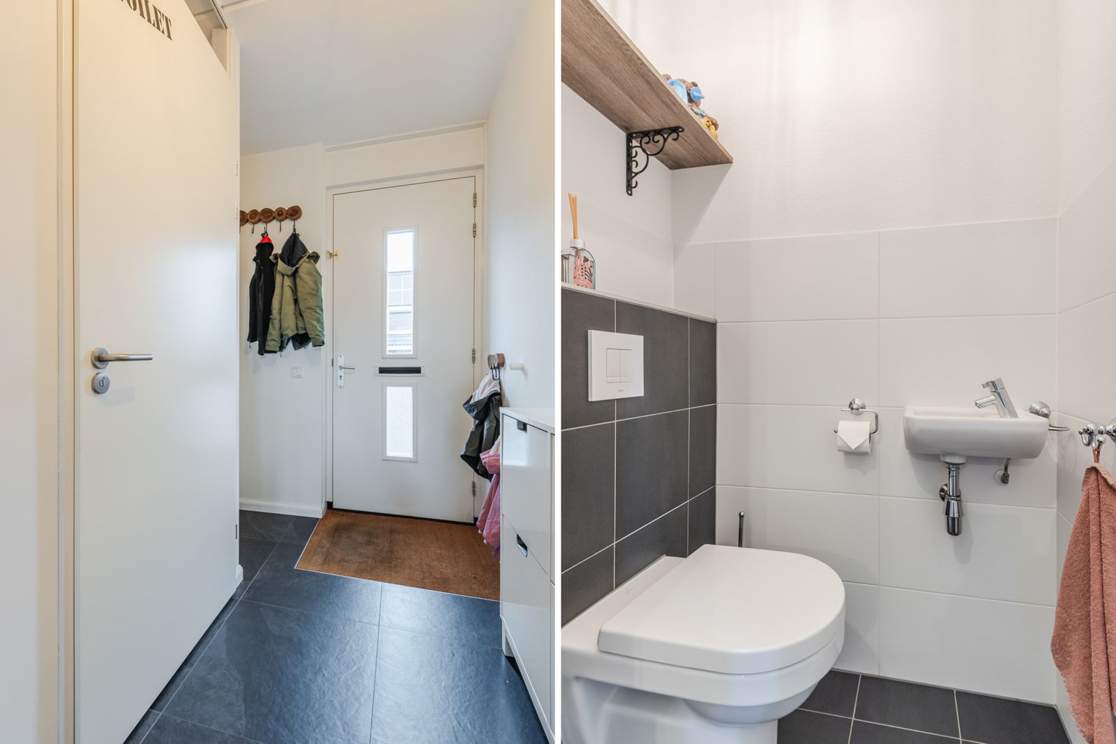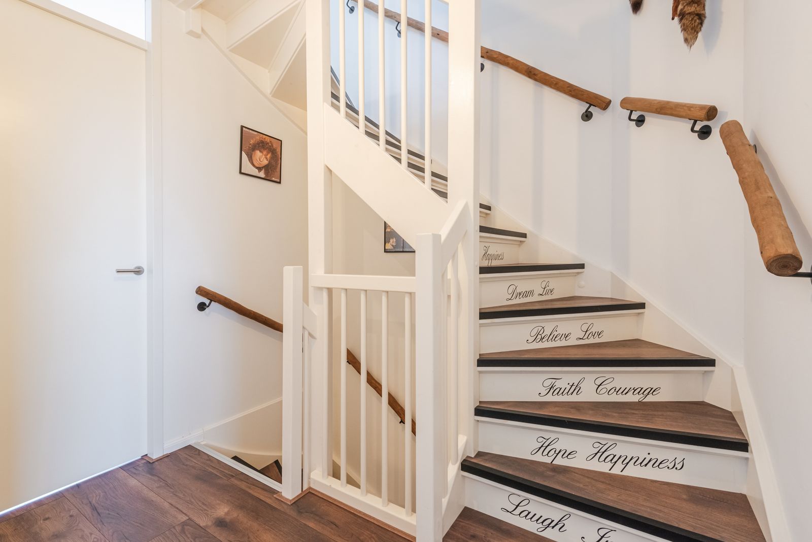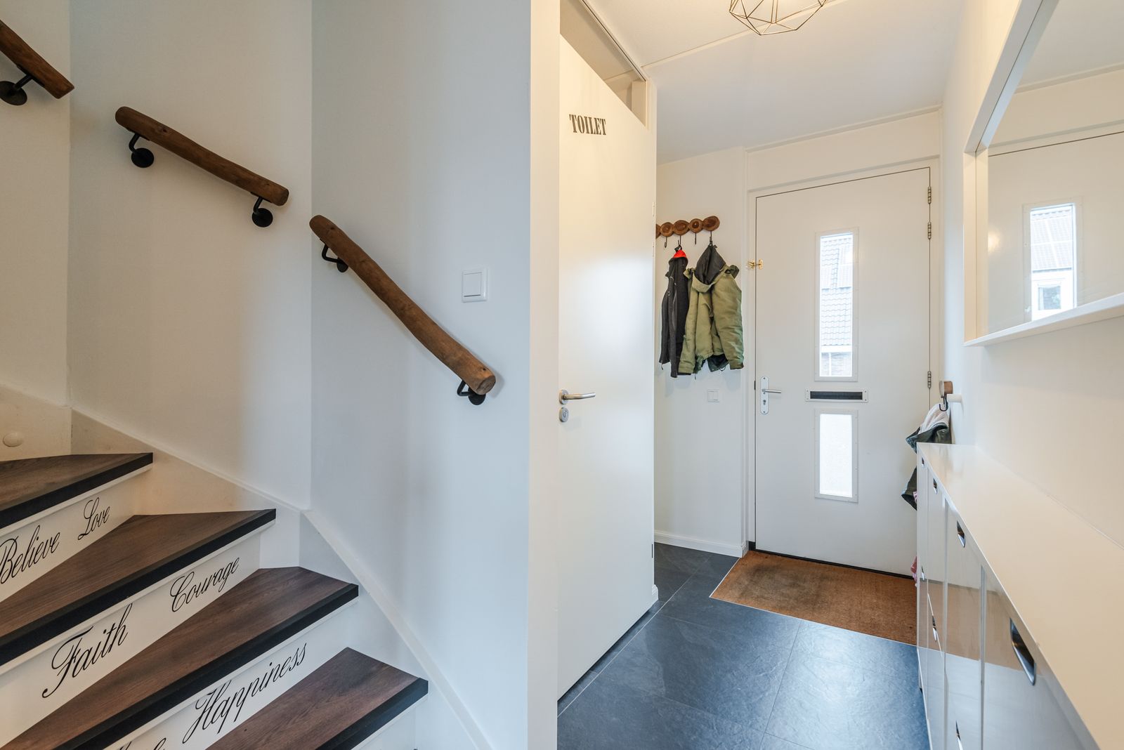 Entree met hal, moderne toiletruimte, meterkast en een dichte houten trapopgang naar de verdieping. Naast de trap is ruimte voor een garderobe.