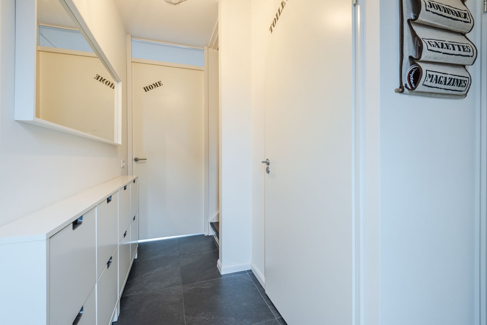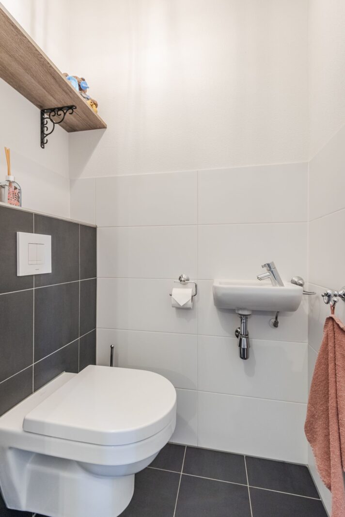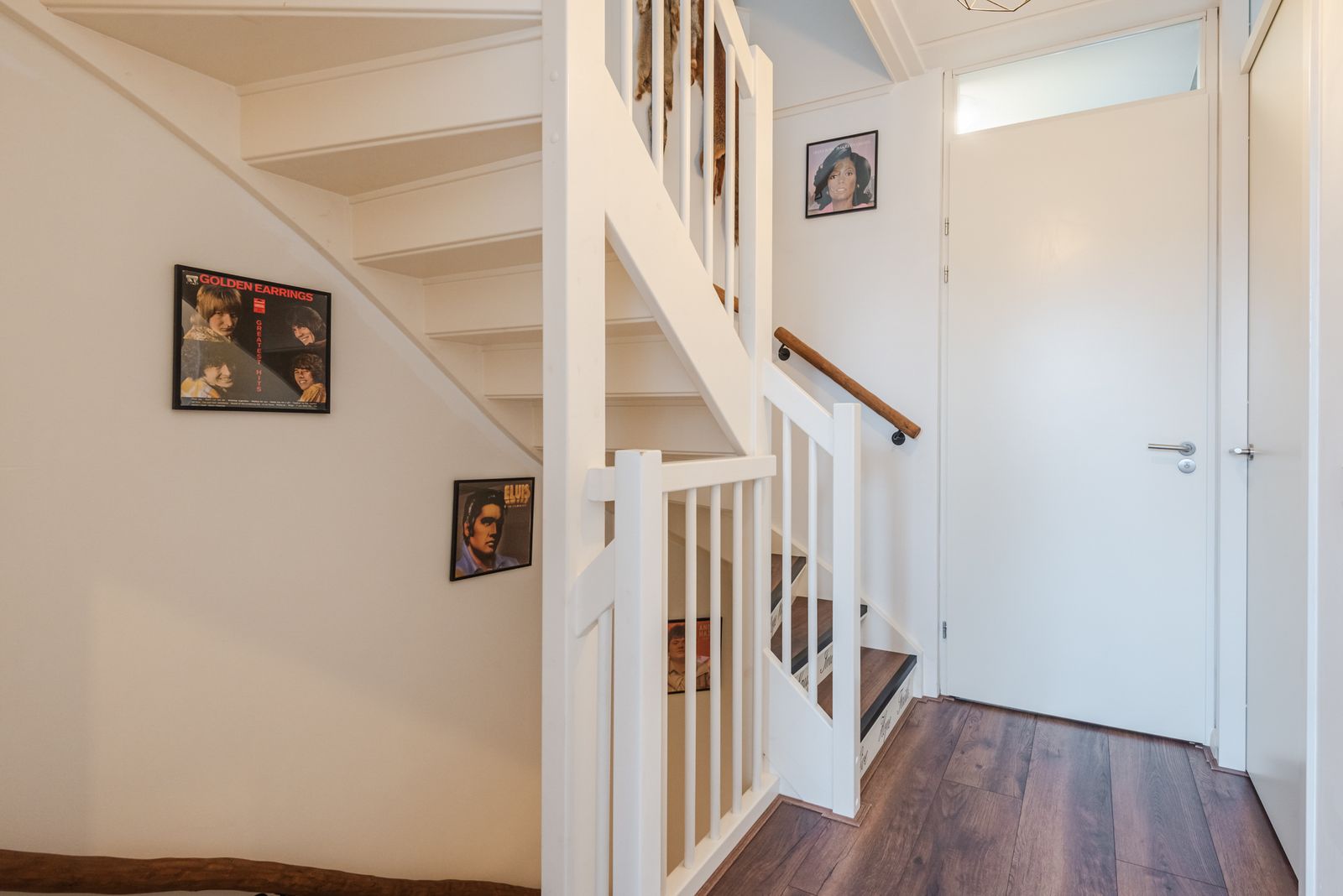 Entree met hal, moderne toiletruimte, meterkast en een dichte houten trapopgang naar de verdieping. Naast de trap is ruimte voor een garderobe.