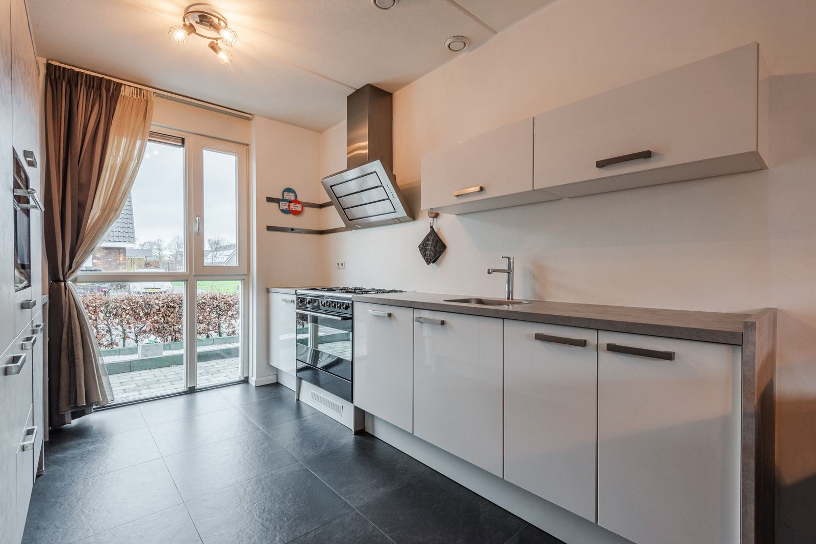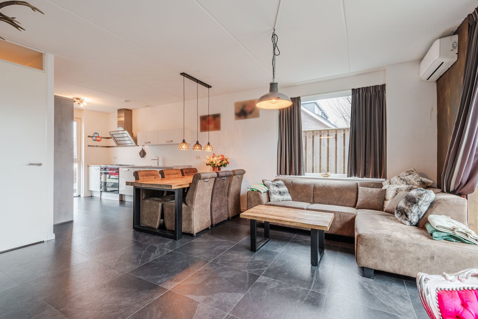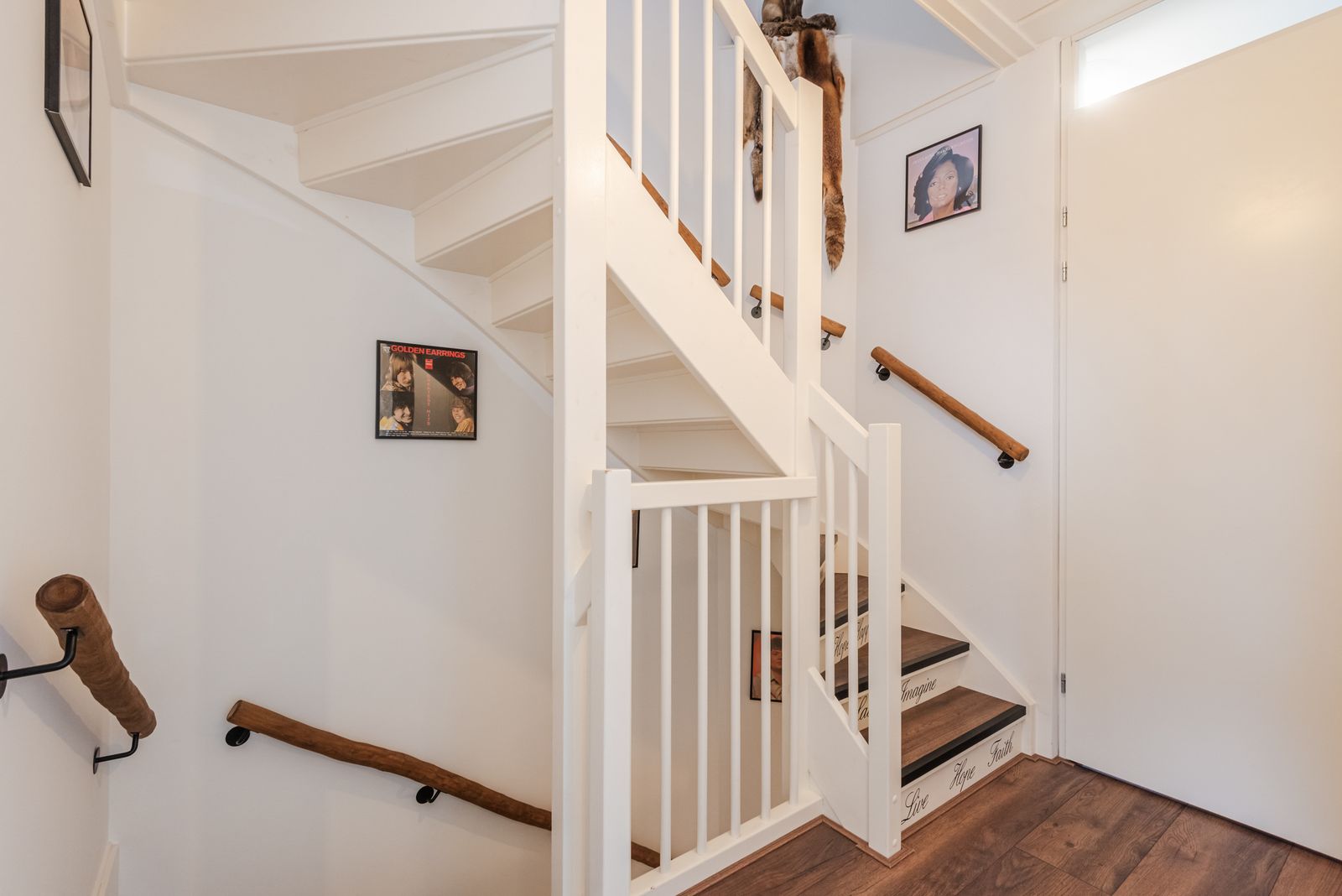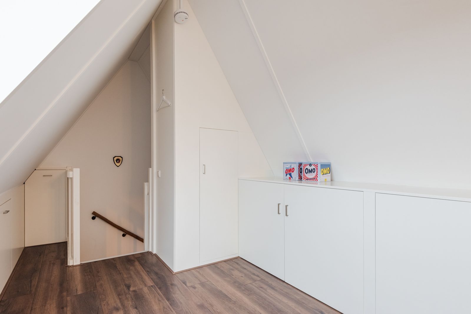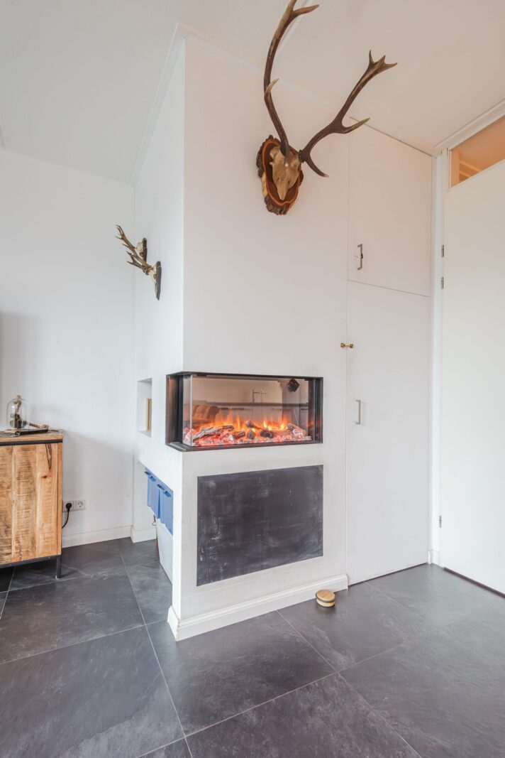 De tuingerichte woonkamer is heerlijk licht dankzij het extra raam in de zijgevel en de openslaande deuren naar het terras en de achtertuin. Onder de trap bevindt zich een praktische trapkast met extra bergruimte, waarin tevens de elektrische haard is geïntegreerd voor extra sfeer en comfort.
