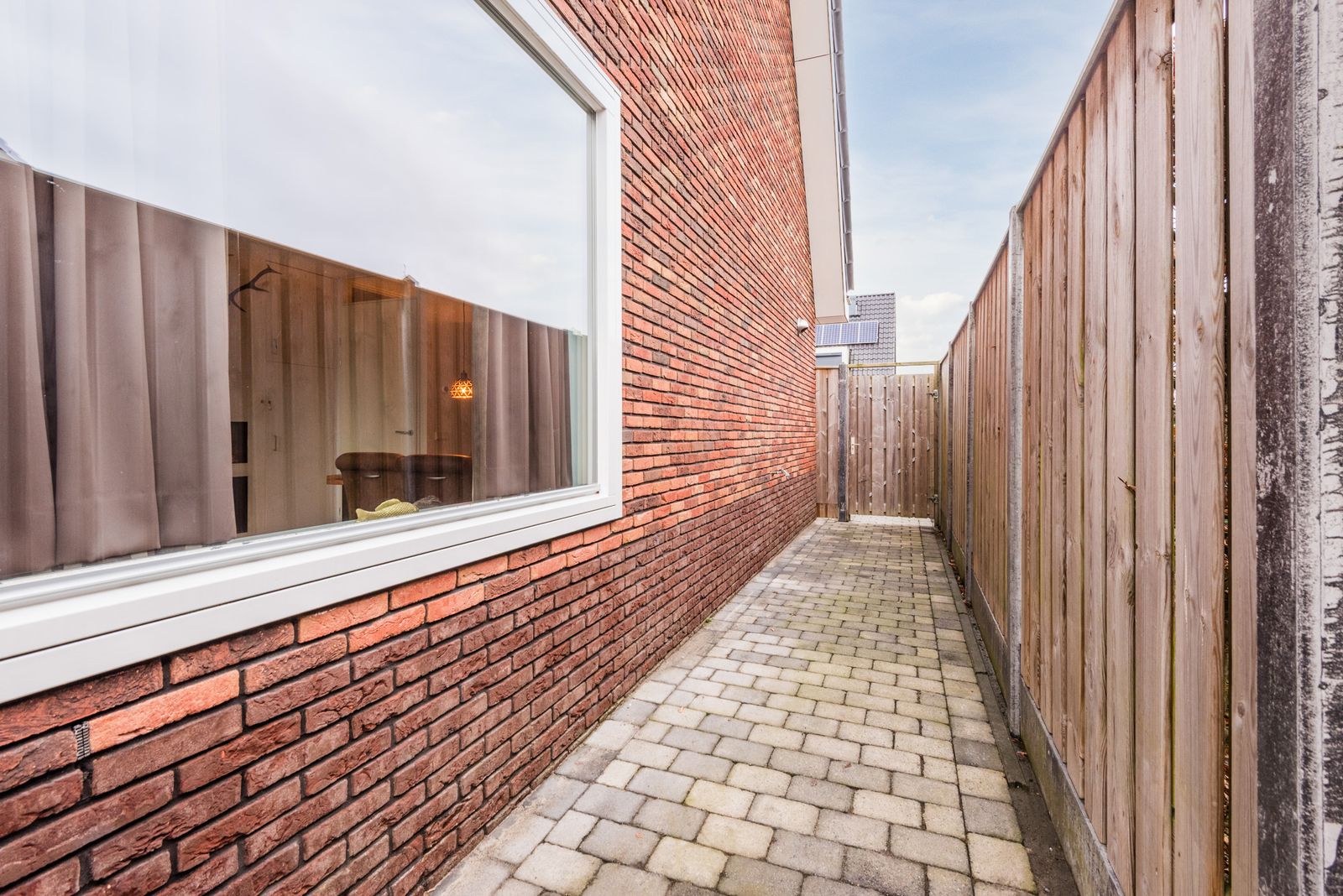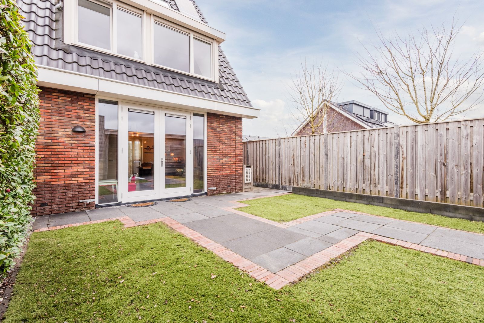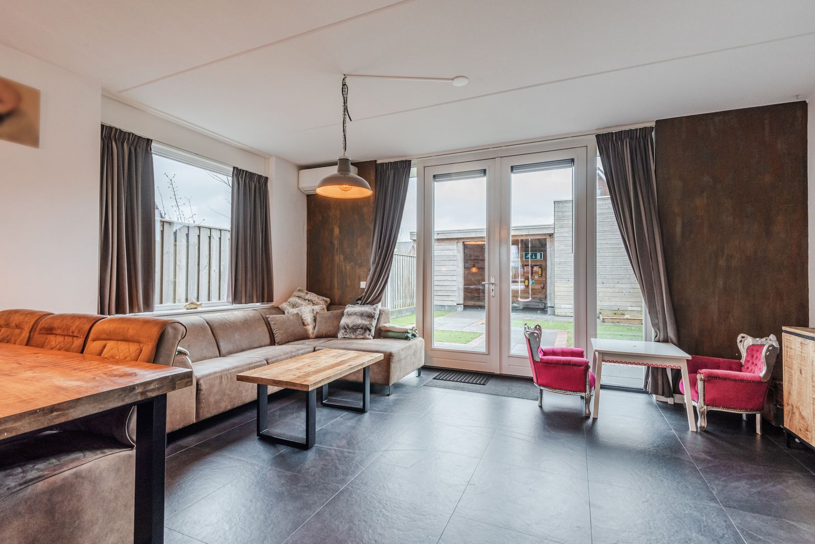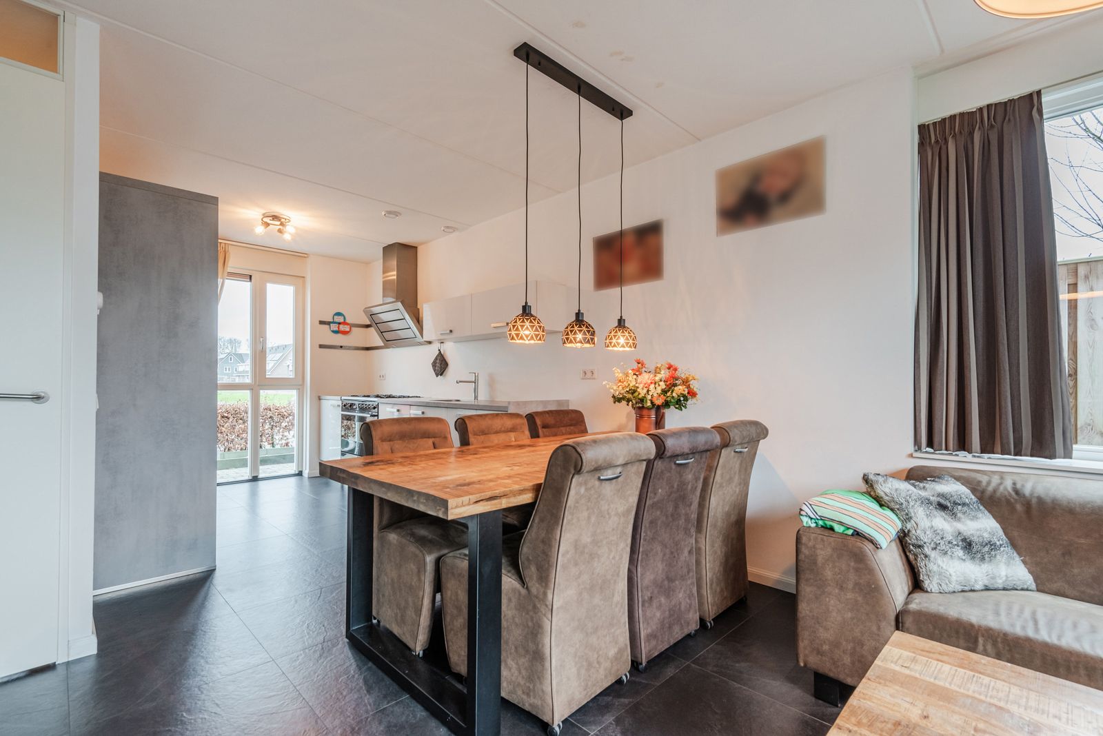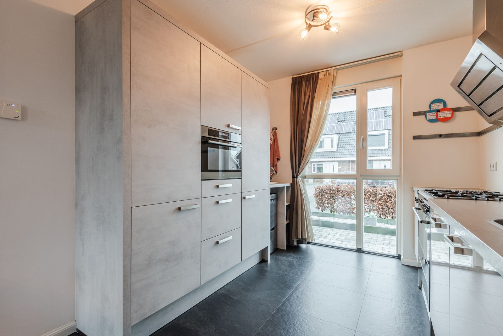 De tuingerichte woonkamer is heerlijk licht dankzij het extra raam in de zijgevel en de openslaande deuren naar het terras en de achtertuin. Onder de trap bevindt zich een praktische trapkast met extra bergruimte, waarin tevens de elektrische haard is geïntegreerd voor extra sfeer en comfort.