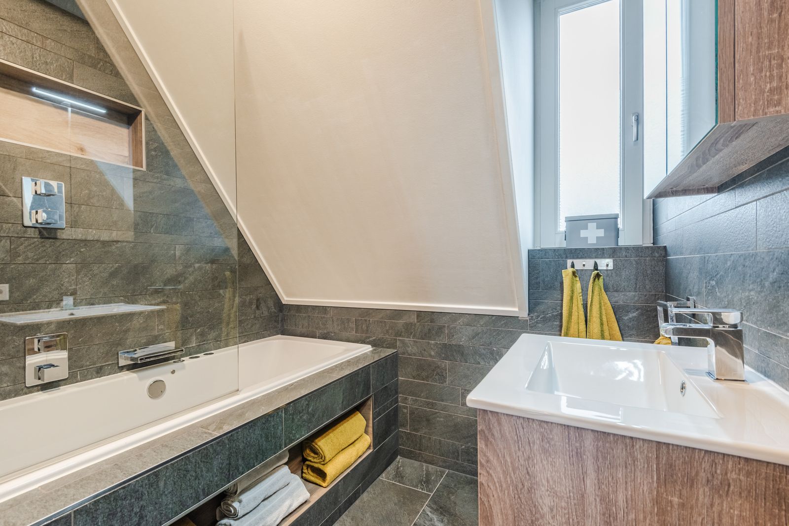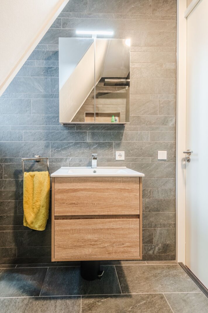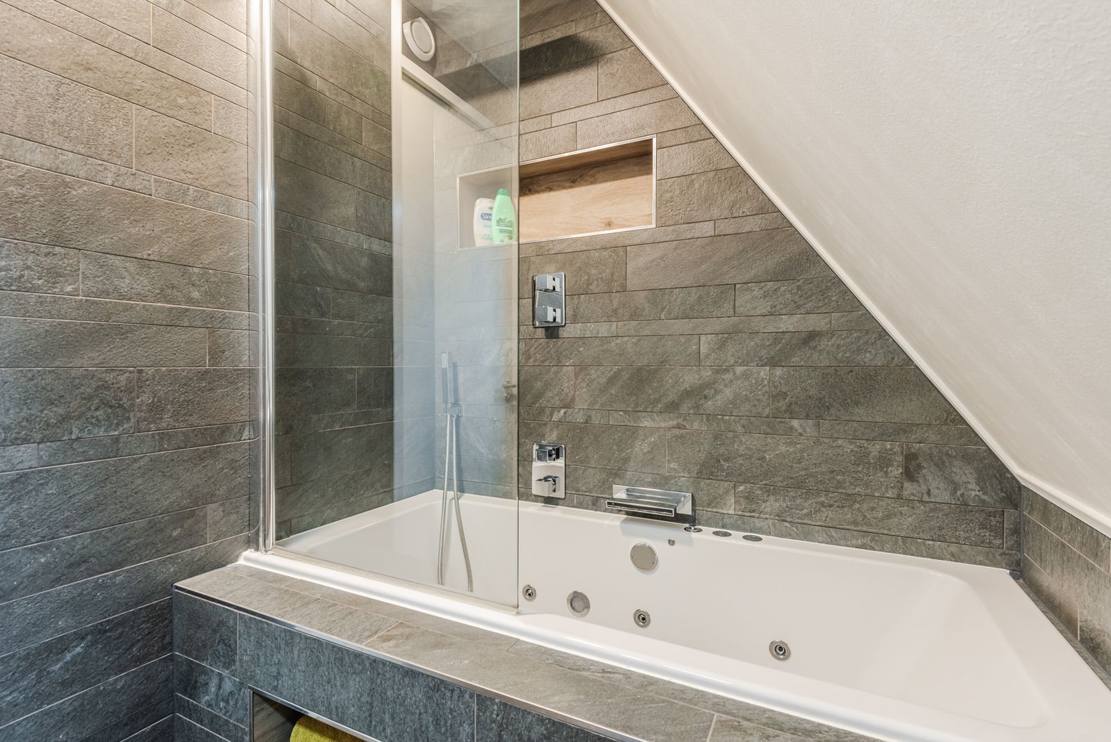 De badkamer, in 2019 volledig vernieuwd, is modern en luxe uitgevoerd met stijlvol wasmeubel, bubbelbad, stortdouche en handdouche. Daarnaast is de badkamer voorzien van een klein dakkapel met draai kiepraam.