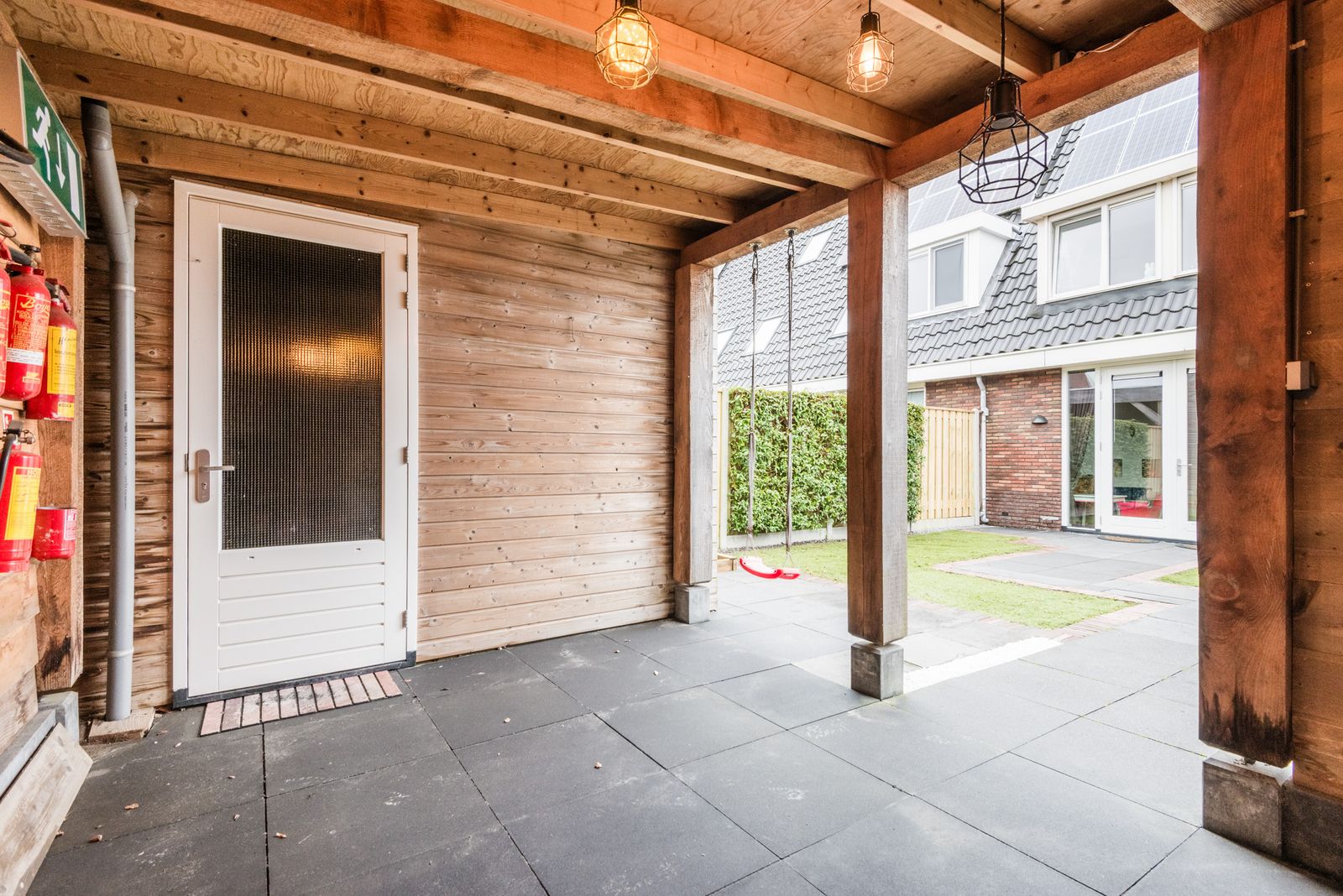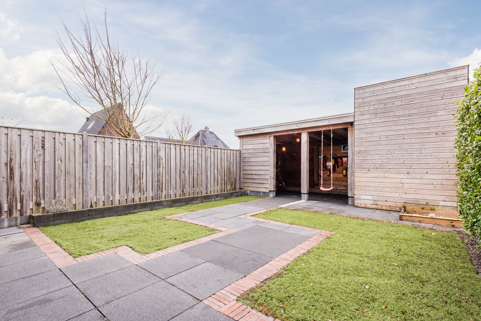 De zonnige tuin op het zuidoosten ligt aan de zij- en achterzijde van de woning en beschikt over een zij ingang met mogelijkheid tot het creëren van een achterom. De tuin is onderhoudsvriendelijk aangelegd en beschikt over een ruime houten berging met 4 zonnepanelen en eigen omvormer, evenals een zeer royale overkapping — een heerlijke plek om het hele jaar door te genieten.