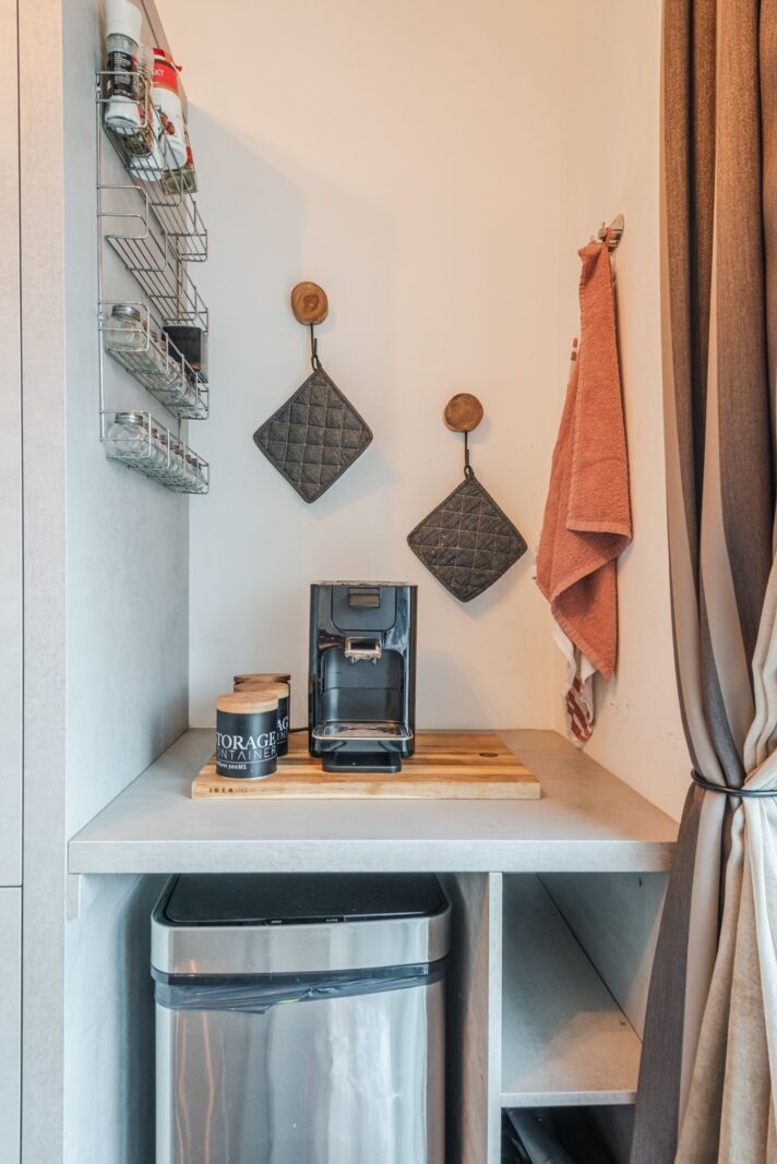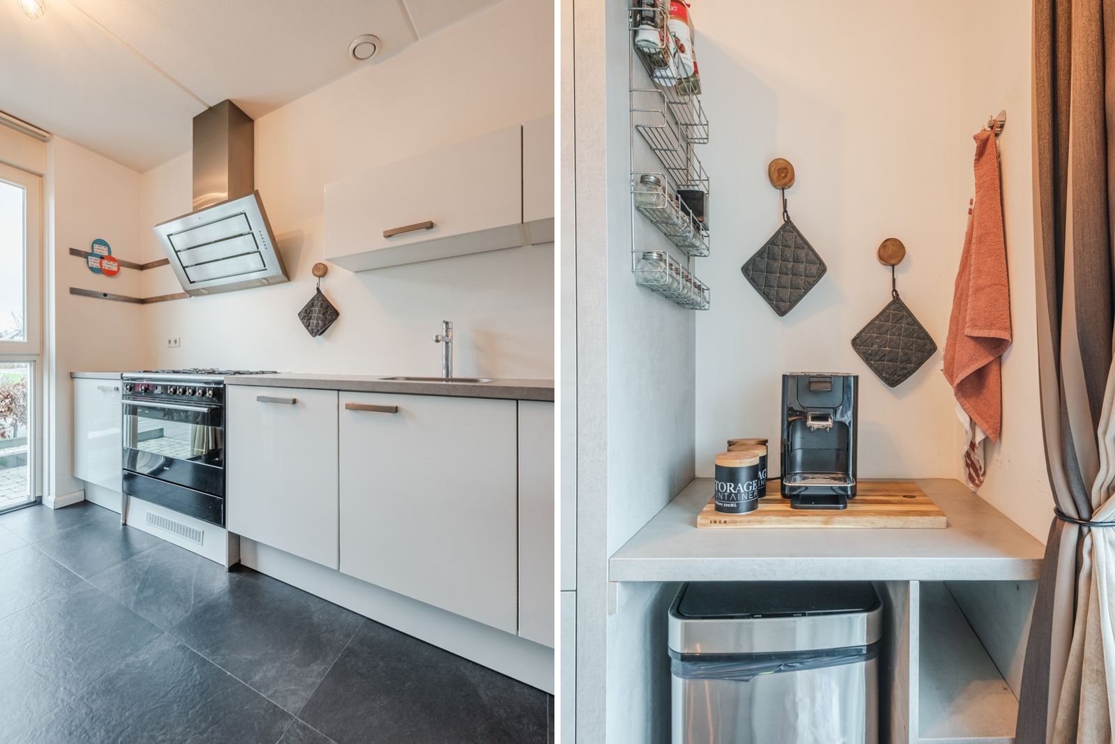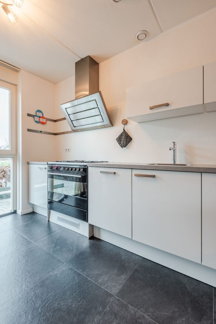 Aan de voorzijde van de woning ligt de luxe keuken, uitgevoerd in een moderne betonlook en is verdeeld over twee delen. Het werkblad en de kastenwand zijn in betonlook, gecombineerd met hoogglans witte onderkasten. De keuken is uitgerust met een ruim fornuis, spoelbak met mengkraan en een ingebouwde vaatwasser.