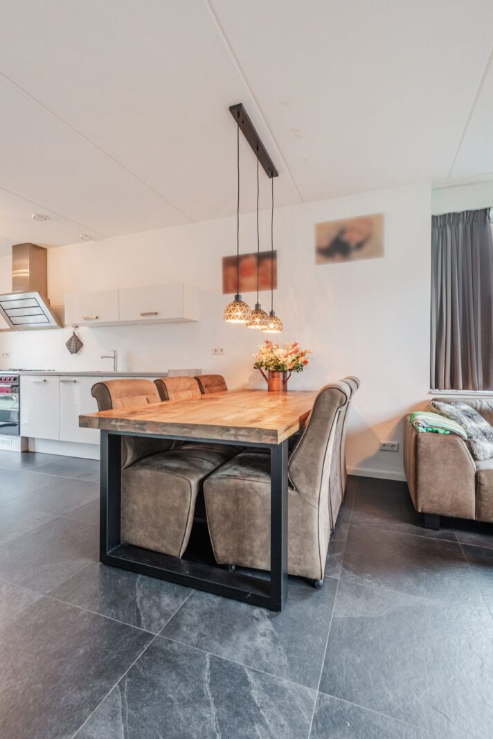 De gehele begane grond is afgewerkt met stijlvolle antraciet vloertegels en voorzien van vloerverwarming.