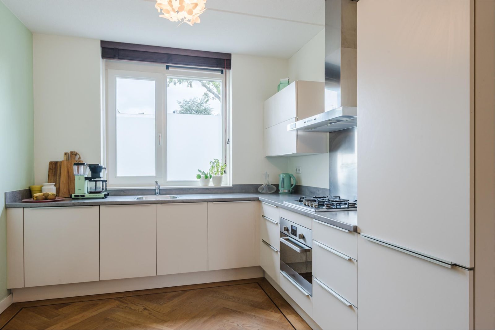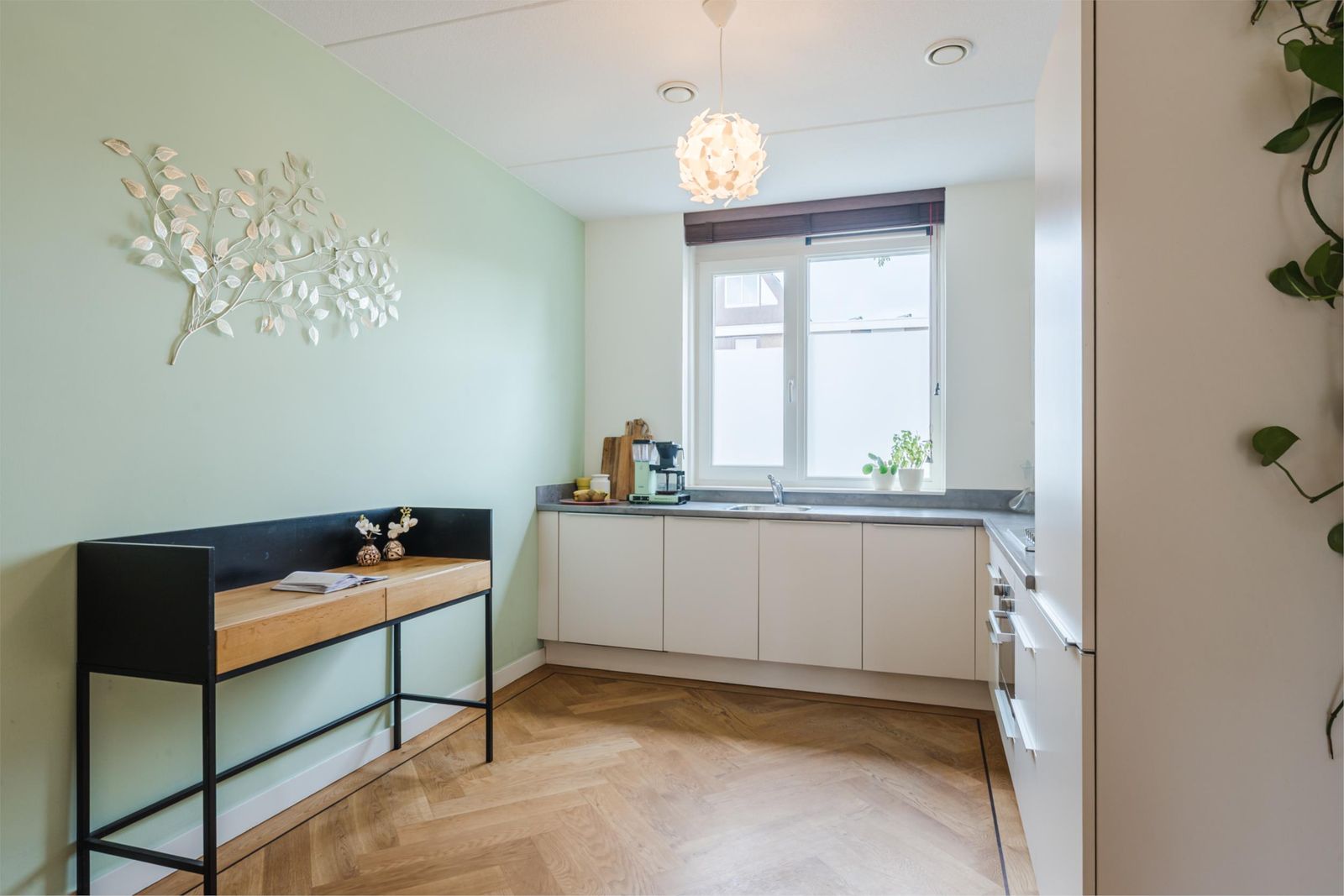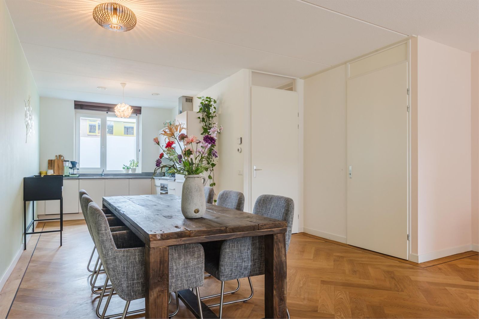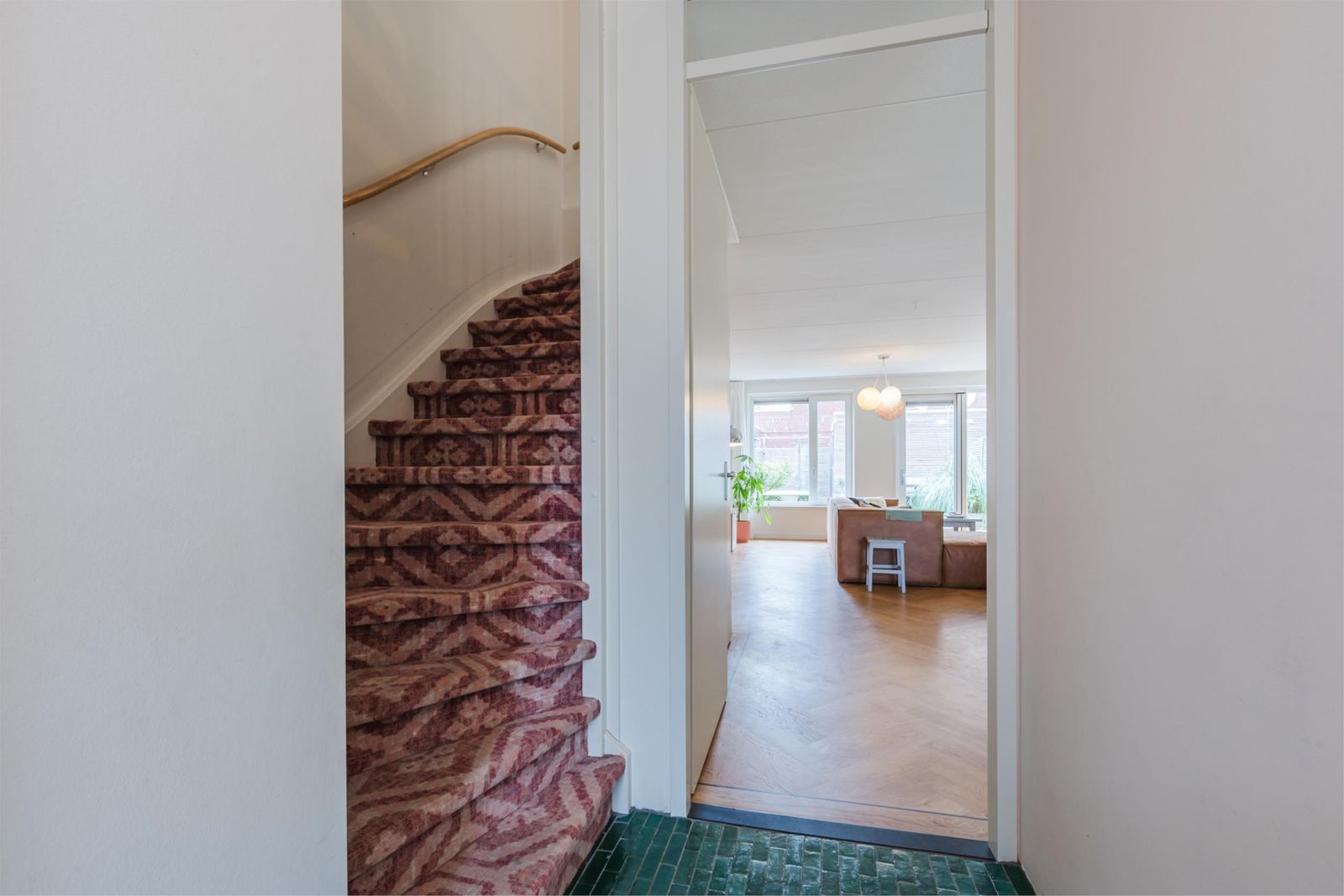 Stap binnen in de stijlvolle hal, met een vloer van handgemaakte Marokkaanse zelliges. Hier bevindt zich de meterkast en een moderne toiletruimte met fonteintje. De ruime, uitgebouwde woonkamer van meer dan vijf meter breed en de open keuken zijn voorzien van een prachtige houten visgraatparketvloer met band, bies en hoge plinten. De lichte, moderne keuken is uitgerust met een gaskookplaat, afzuigkap, combi-oven, vaatwasser, koelkast en vriezer. Onder de trap is een ruime kast, perfect voor extra opslag. De gehele vloer op de begane grond heeft vloerverwarming voor optimaal comfort.