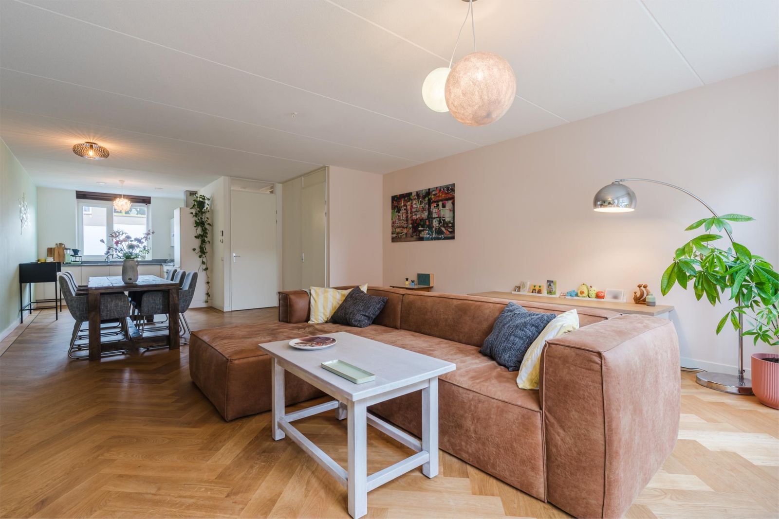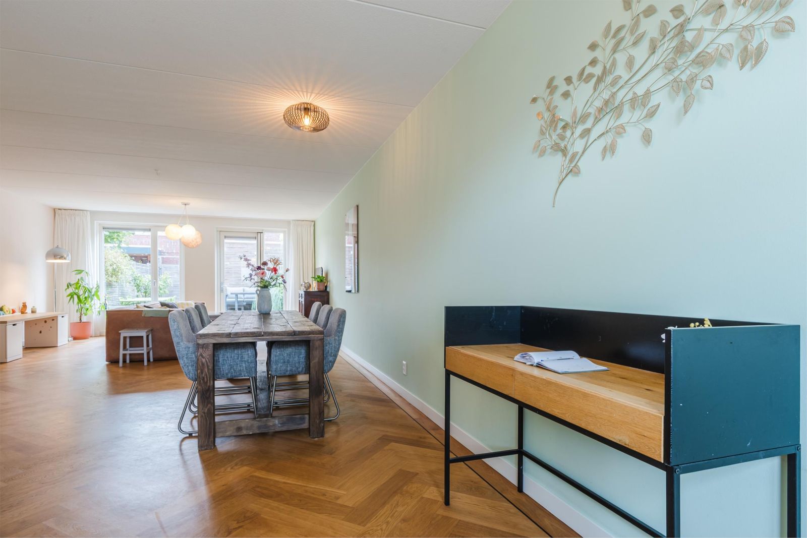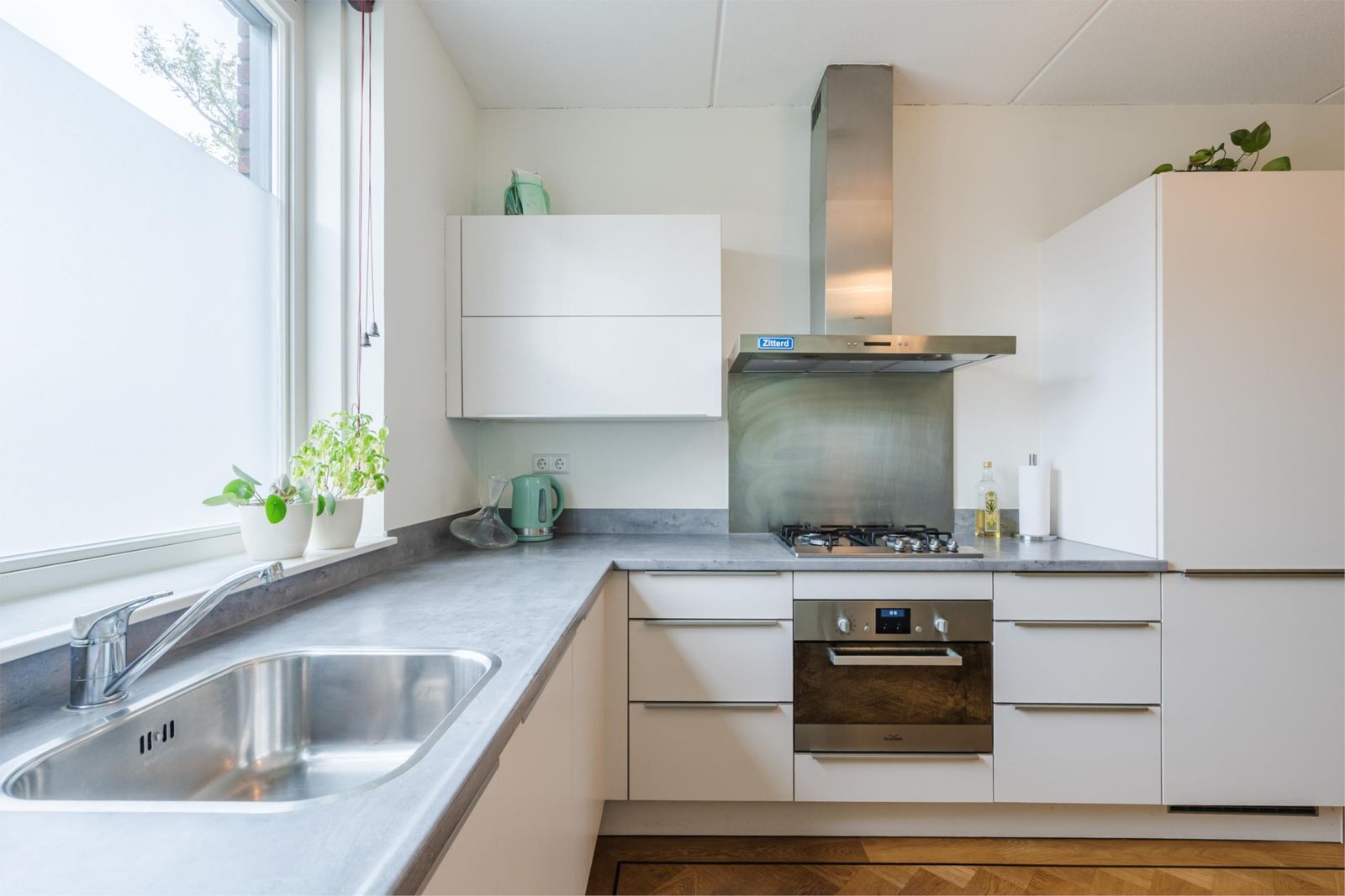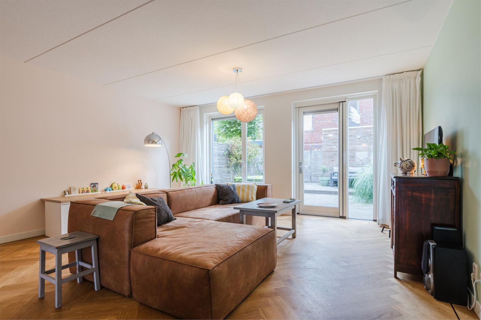 Stap binnen in de stijlvolle hal, met een vloer van handgemaakte Marokkaanse zelliges. Hier bevindt zich de meterkast en een moderne toiletruimte met fonteintje. De ruime, uitgebouwde woonkamer van meer dan vijf meter breed en de open keuken zijn voorzien van een prachtige houten visgraatparketvloer met band, bies en hoge plinten. De lichte, moderne keuken is uitgerust met een gaskookplaat, afzuigkap, combi-oven, vaatwasser, koelkast en vriezer. Onder de trap is een ruime kast, perfect voor extra opslag. De gehele vloer op de begane grond heeft vloerverwarming voor optimaal comfort.