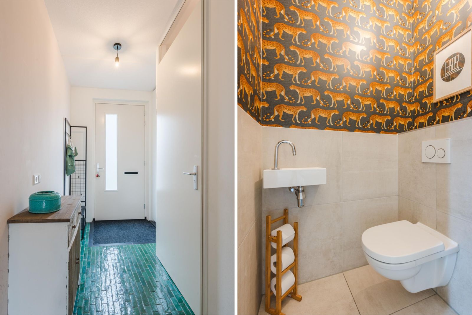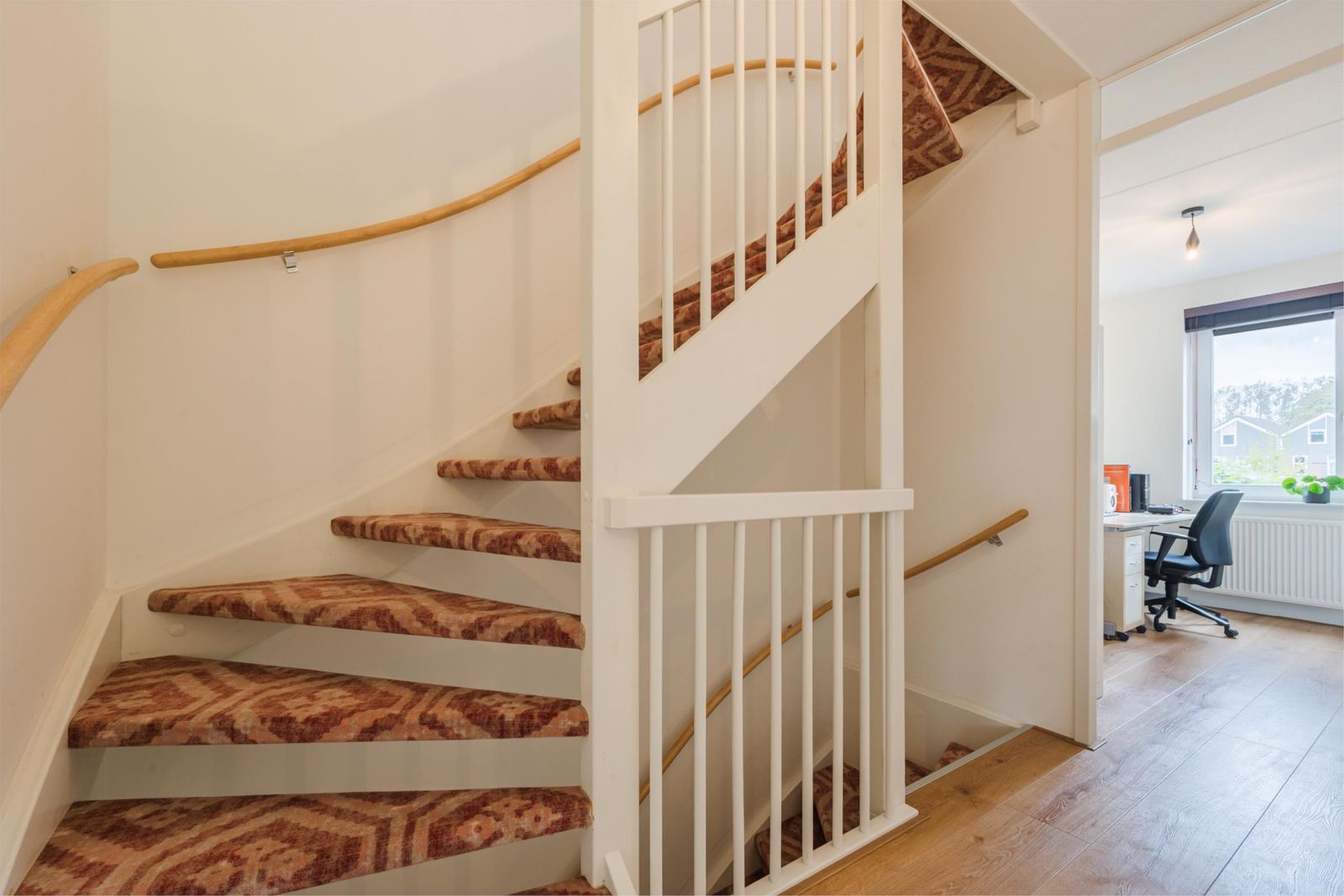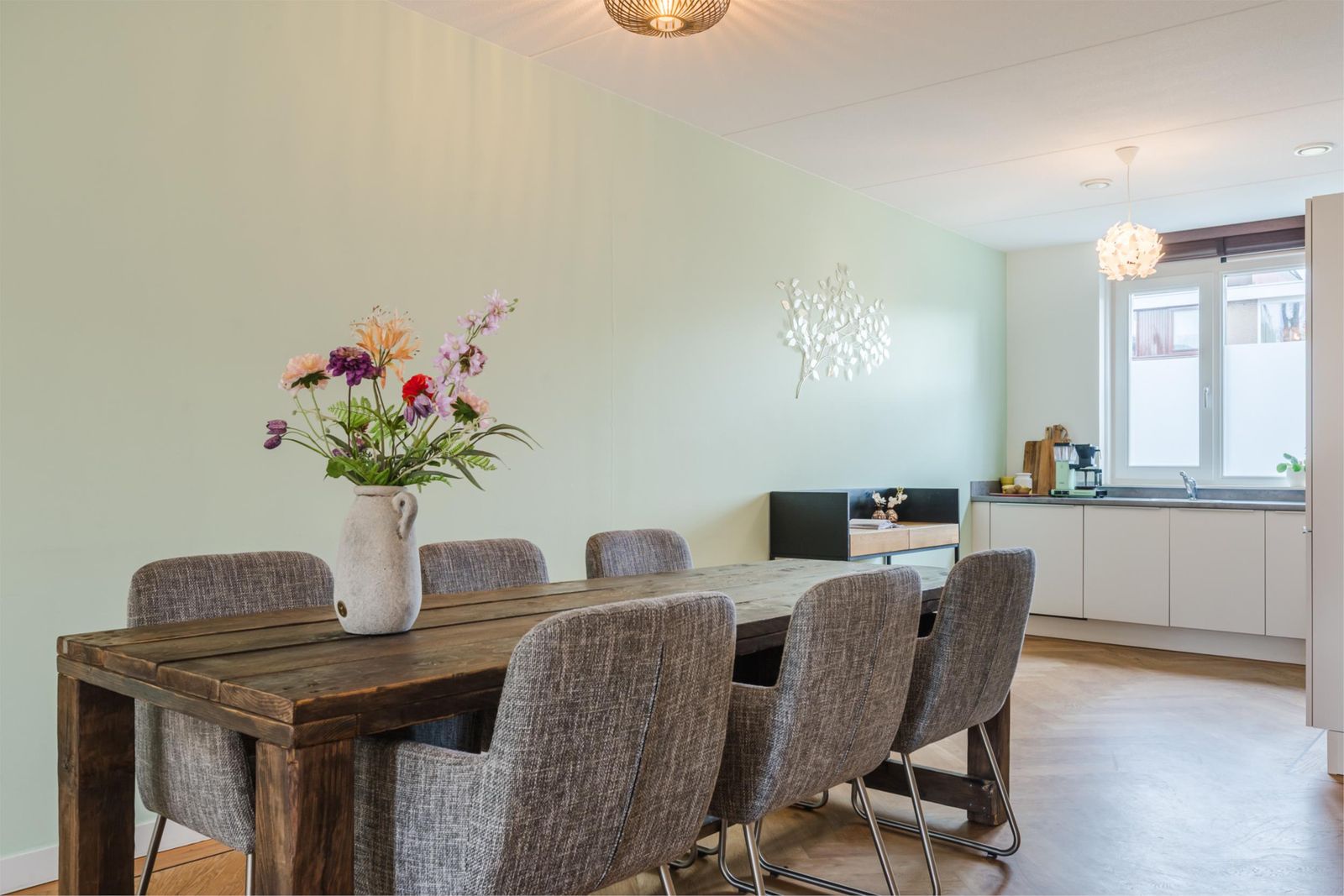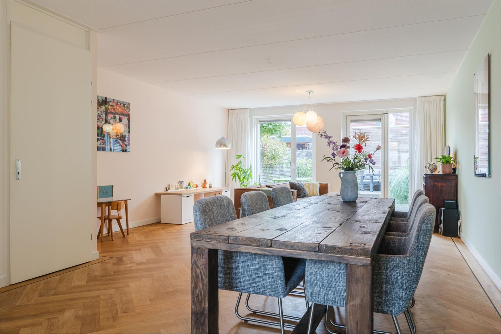 Stap binnen in de stijlvolle hal, met een vloer van handgemaakte Marokkaanse zelliges. Hier bevindt zich de meterkast en een moderne toiletruimte met fonteintje. De ruime, uitgebouwde woonkamer van meer dan vijf meter breed en de open keuken zijn voorzien van een prachtige houten visgraatparketvloer met band, bies en hoge plinten. De lichte, moderne keuken is uitgerust met een gaskookplaat, afzuigkap, combi-oven, vaatwasser, koelkast en vriezer. Onder de trap is een ruime kast, perfect voor extra opslag. De gehele vloer op de begane grond heeft vloerverwarming voor optimaal comfort.