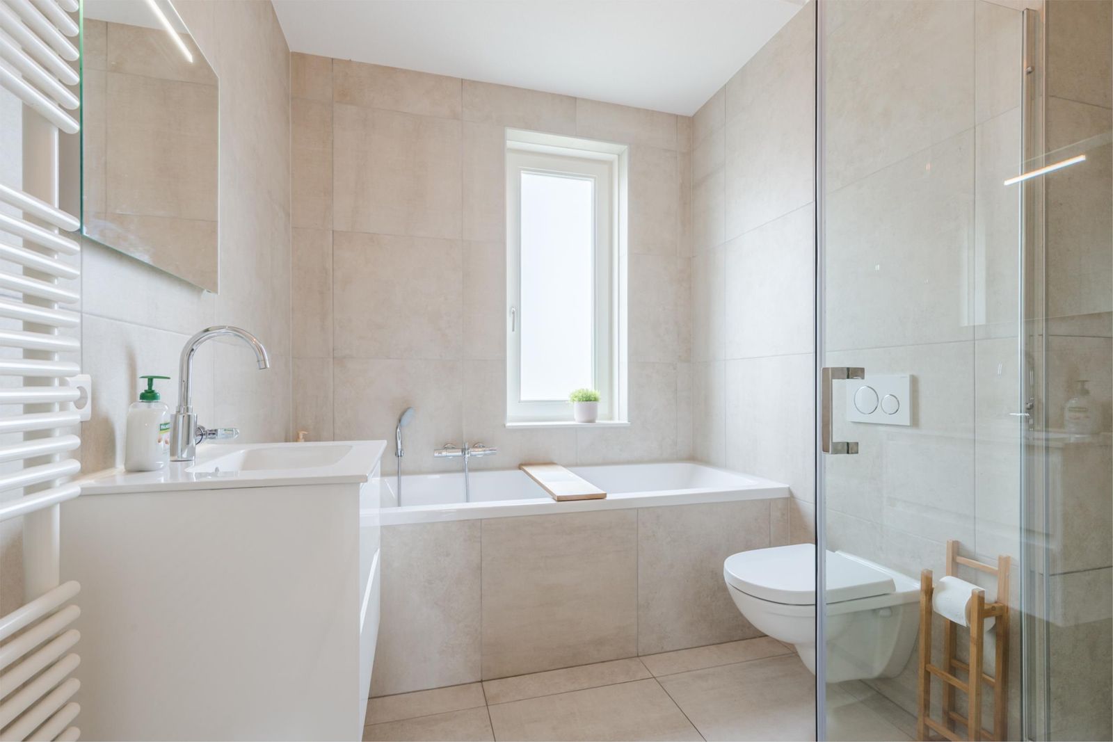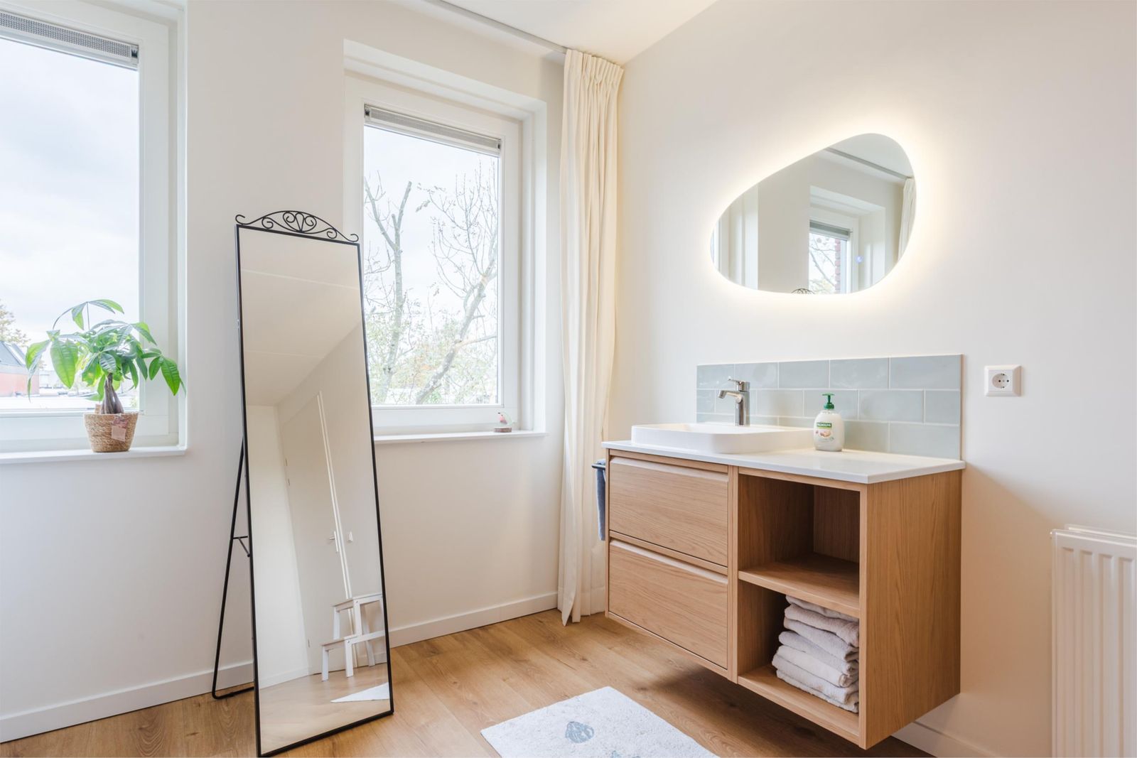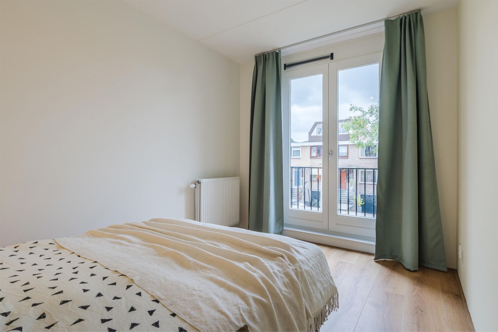 Op de eerste verdieping vind je drie goed bemeten slaapkamers en de luxe badkamer. Deze moderne badkamer in lichte kleuren straalt elegantie uit met een tweepersoonsligbad, regendouche, wandcloset en een wastafelmeubel. De grootste slaapkamer ligt aan de achterzijde en de slaapkamer aan de voorzijde heeft toegang tot een Frans balkon.