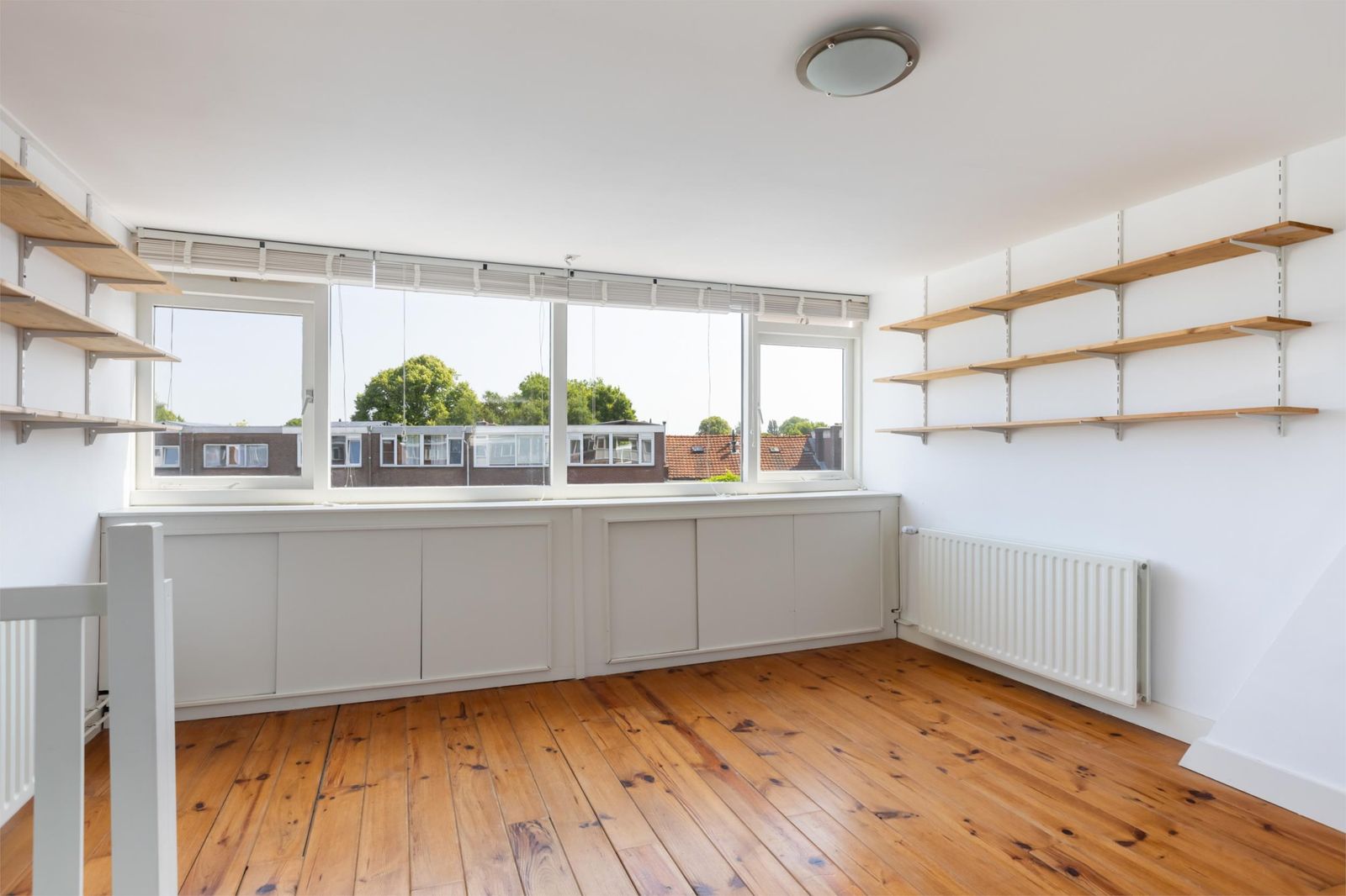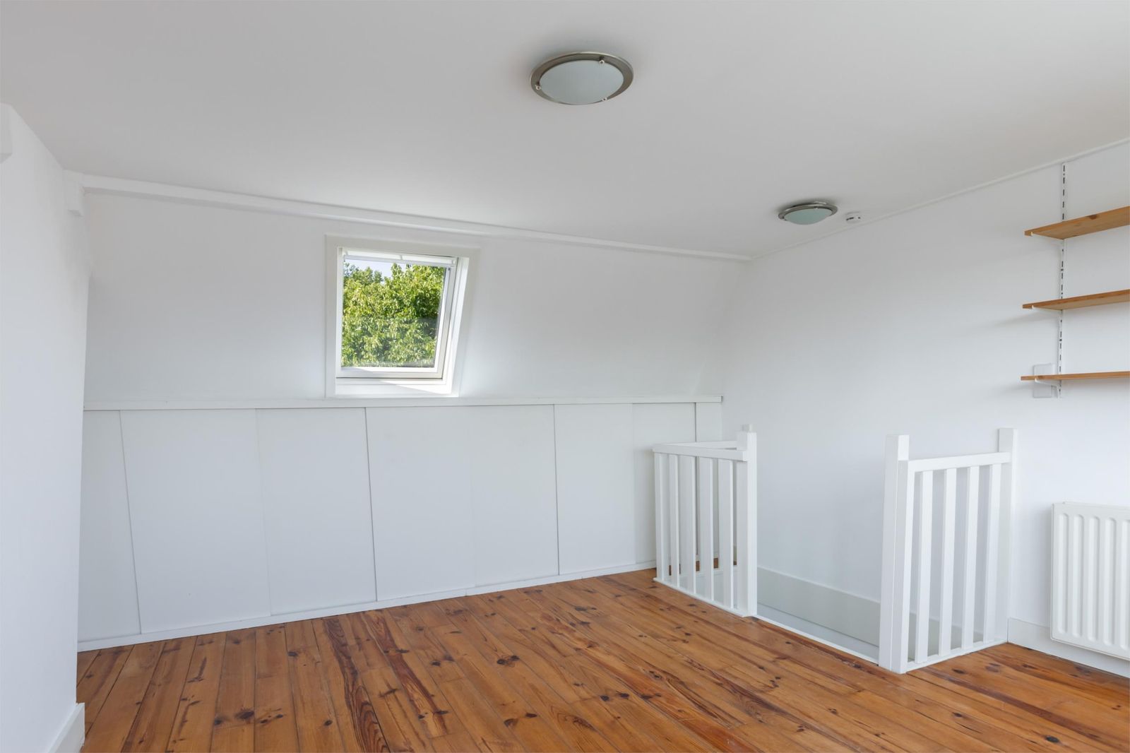 Een lichte en royale zolder met dakkapel over de volle breedte te gebruiken als derde slaapkamer, thuiskantoor, hobby- of atellierruimte. De zolder is geheel voorzien van dubbel glas en veel bergruimte achter de knieschotten.