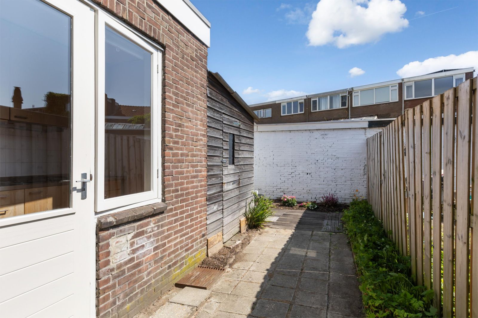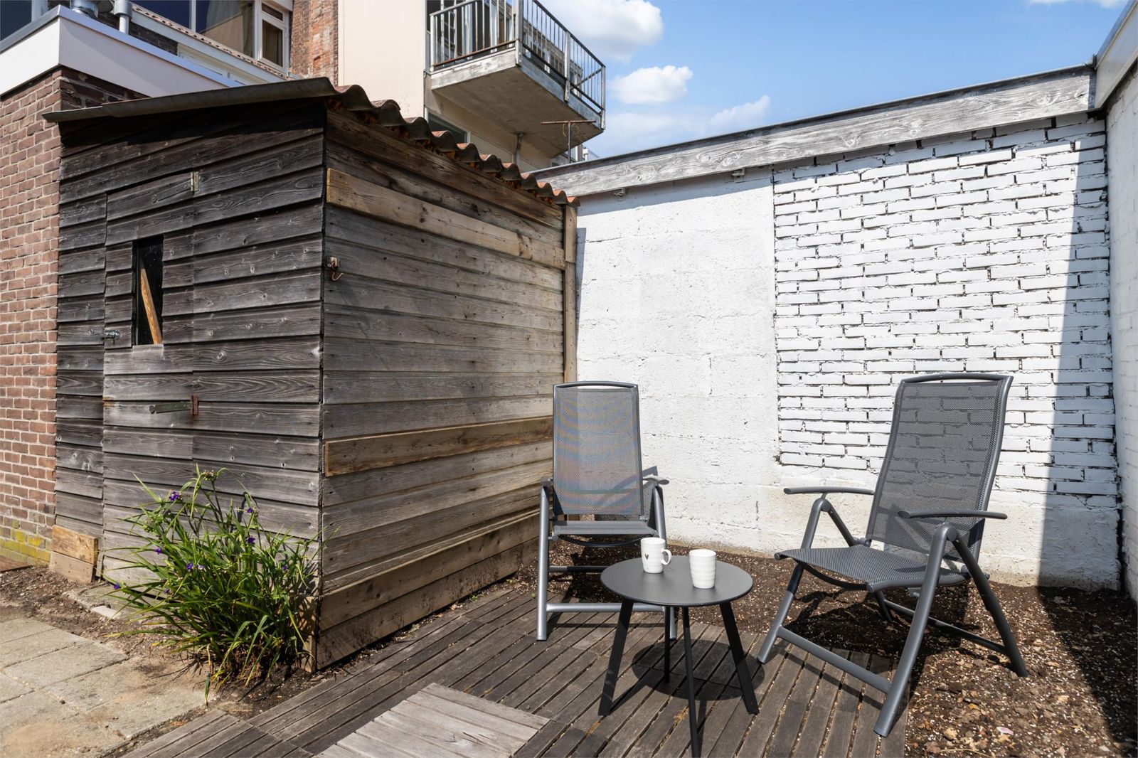 De buitenruimte met achtertuin van ca. 25 m² biedt volop ruimte voor een zithoek en een heerlijk kopje koffie in het zonnetje. De tuin heeft een praktische L-vorm en beschikt over een houten berging. Fietsen kunnen ook in de voortuin worden gestald.