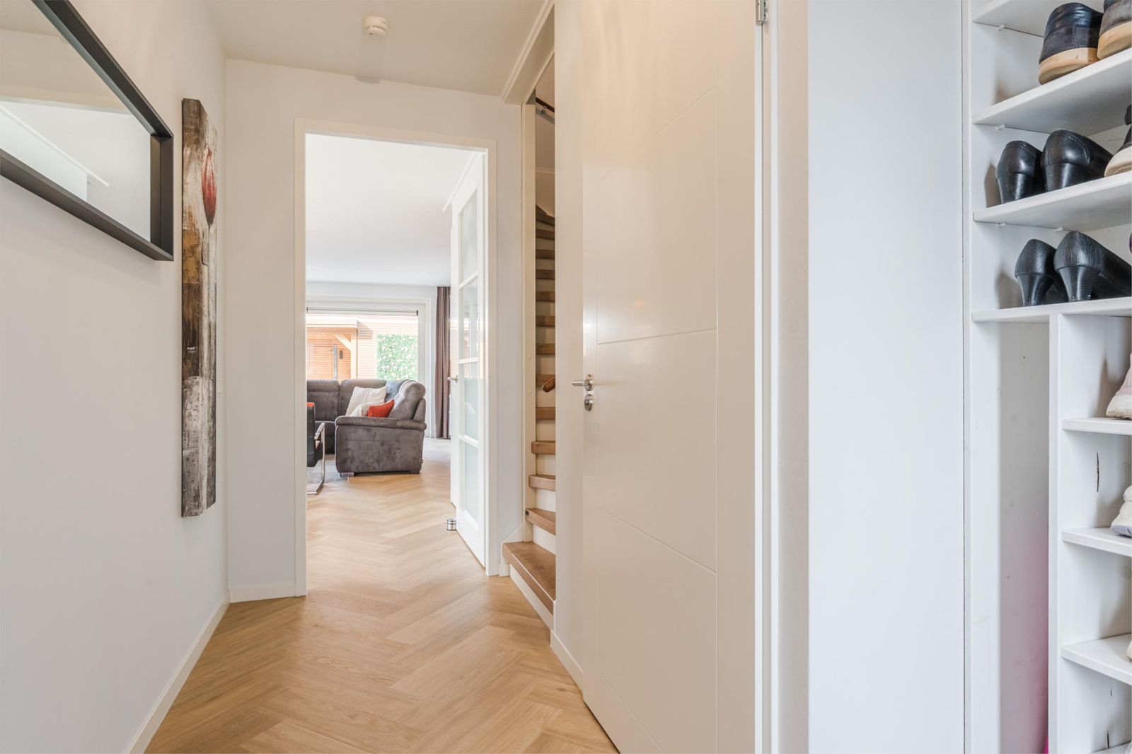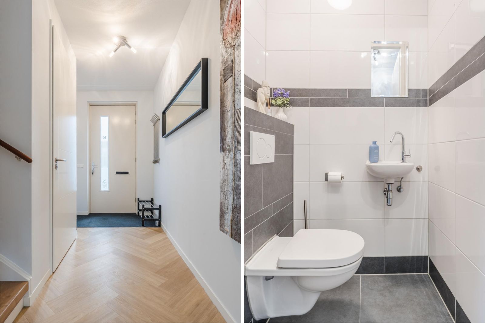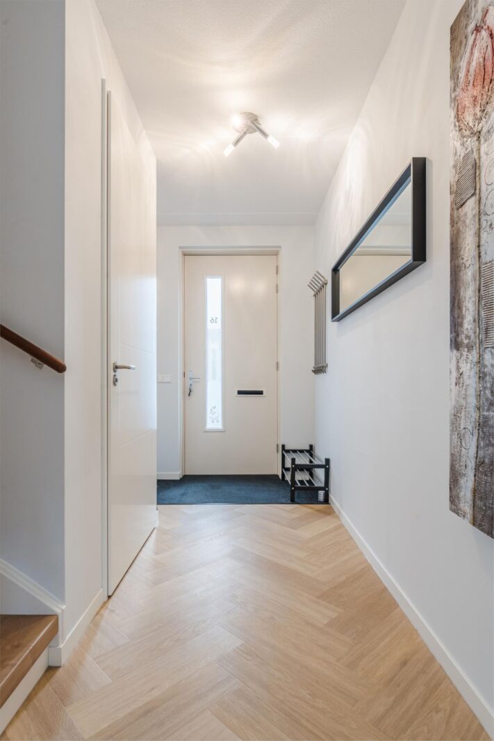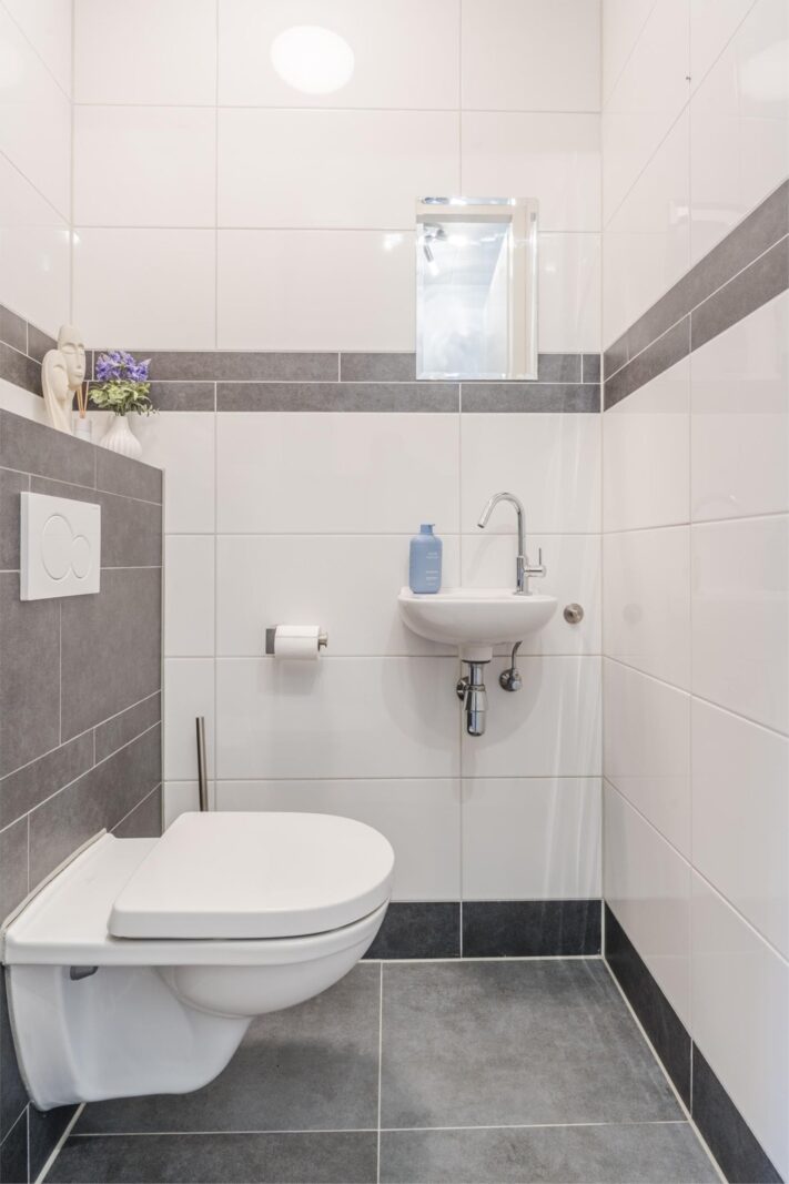Ruime entree met meterkast, moderne toiletruimte (volledig betegeld, met fontein) en ingebouwde schoenenkast. De trap is afgewerkt met Upstairs traptreden voor een stijlvolle en duurzame uitstraling.
