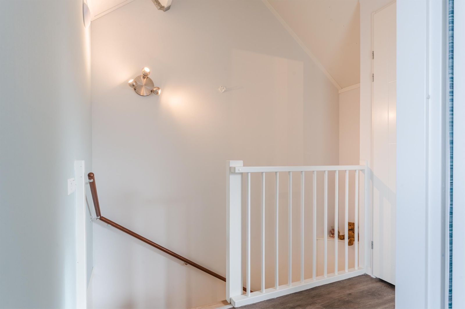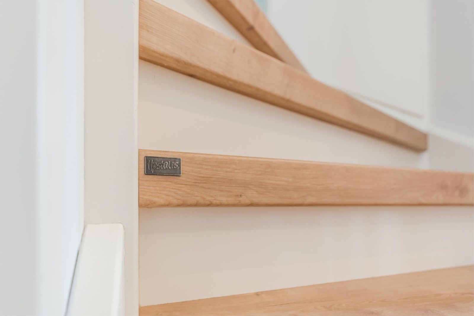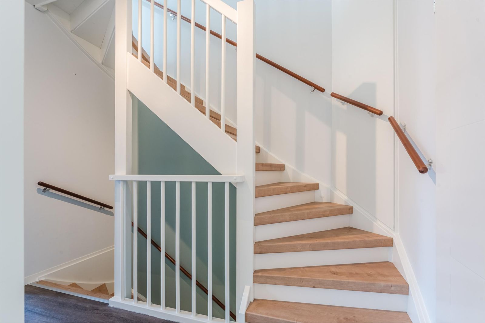 Ruime entree met meterkast, moderne toiletruimte (volledig betegeld, met fontein) en ingebouwde schoenenkast. De trap is afgewerkt met Upstairs traptreden voor een stijlvolle en duurzame uitstraling.