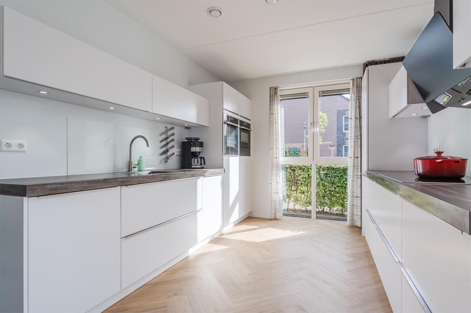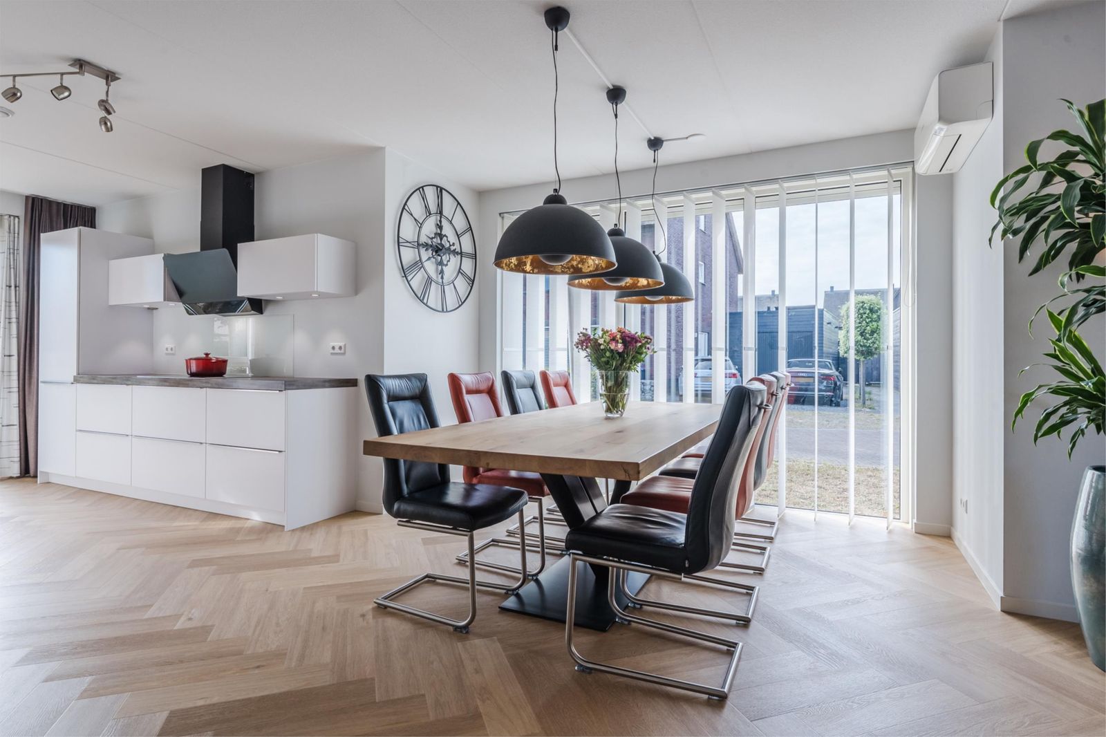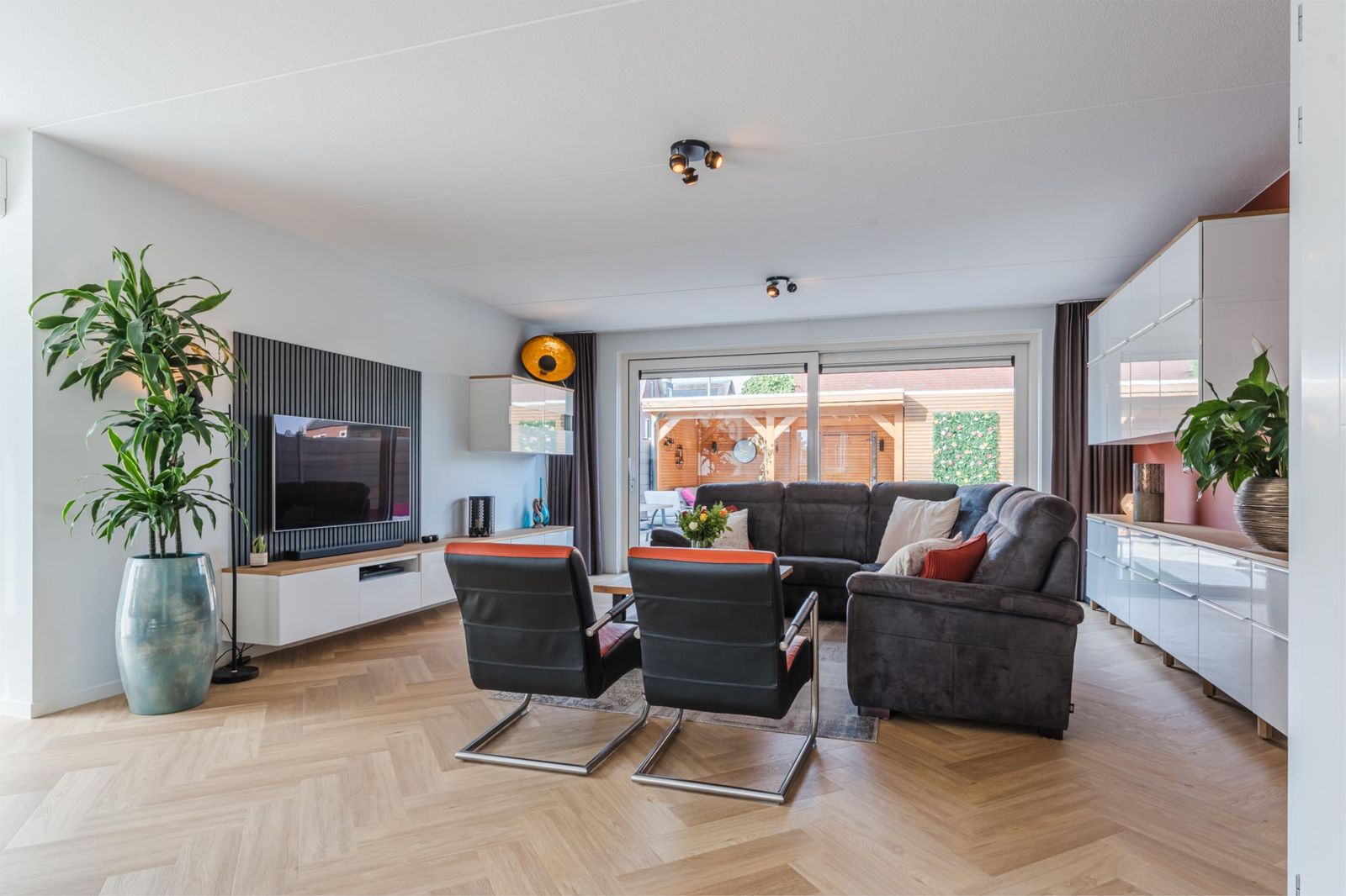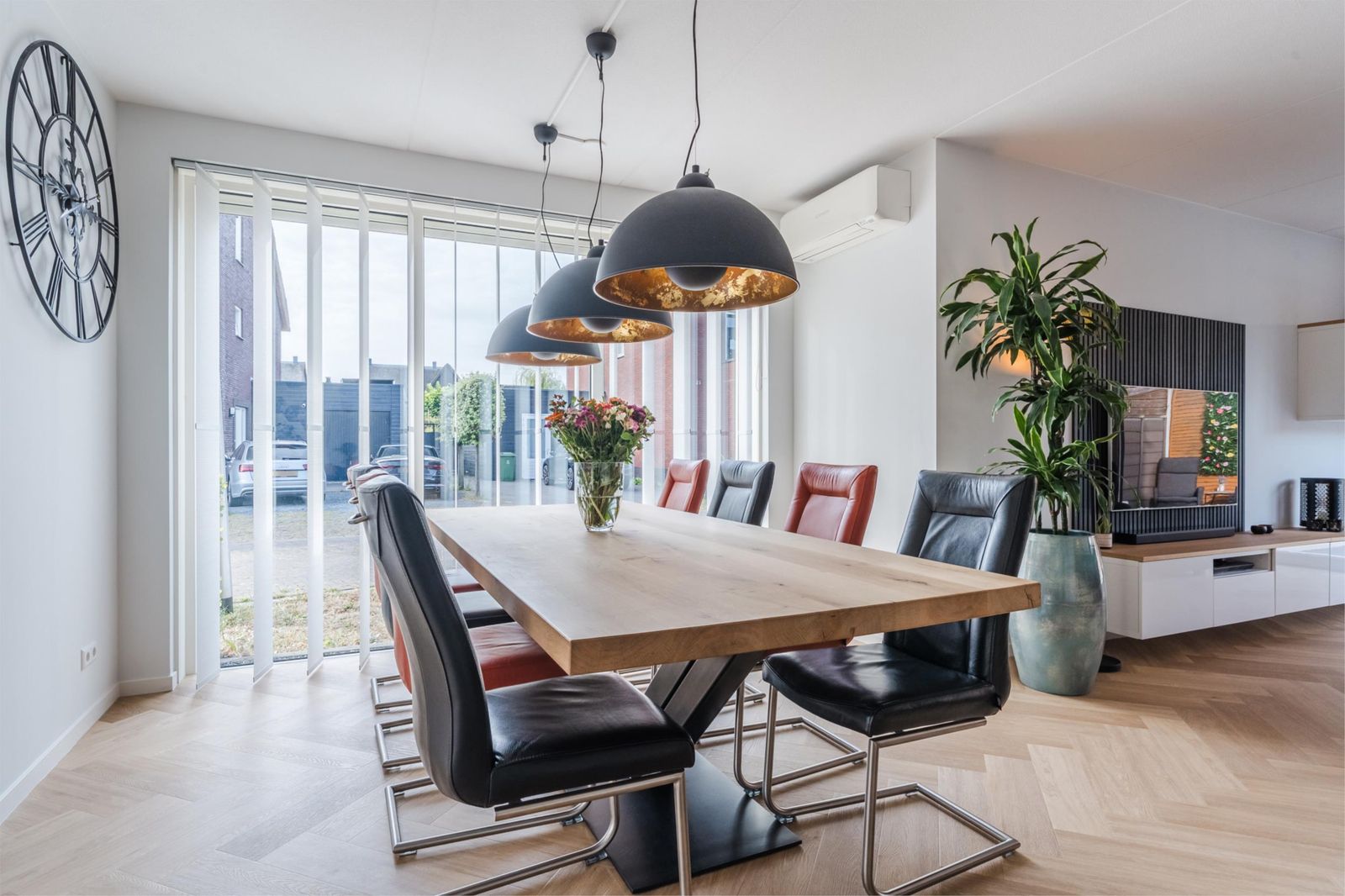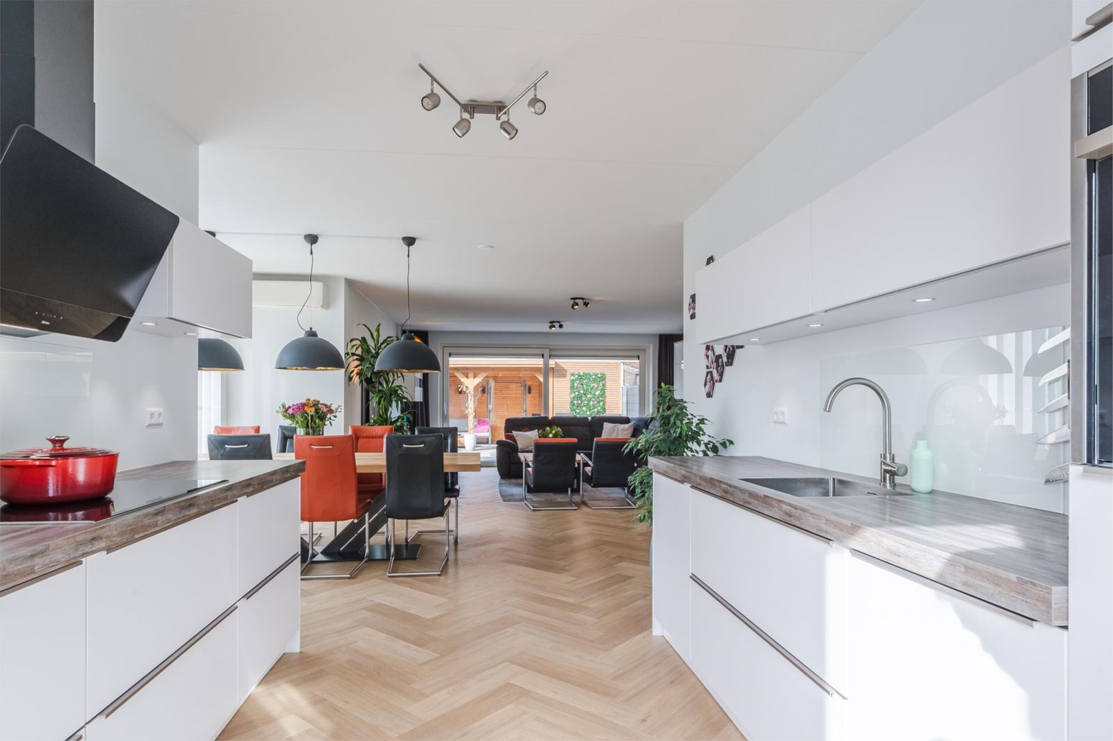 De royale woonkamer is door de uitbouw aan de voor-, zij- én achterzijde uitzonderlijk licht en biedt volop leefruimte voor het hele gezin. Grote raampartijen en de schuifpui naar de tuin zorgen voor een naadloze verbinding tussen binnen en buiten. Een screen aan de zuidzijde biedt comfort op warme dagen. De airconditioning zorgt ook binnen voor een aangenaam klimaat.