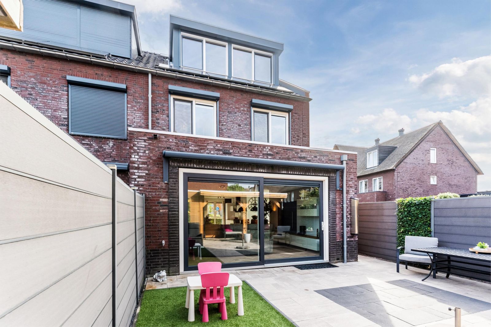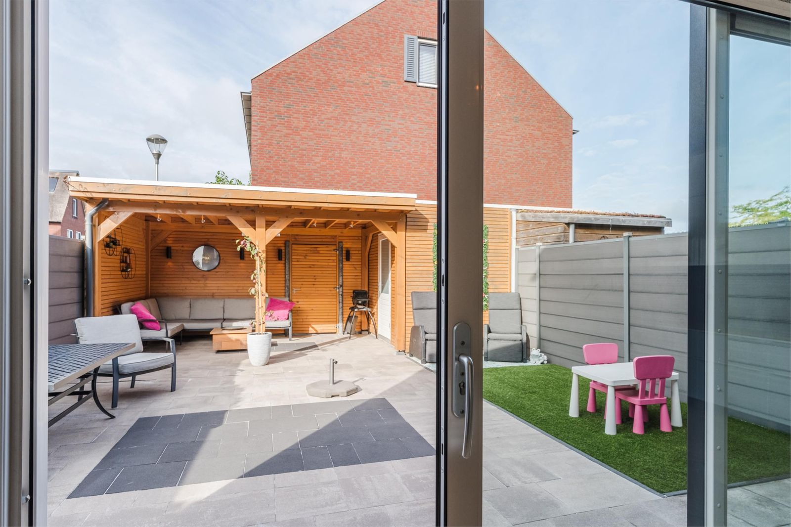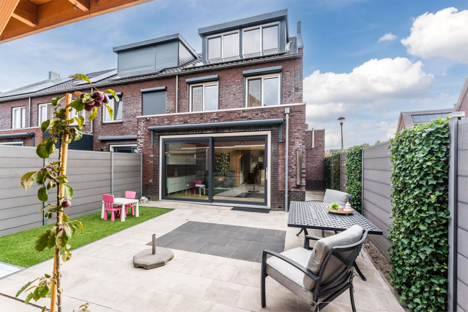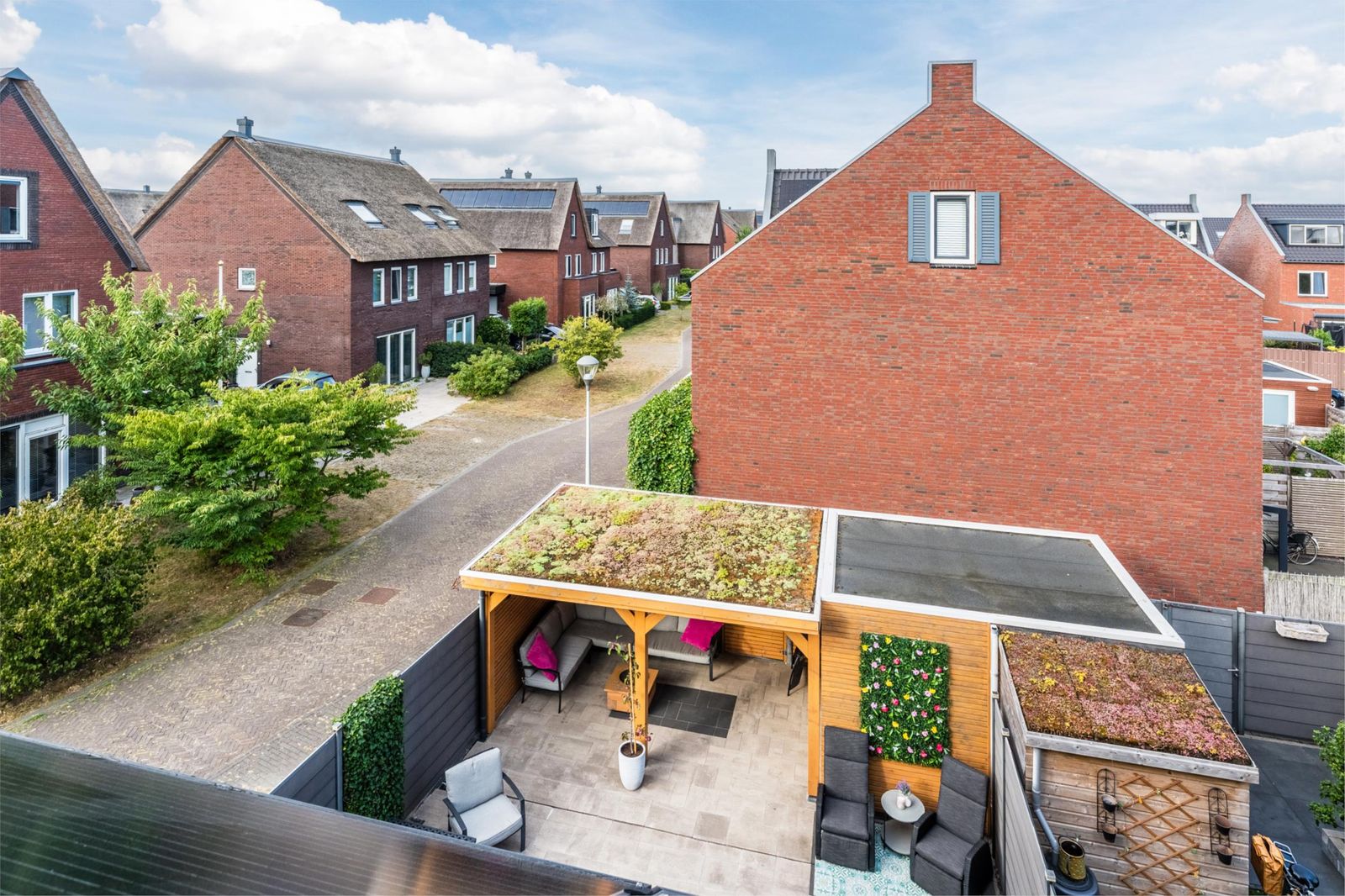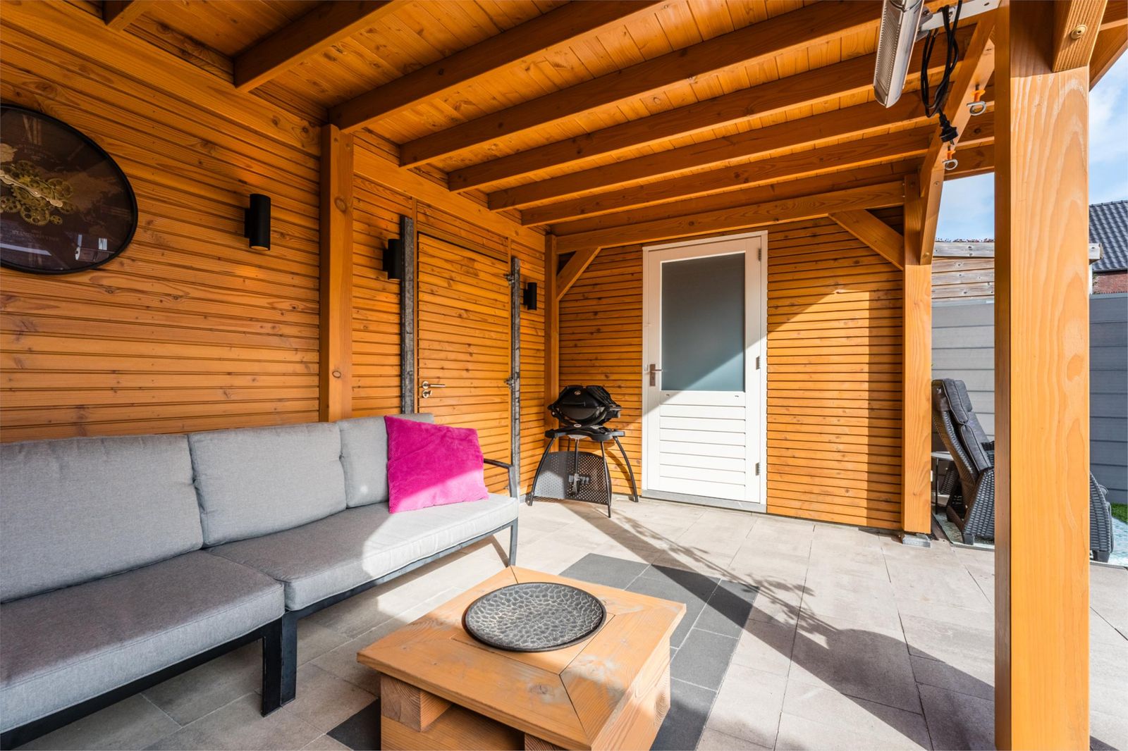 Verder is er een vrijstaande houten berging (met elektra), een zonnescherm, buitenkraan en een handige opstelling voor de kliko’s uit het zicht.
