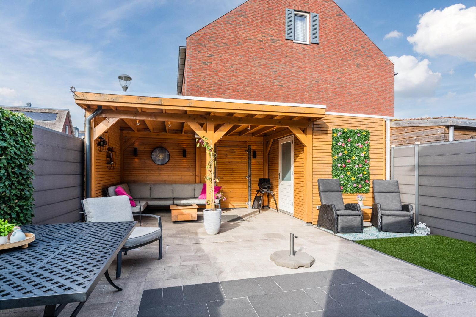 De zonnige achtertuin is gelegen op het zuidwesten en is zorgvuldig aangelegd met sierbestrating, kunstgras en subtiele hemelwaterafvoer. De ruime overkapping van luxe Douglashout met sedumdak biedt beschutting in elk seizoen en vormt een sfeervol verlengstuk van de woonkamer.