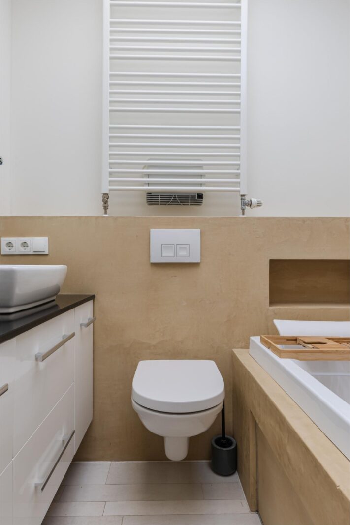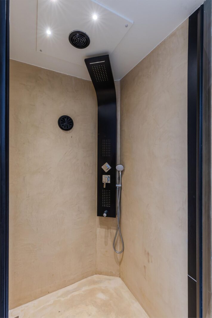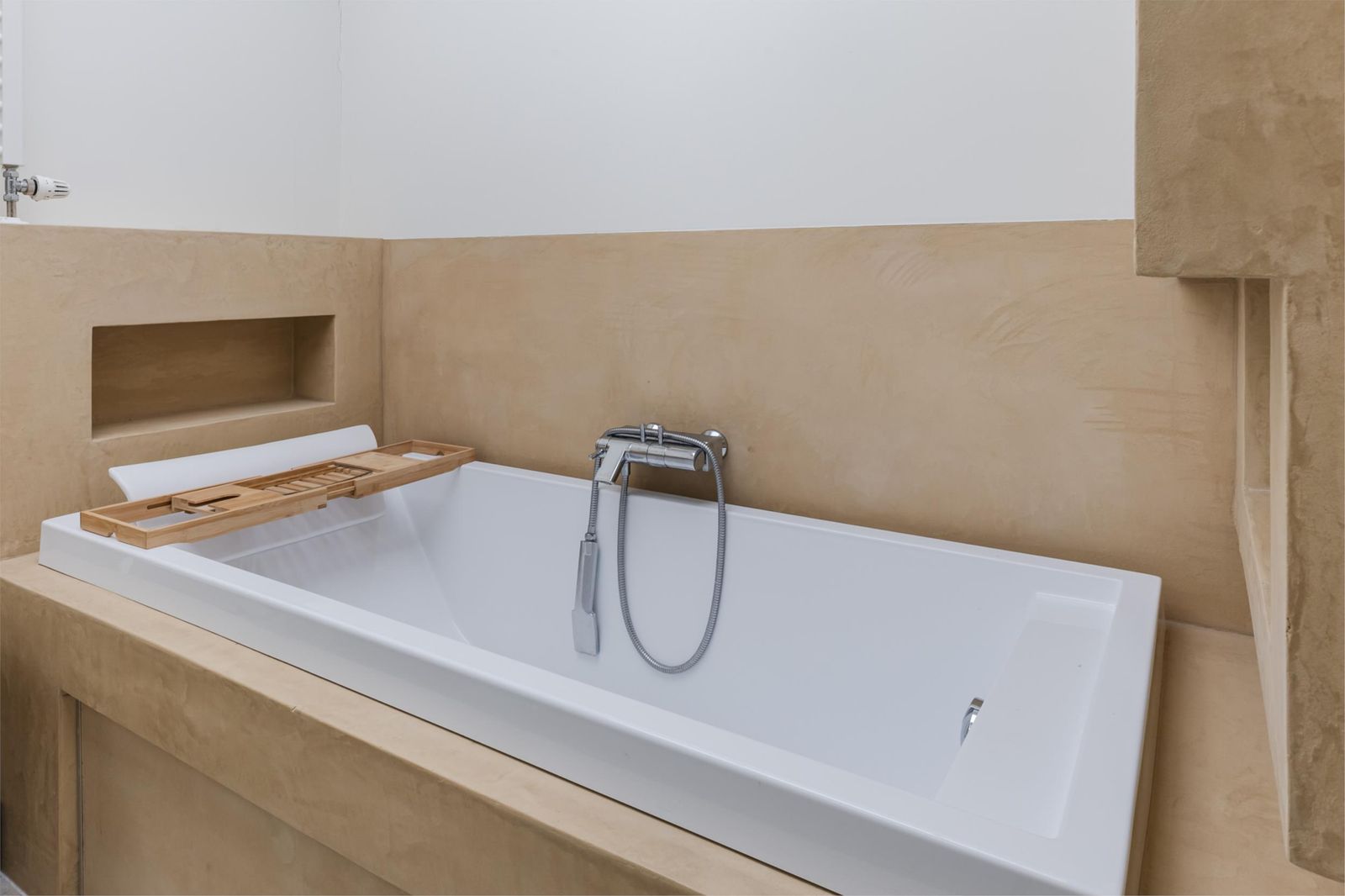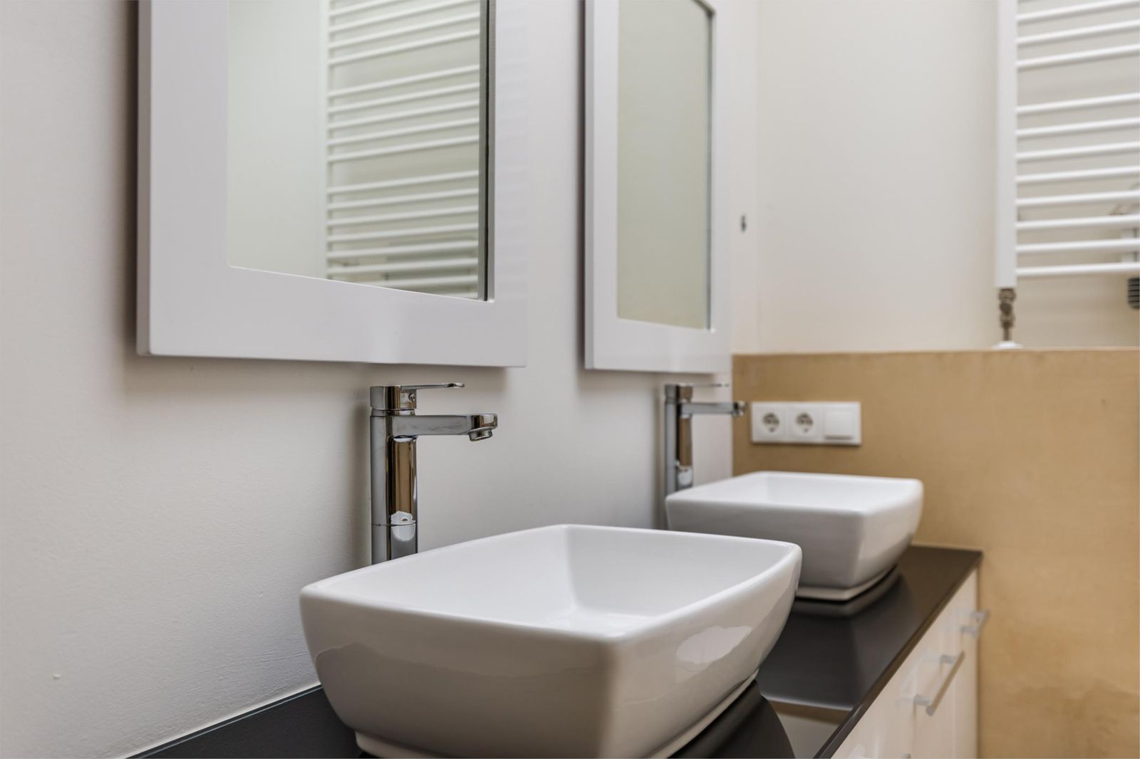 Badkamer; 1aparte douche,1 wc badkamer,1 groot ligbad, dubbele wastafel met 2 kranen en 1 wc gasten buiten de badkamer.