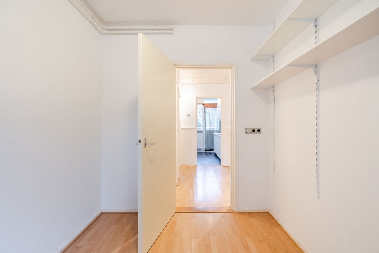 Hal/entree voorzien van laminaatvloer; zonnige woonkamer voorzien van laminaatvloer met vrij uitzicht over een groot grasveld en toegang tot het balkon op de zonzijde; 2 slaapkamers met laminaatvloer en toegang tot balkon; toilet met fonteintje; badkamer met douche en vaste wastafel; dichte keuken met eenvoudig keukenblok en toegang tot het 2e balkon.