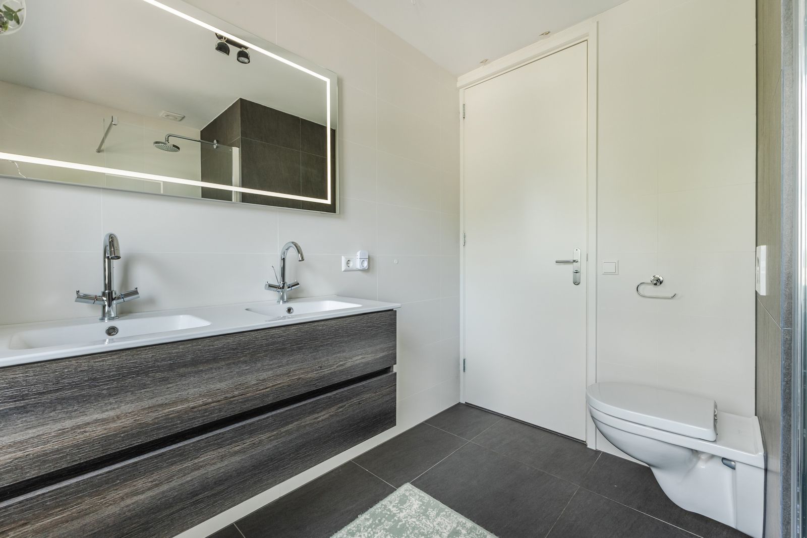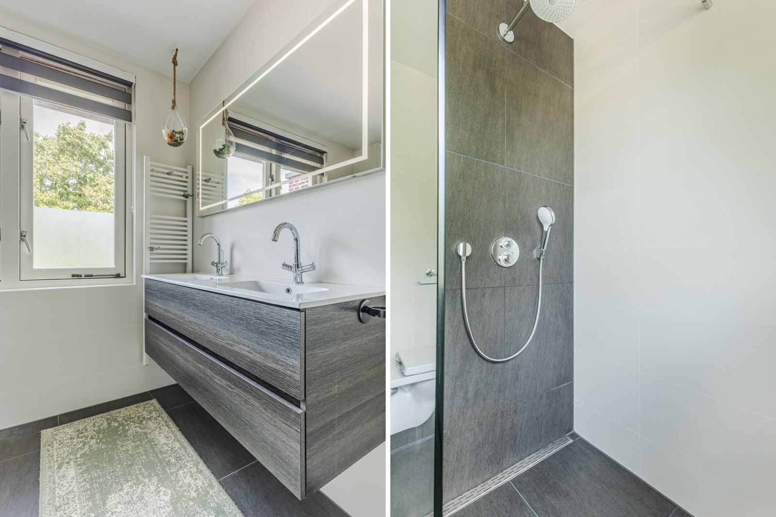Second floor: two bedrooms, including a spacious master at the front, with the option to create an additional room. A second kitchen with washing machine, fridge, and fridge-freezer. Second bathroom with walk-in shower, double vanity, heated mirror with lighting, and a second toilet. Low-maintenance balconies at both front and rear. Technical room with central heating accessible from the hall.