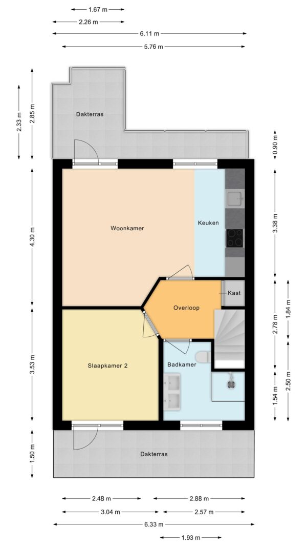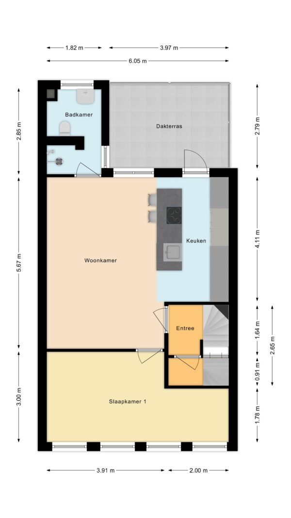 * Afmetingen: ca. 6,05 m x 2,79 m = 16,88 m²