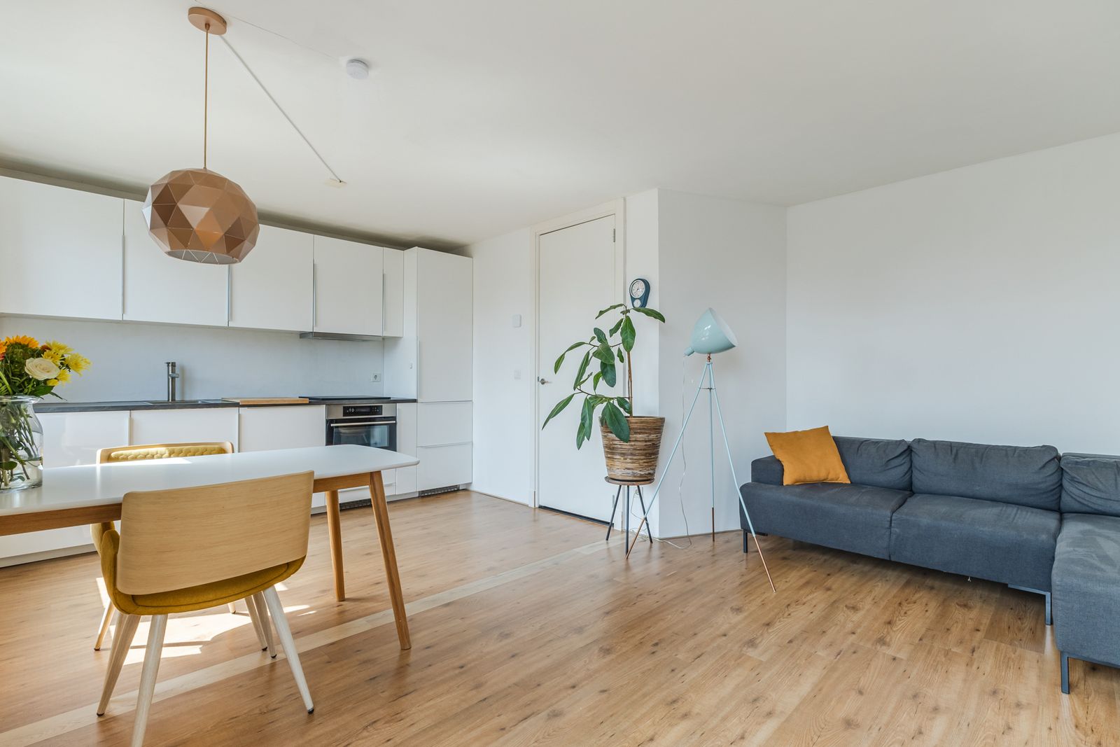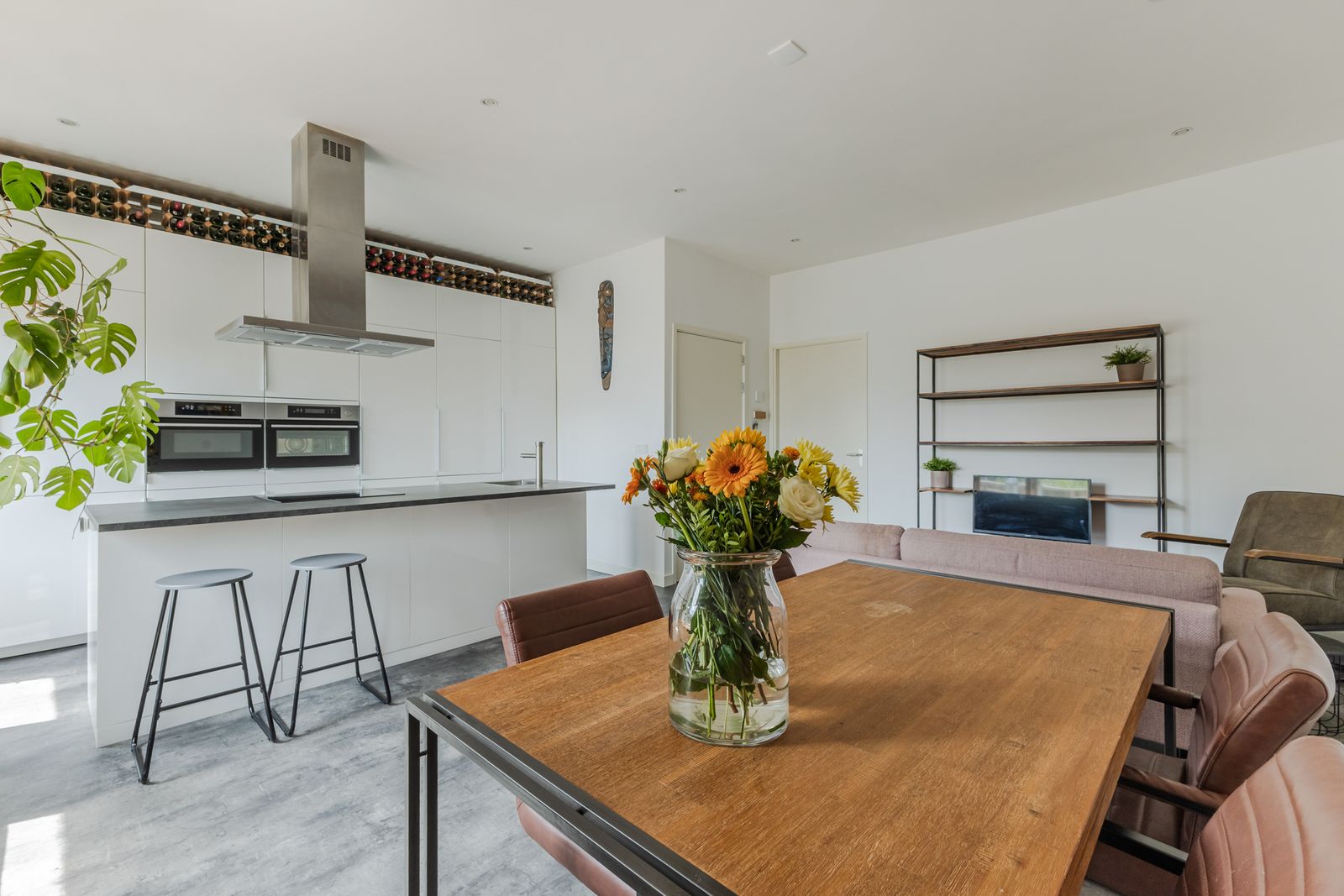 First floor: hall with access to the living room and stairs to the second floor. At the front, a bedroom with large windows and a corner suitable for a home office or hobby space. Removing a partition wall creates a spacious living area. At the rear is a modern open kitchen equipped with induction hob, extractor, dishwasher, washing machine, combi oven, steam oven, and a large cabinet wall. French doors lead to a sunny southeast-facing roof terrace. A neat bathroom with shower, toilet, and washbasin completes this floor.
