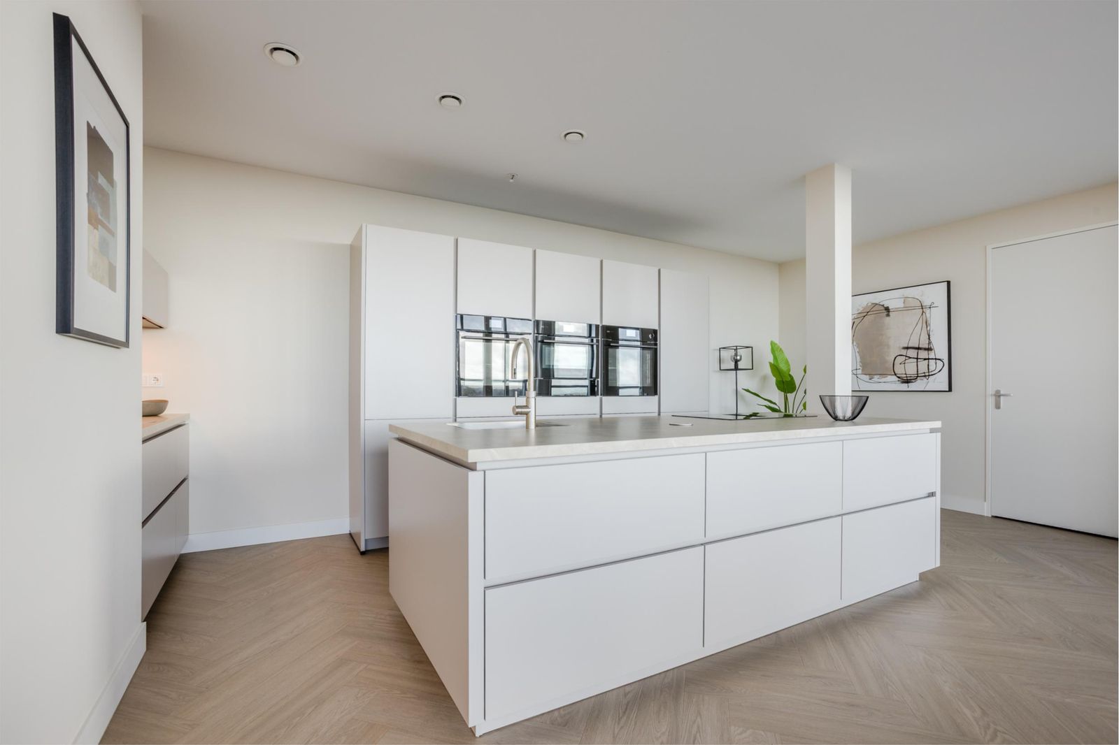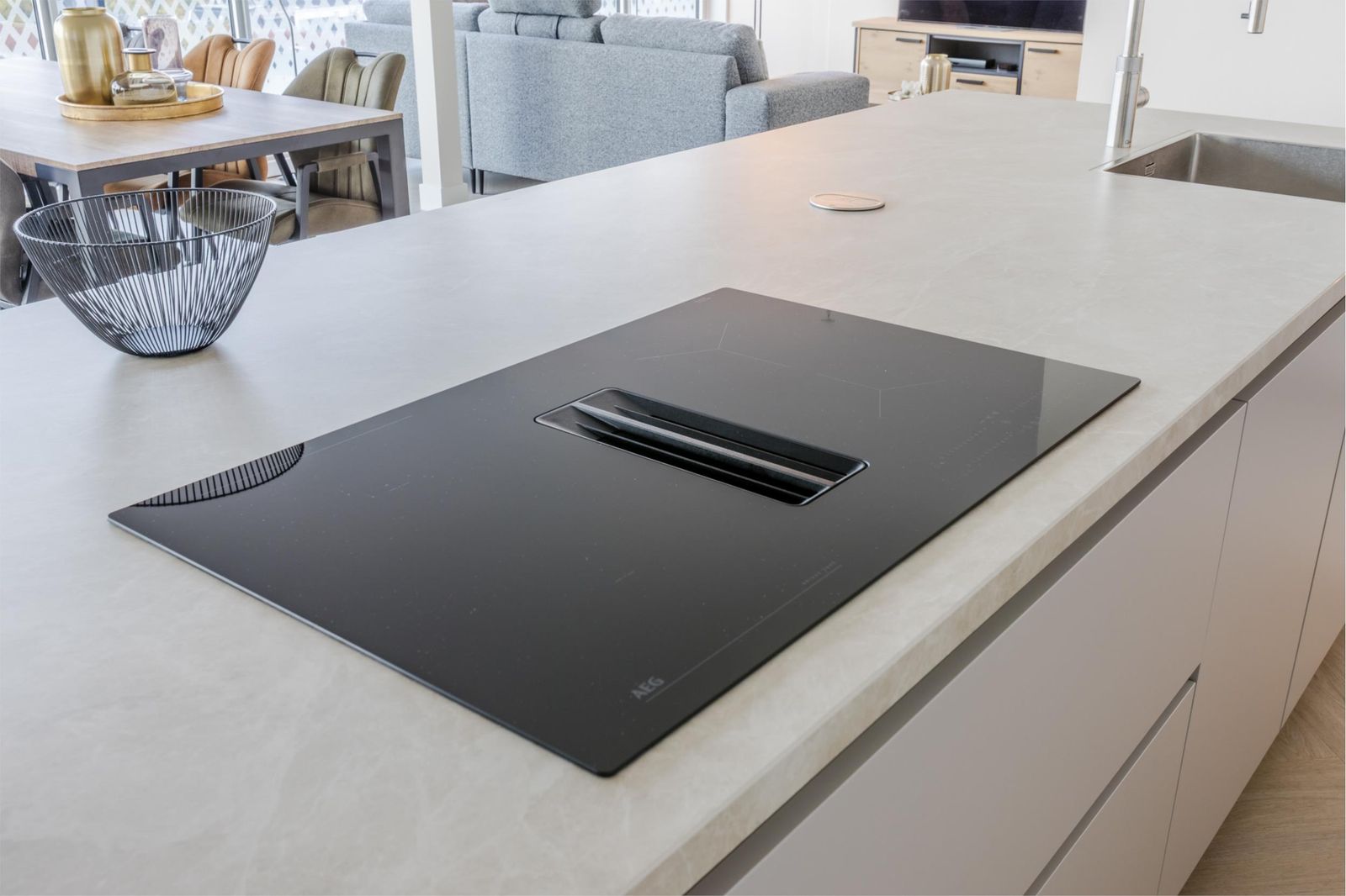 De luxe keuken is uitgevoerd met hoogwaardige inbouwapparatuur. De schuifpui geeft toegang tot het riante overdekte terras met buitenberging.