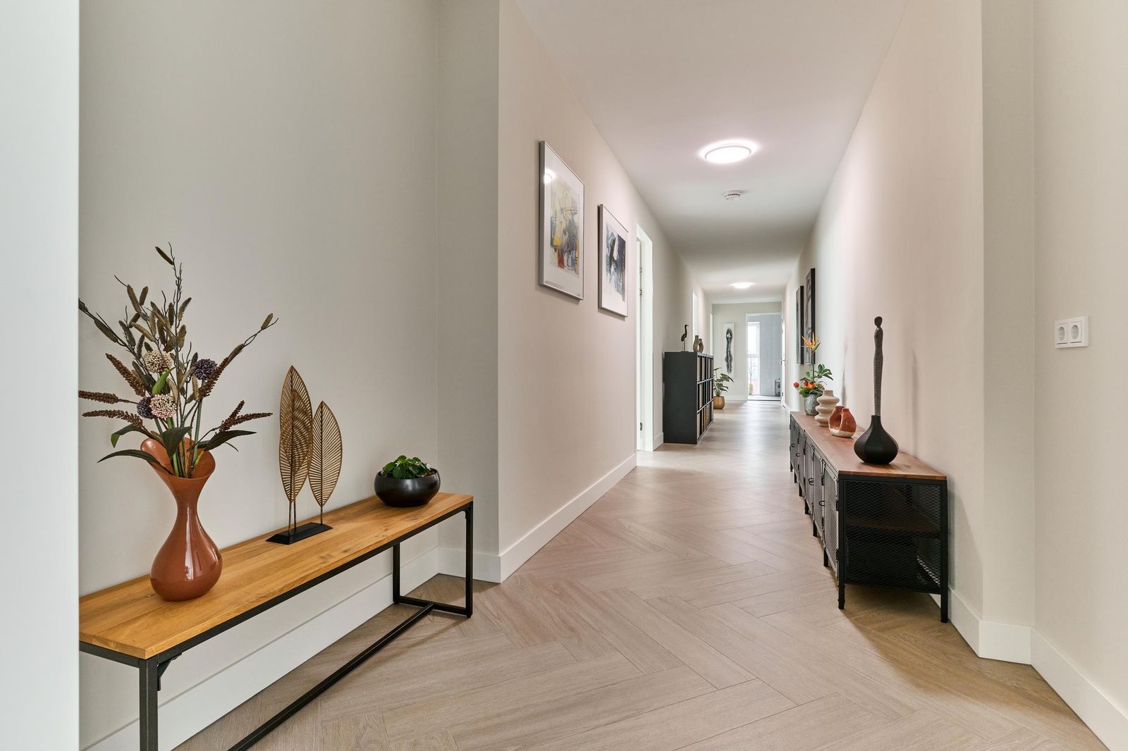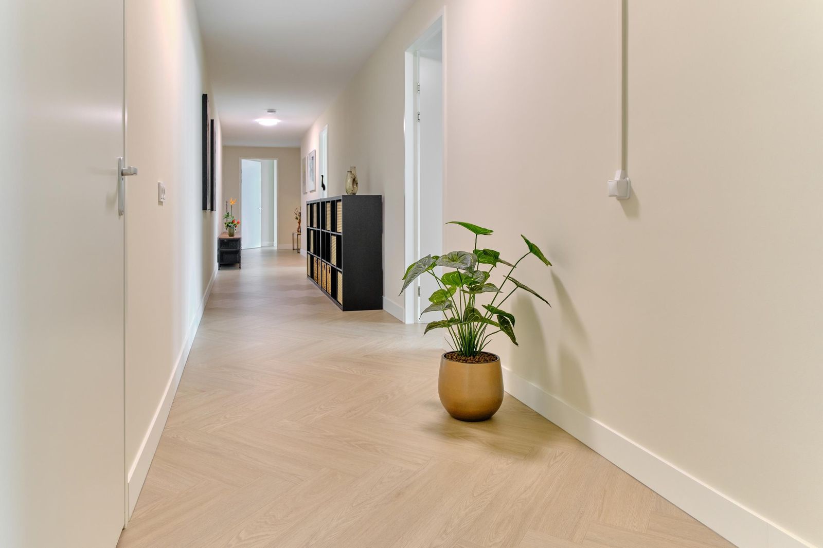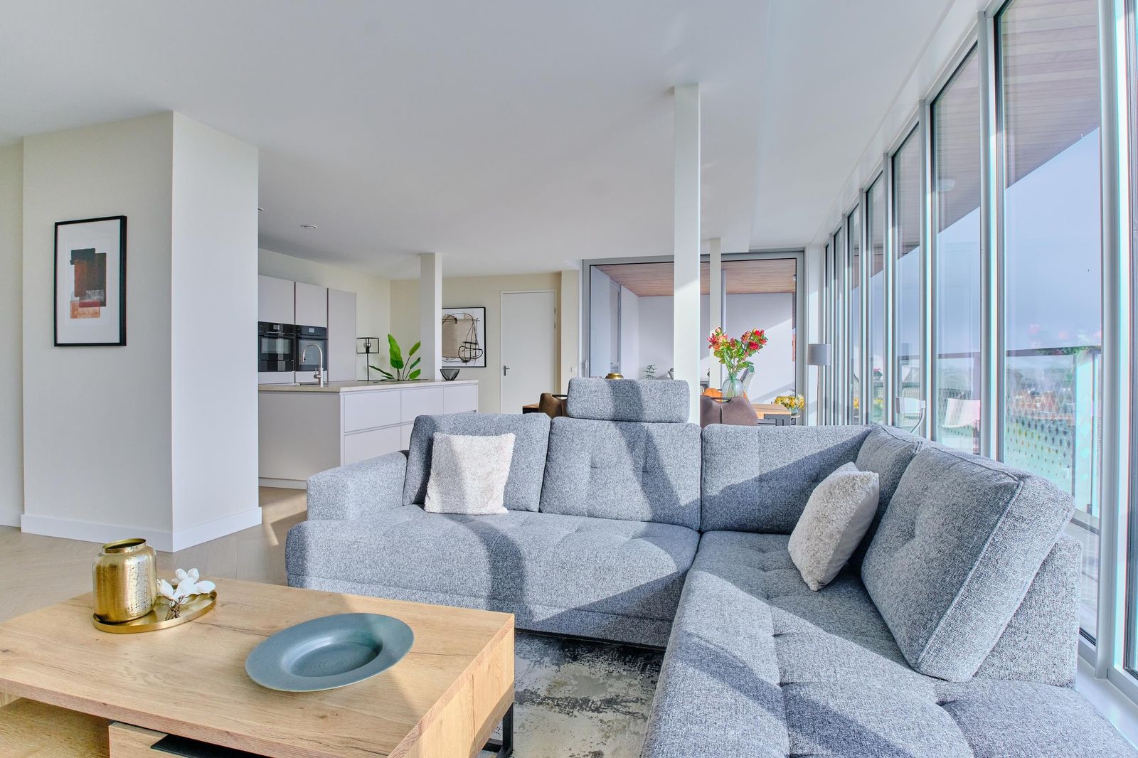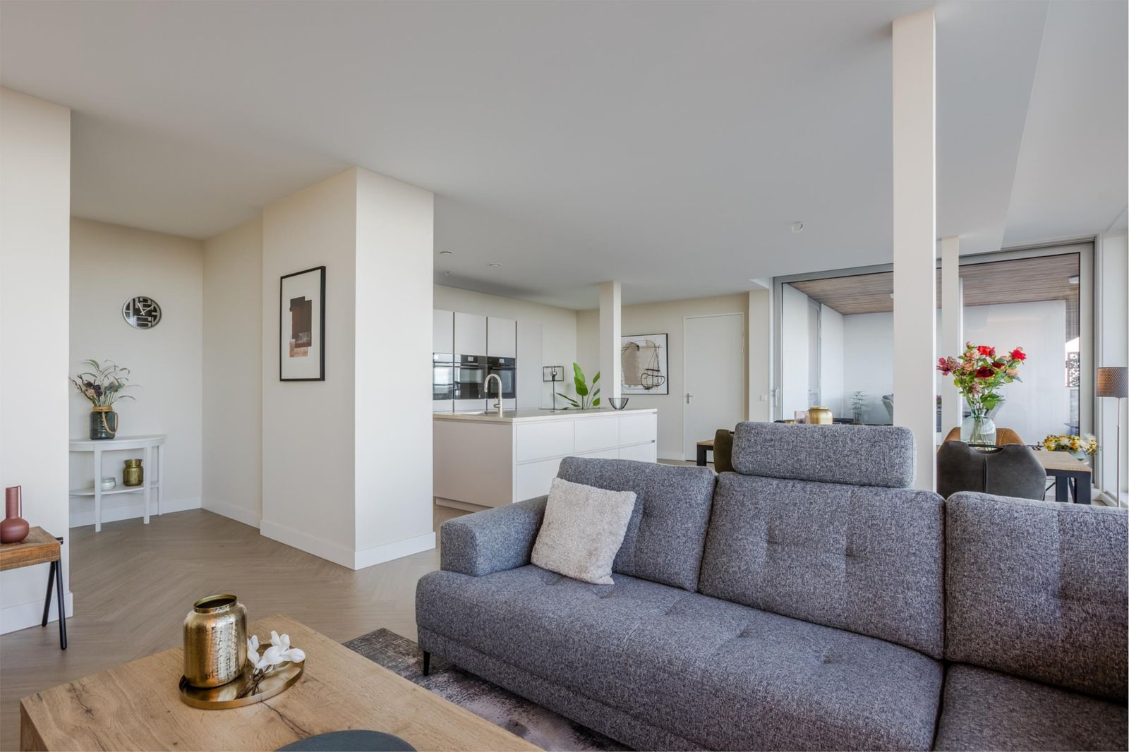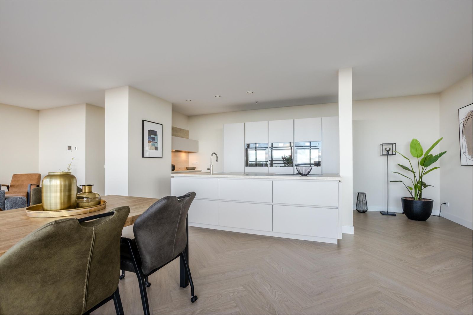 De sfeervolle woonkamer heeft dankzij de grote ramen veel lichtinval en een open keuken met kookeiland, apparatenwand, koffiehoek en inloopkast.