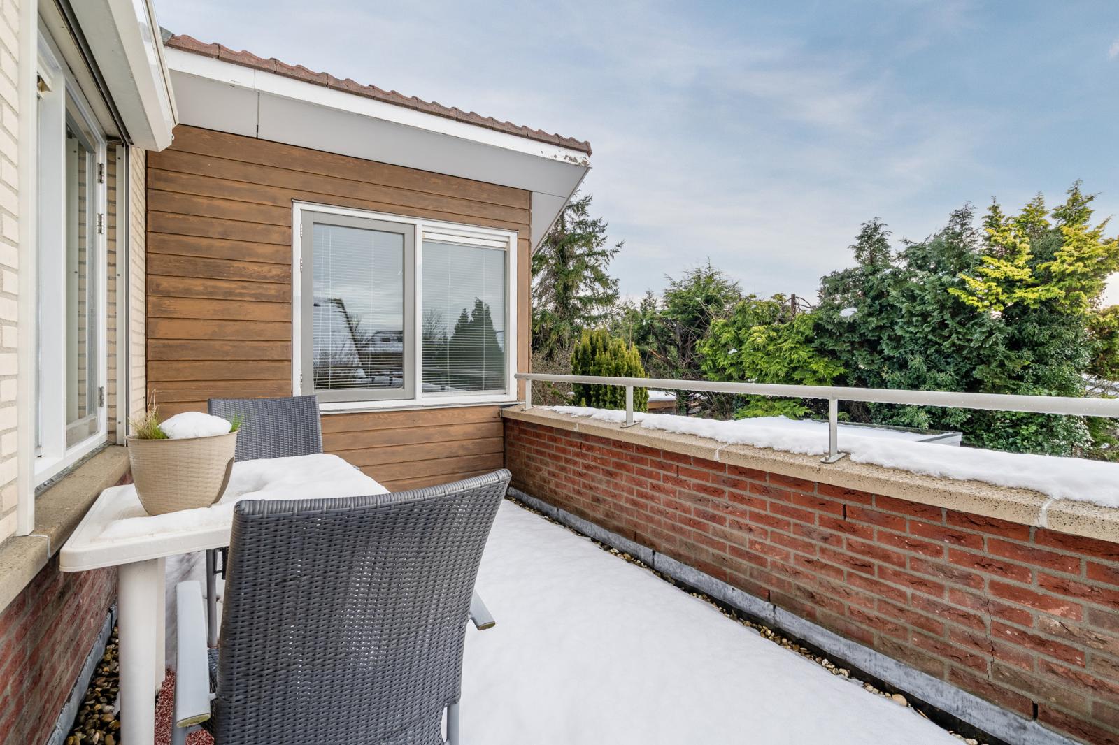Lichte en ruime overloop grenzend aan 4 ruime slaapkamers, separate toiletruimte met hangcloset en fonteintje en een fraaie badkamer met een inloop regendouche, dubbel wastafelmeubel, designradiator en raam voor de natuurlijke ventilatie. Via de slaapkamer aan de voorzijde bereikt u het balkon en via één van de slaapkamer aan de tuinzijde bereikt u het ruime dakterras. Open trap naar tweede verdieping
