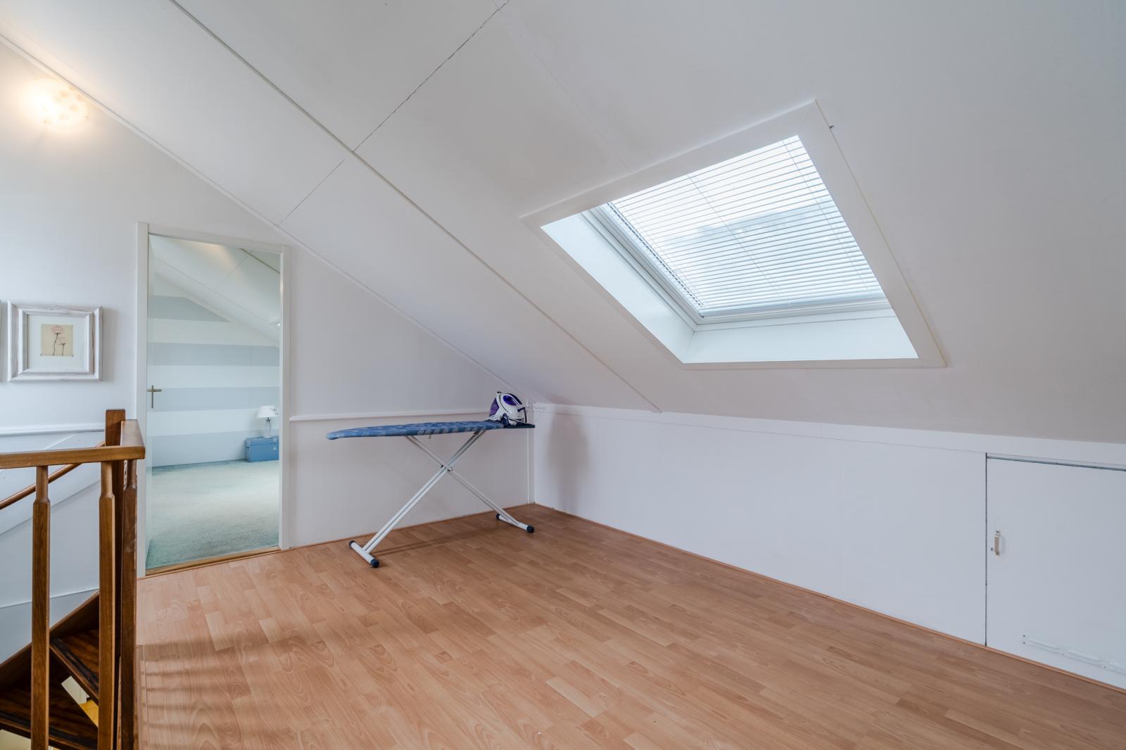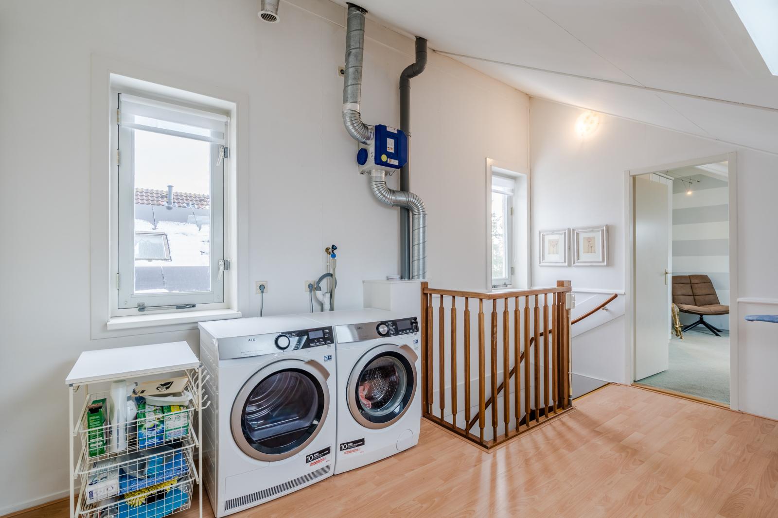 Ruime voorzolder met vaste kastenwand en aansluiting voor de wasmachine, droger en mechanische ventilatie. Deur naar de 5e slaapkamer.