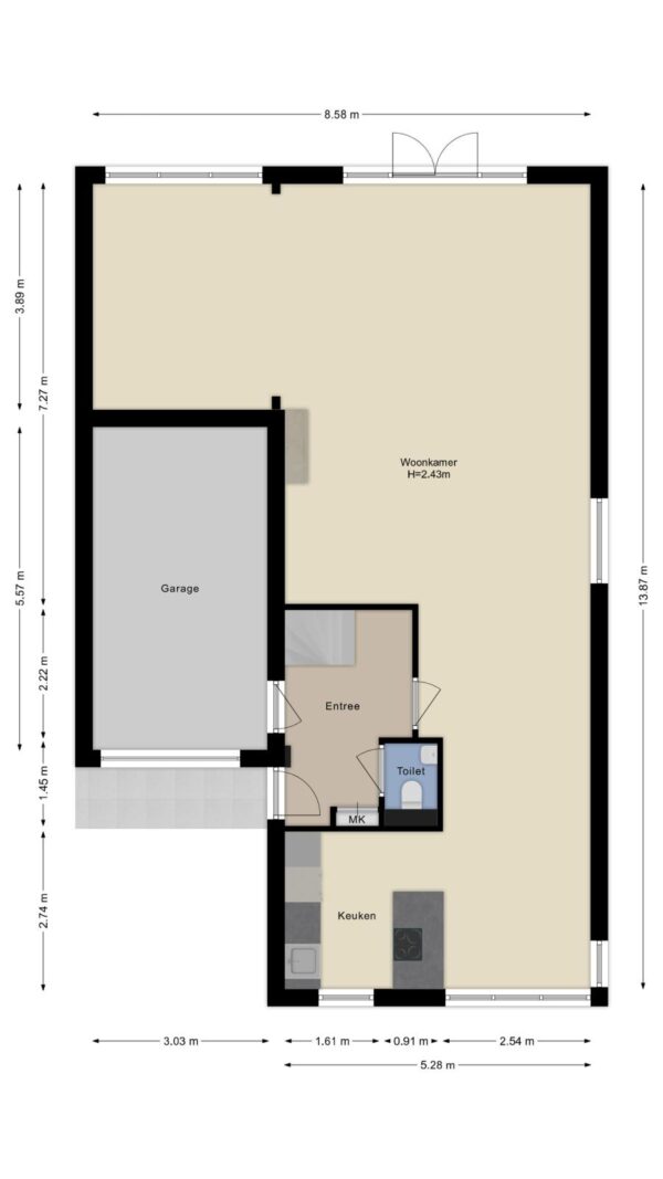 Entree, garderobe, meterkast (stadsverwarming en glasvezel aanwezig), toiletruimte met hangcloset en fonteintje, open trap naar eerste verdieping. Deur naar de garage met voorbereiding voor het maken van een badkamer. Vanuit de hal bereikt u de royale woonkamer met twee openslaande deuren naar de tuin en een ruime eetkamer (eventueel om te bouwen als slaapkamer). De luxe keuken is straat gericht en voorzien van een kookeiland met bar, inductiekookplaat, afzuigkap, vaatwasser, oven, magnetron, koel/vries combinatie en een Quooker kraan. De tuin is op het zuiden gelegen en voorzien van een overkapping, berging en zij-ingang. Parkeren kunt u met twee auto's op eigen terrein.
