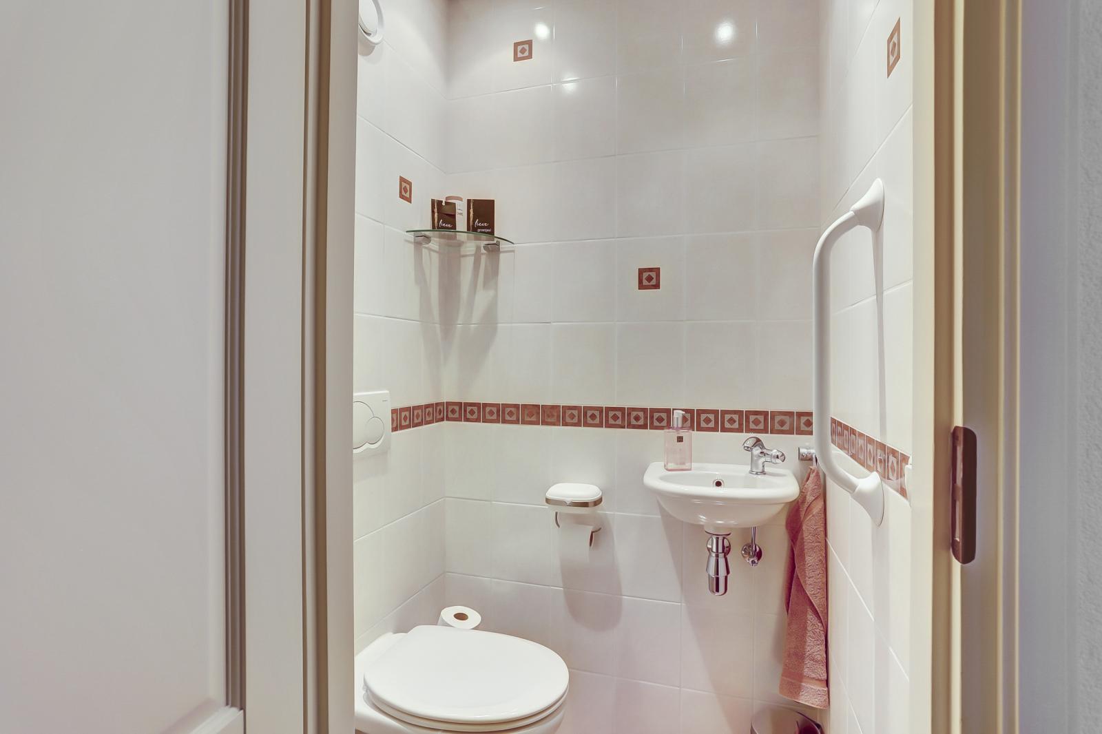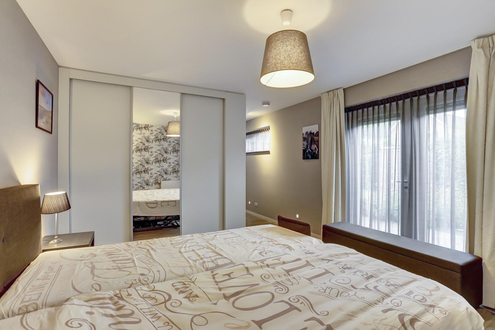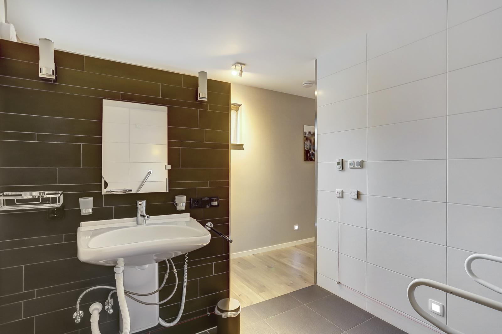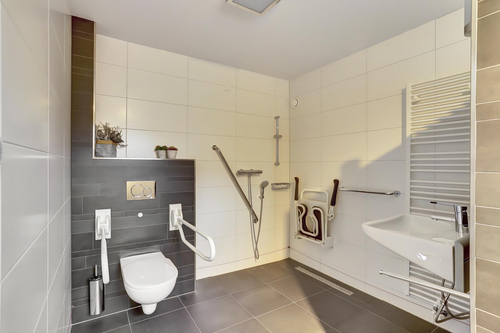 In de aanbouw bevindt zich een ruime slaapkamer met vaste kastenwand en een badkamer die voldoet aan de WMO-eisen, met o.a. een hoog-laag wastafel, toilet met toiletsteunen en de ruimte is geschikt voor het gebruik van een tillift.