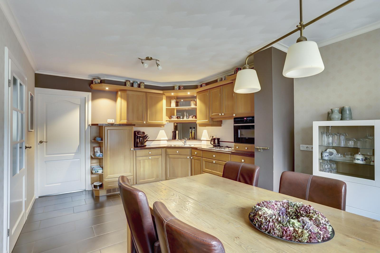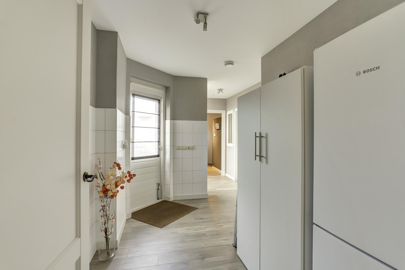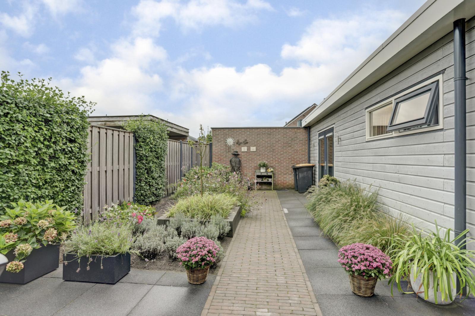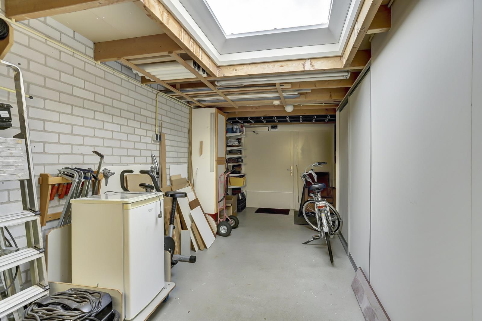 Via de hal is er toegang tot de garage met lichtkoepel, spoelbak, vaste kastenwand en elektra. Ook komt u uit in de fraai aangelegde tuin met buitenkraan en stroompunt.