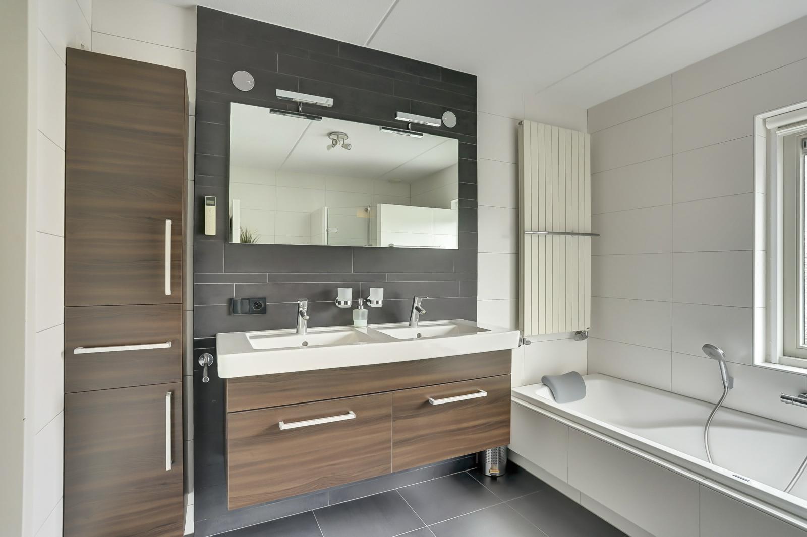 Overloop met toegang tot drie slaapkamers en een complete badkamer voorzien van vloerverwarming, dubbele wastafel, douche, ligbad, toilet en aansluiting voor de wasmachine en droger.